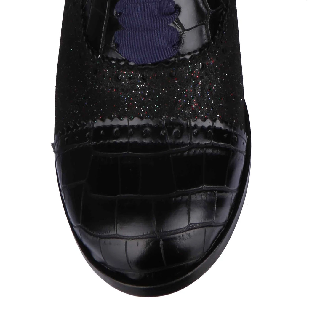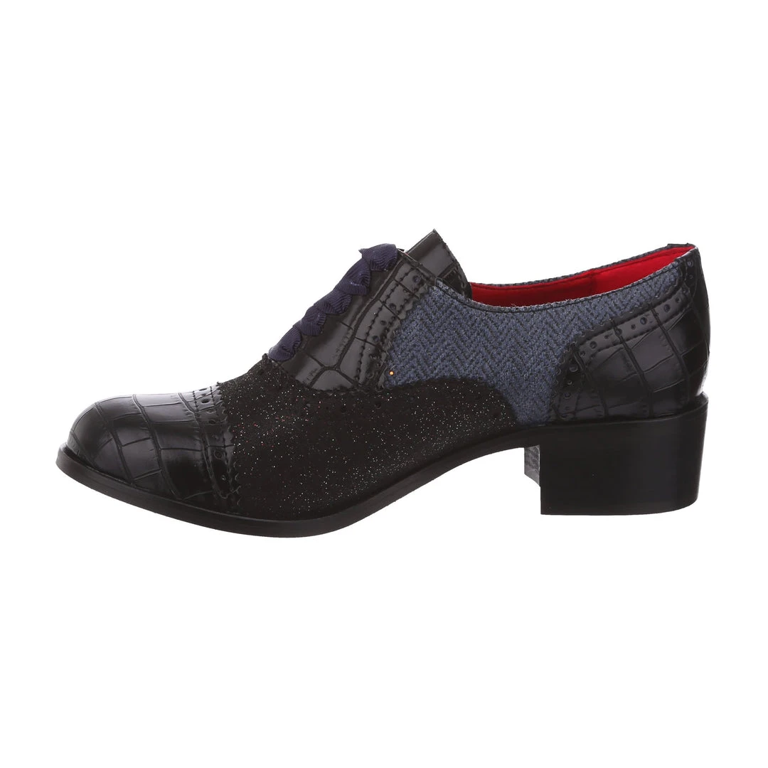 Spruce up your winter wardrobe with these beauties! Inspired by traditional Oxford lace up shoes, and given our IC treatment to make them extra cute! Luxurious herringbone and glitter are combined with a low heel to make these practical, stylish and adorable! The perfect addition to any cosy wardrobe – great with warm tights or fun socks!