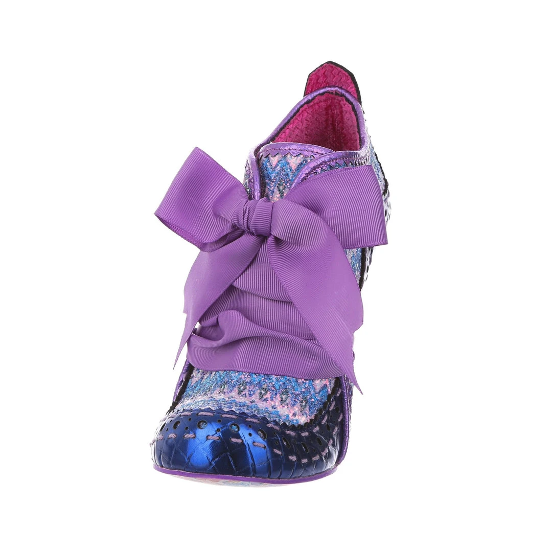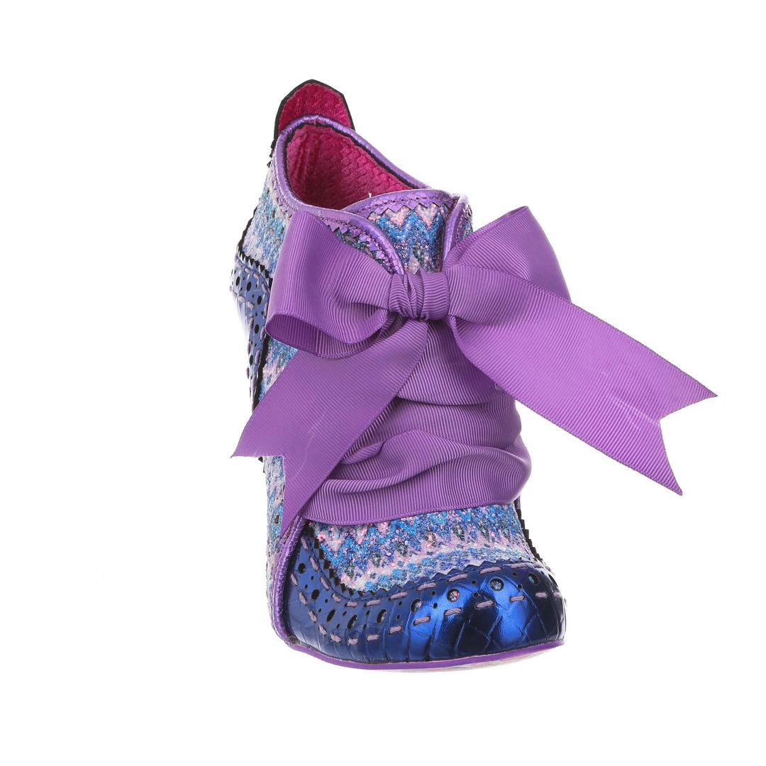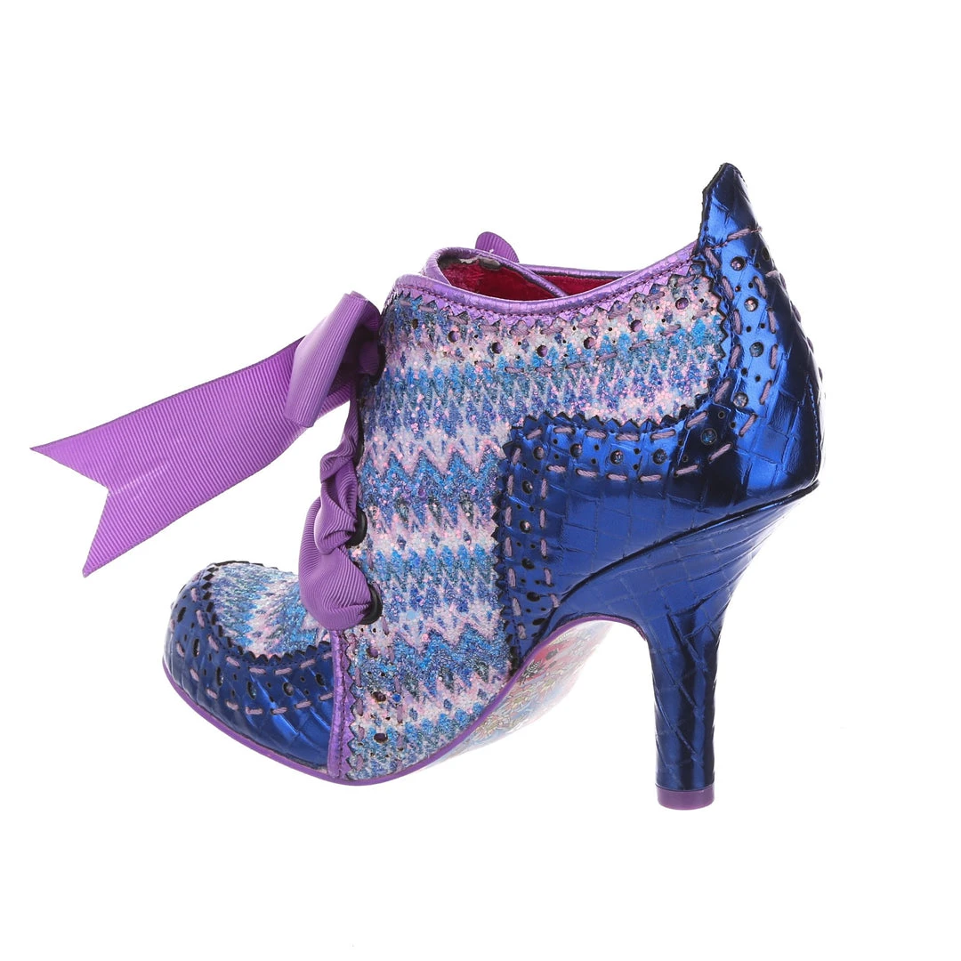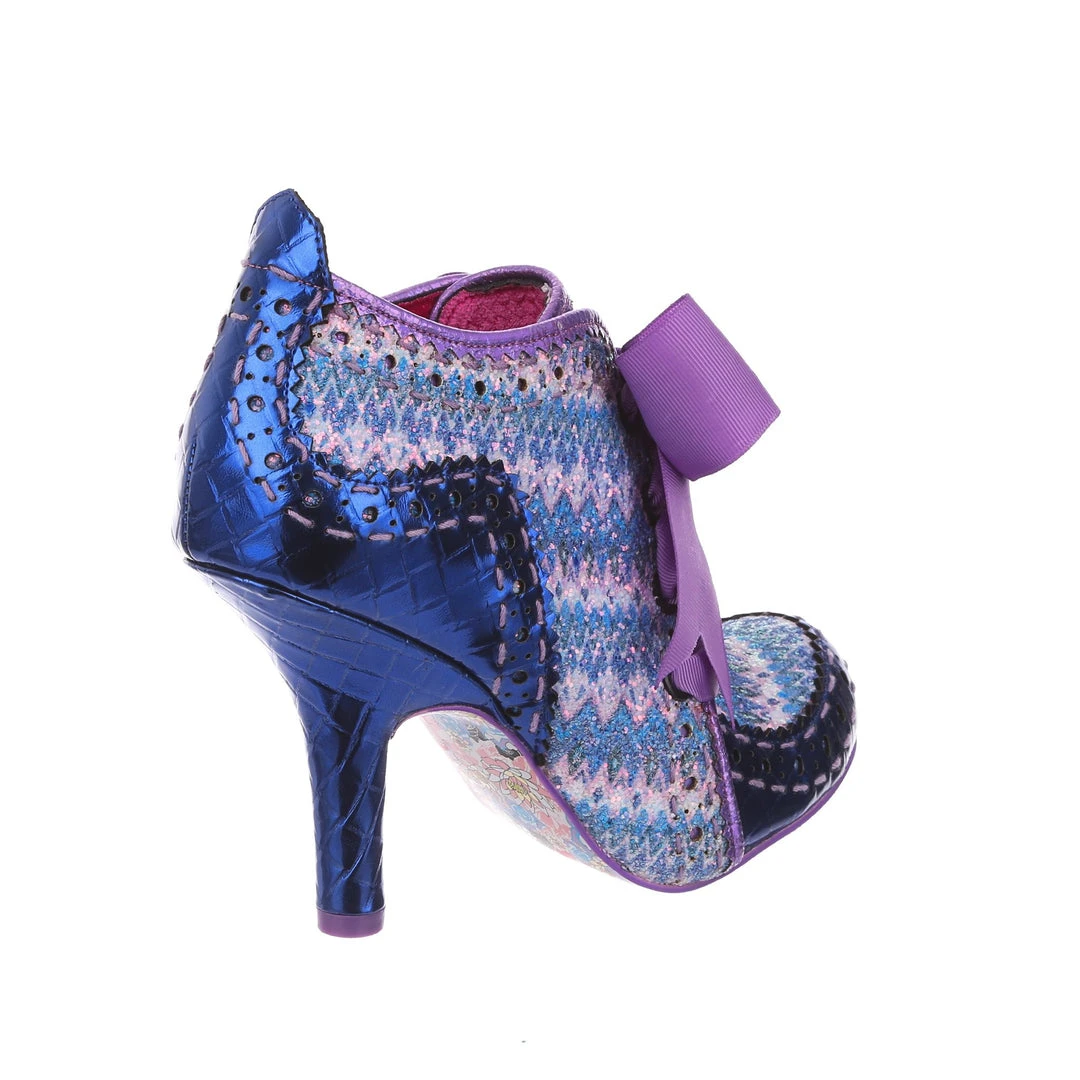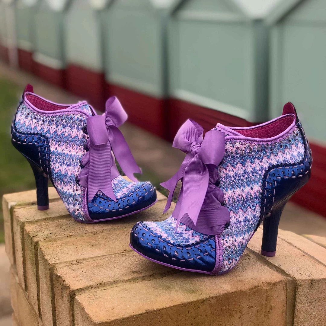 Lace up something fabulous! Our ever popular high heeled ankle boot with a vintage Edwardian feel is back this season, and is bright, beautiful and bold! A striking woven textile of blue and purple tones is paired with a metallic indigo on the toe and heel, creating an eye catching and gorgeous final colour palette, all tied together with the statement plum grosgrain ribbon lace! Perfect to pair with fun tights or have peeking out from your most snazzy trousers – add them to your life today!