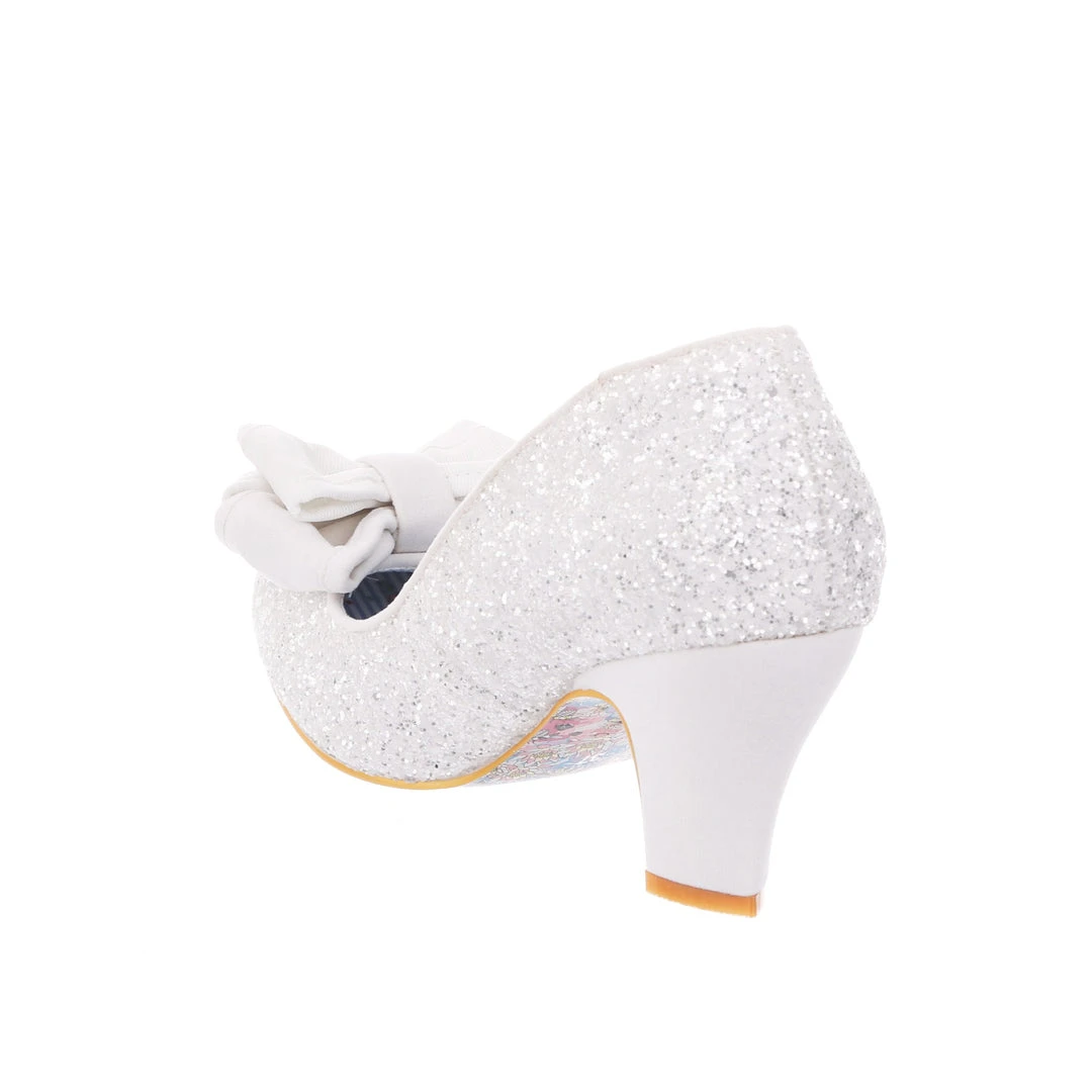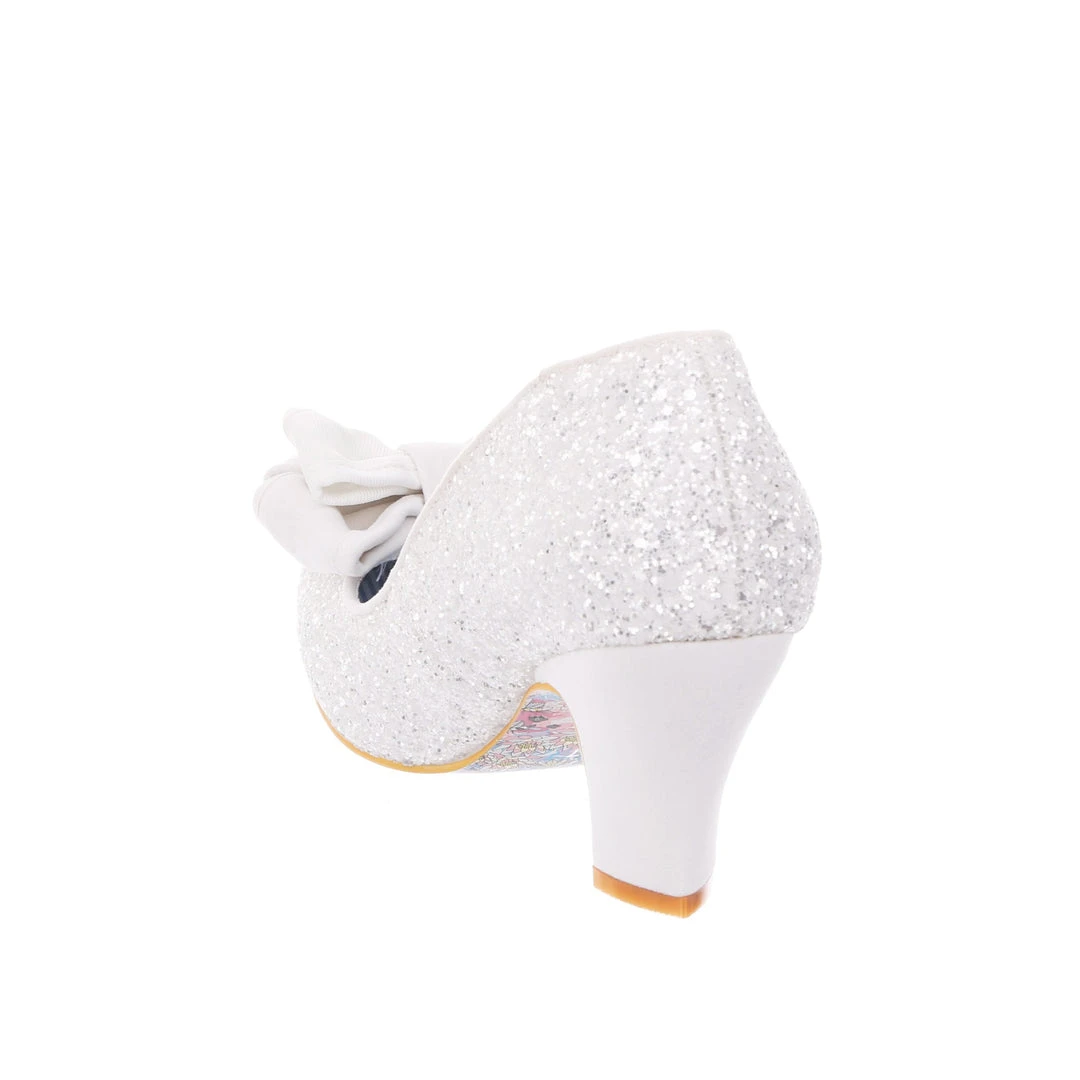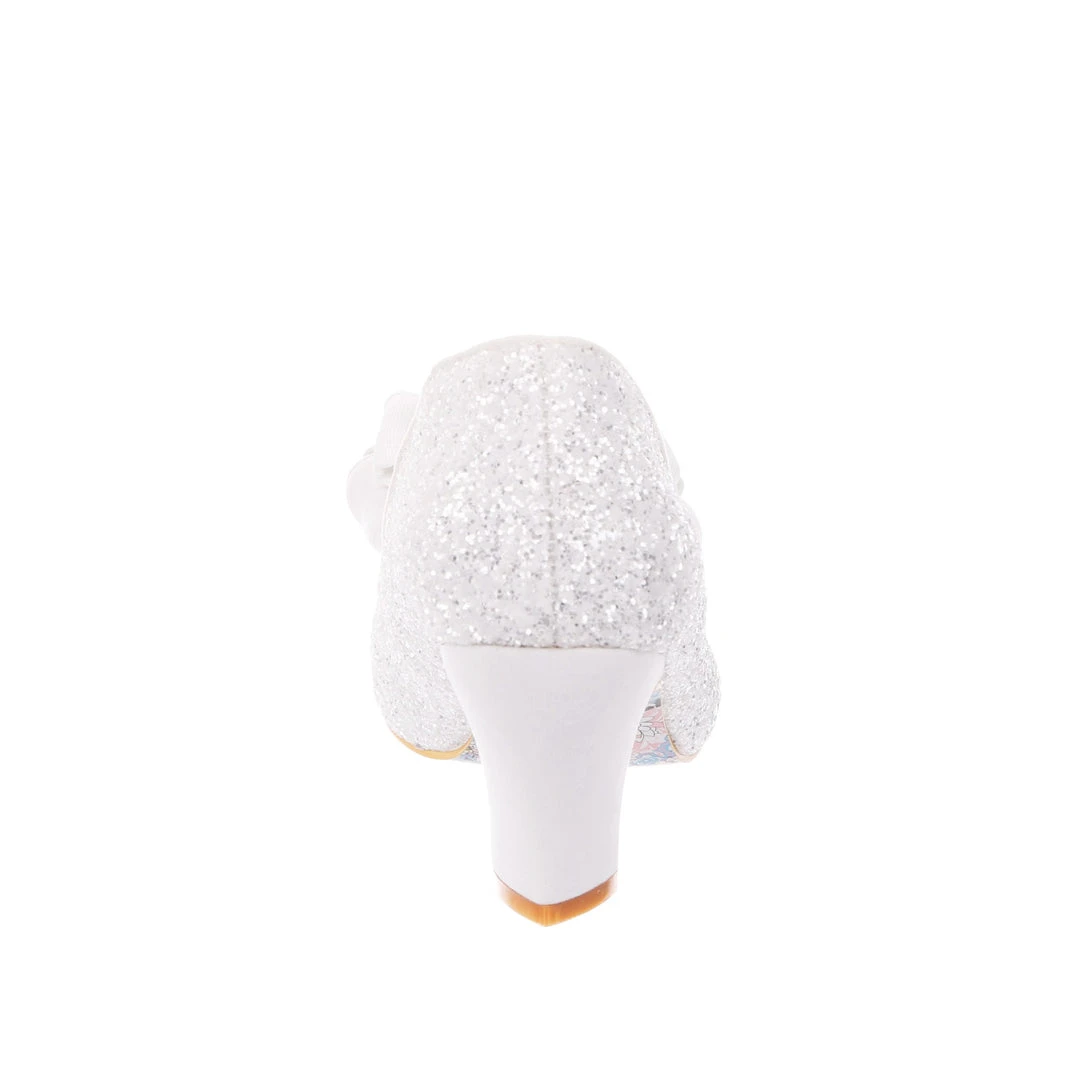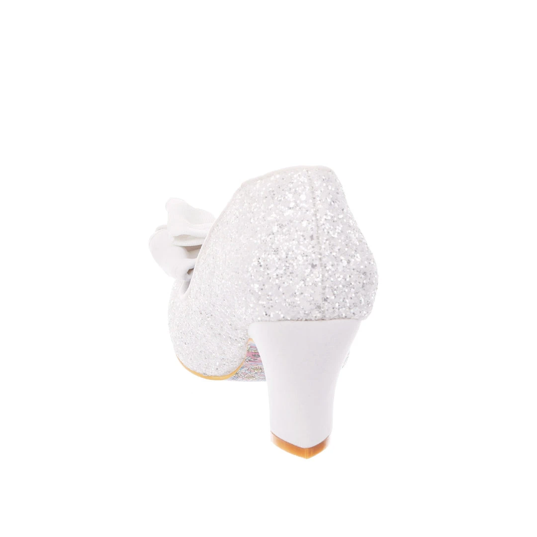 Comfy and stylish, you can dance all night long in these mid heel bridal beauties! Covered in glistening white glitter with an oversized double bow on the toe these are perfect for a bride wanting a traditional style with a twist. Mid heel wedding shoes that you won’t want to take off!