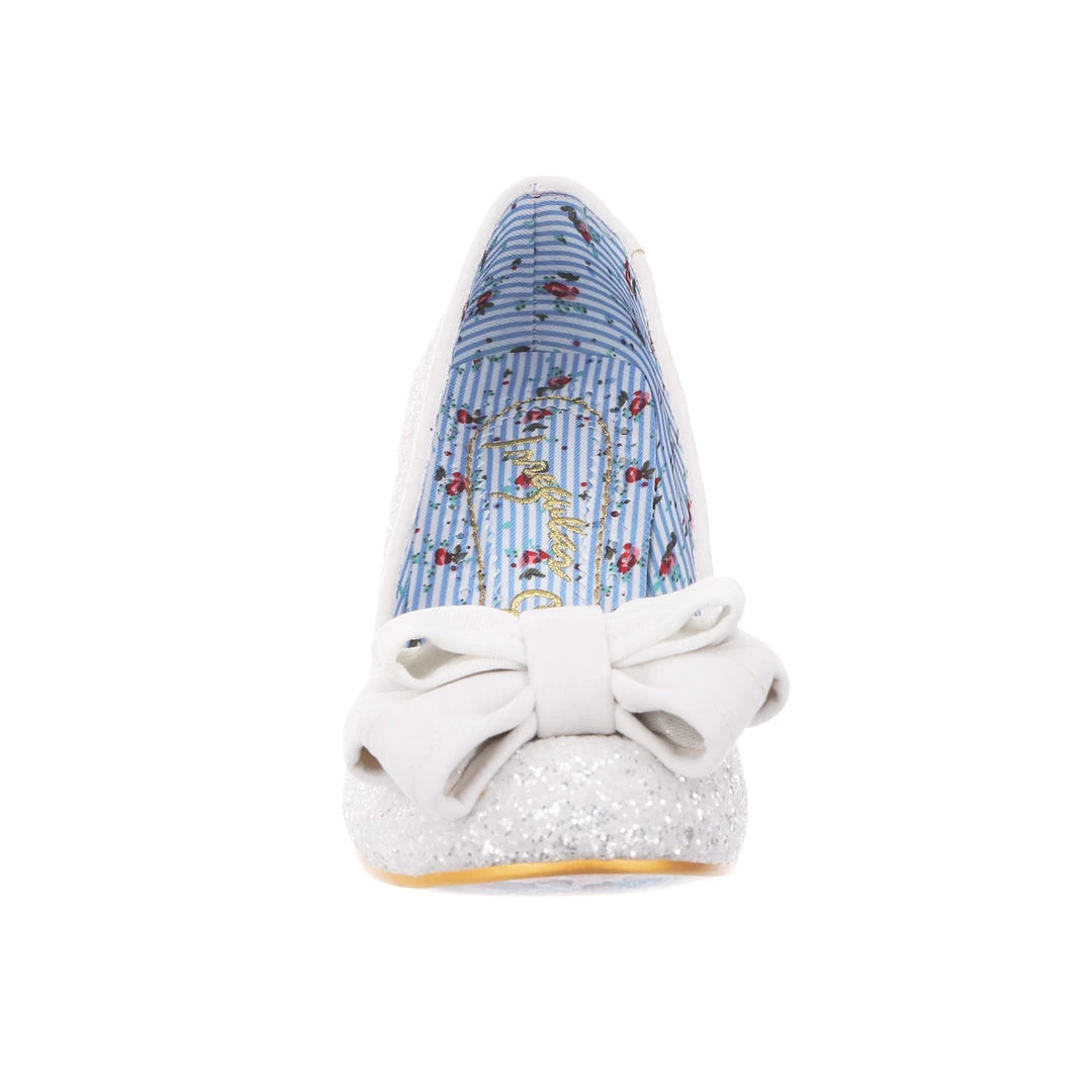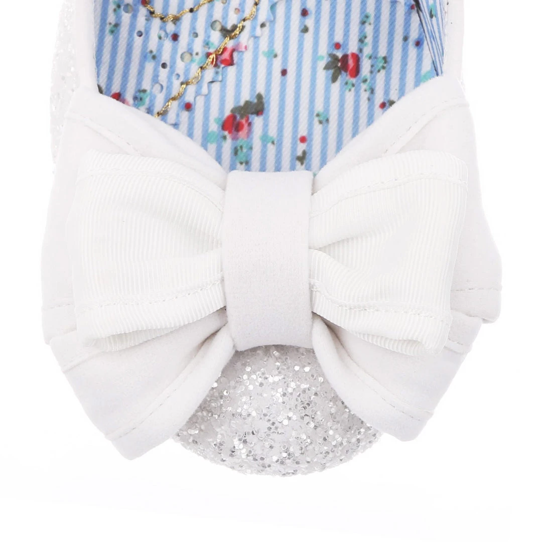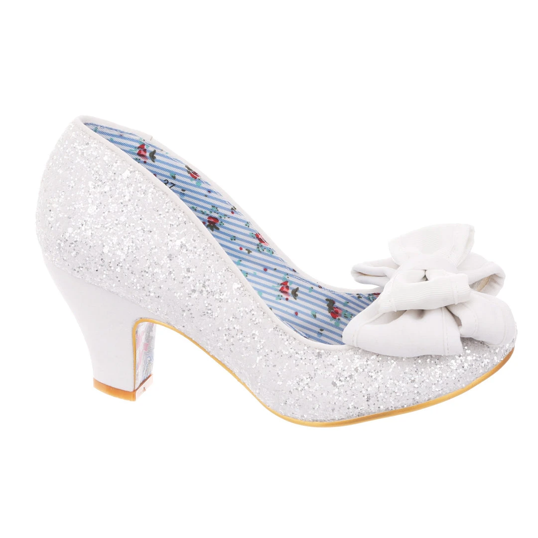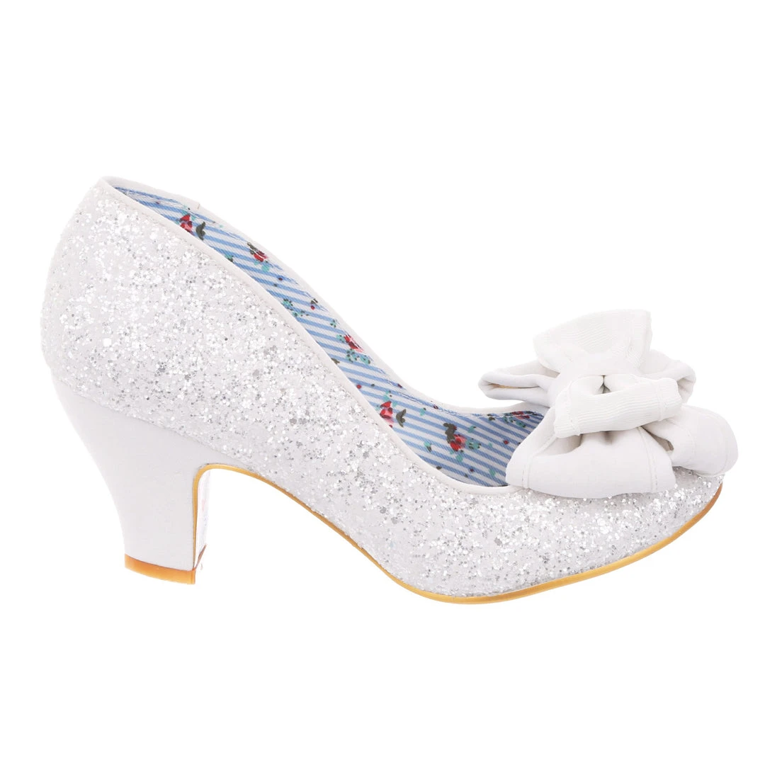 Comfy and stylish, you can dance all night long in these mid heel bridal beauties! Covered in glistening white glitter with an oversized double bow on the toe these are perfect for a bride wanting a traditional style with a twist. Mid heel wedding shoes that you won’t want to take off!