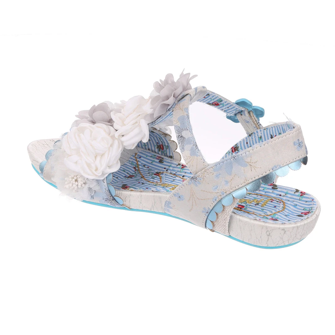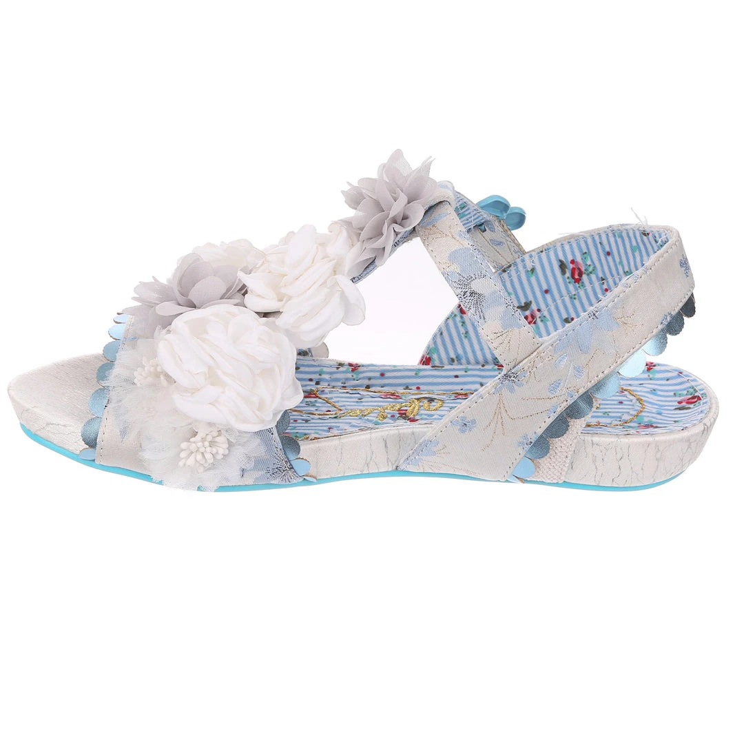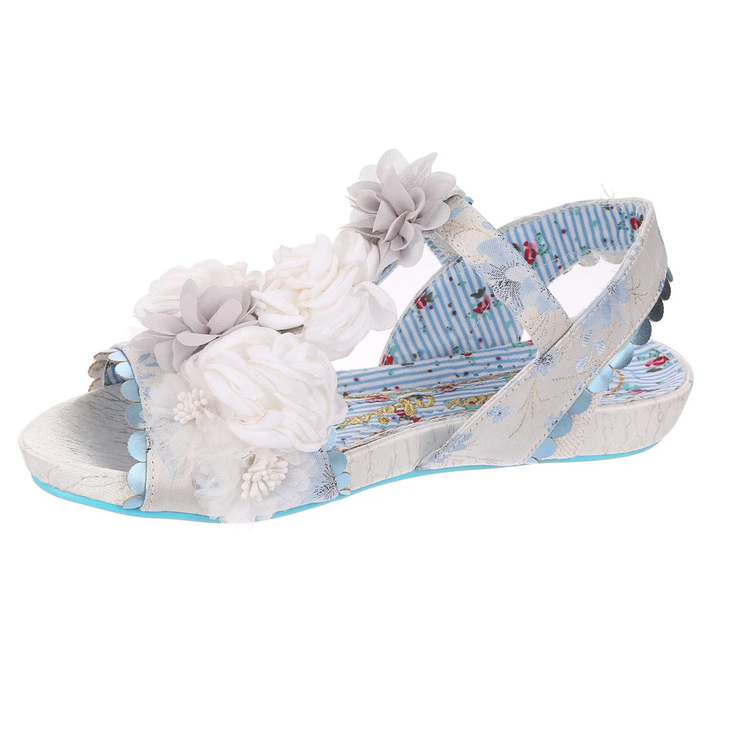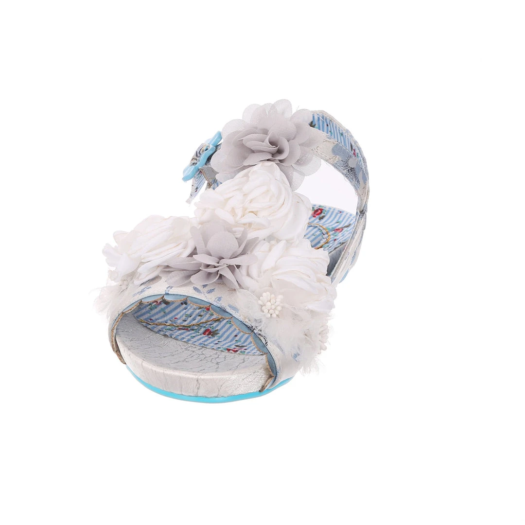 Summer wedding ready! Choose these super comfortable sandals with delicate flowers adorning the strap and t-bar, with pastel blue scalloping and the cute flower shaped buckle, you will be hitting the dance floor all night long! The blue is continued in the floral fabric along with touches of glistening gold thread on these open-toe shoes.