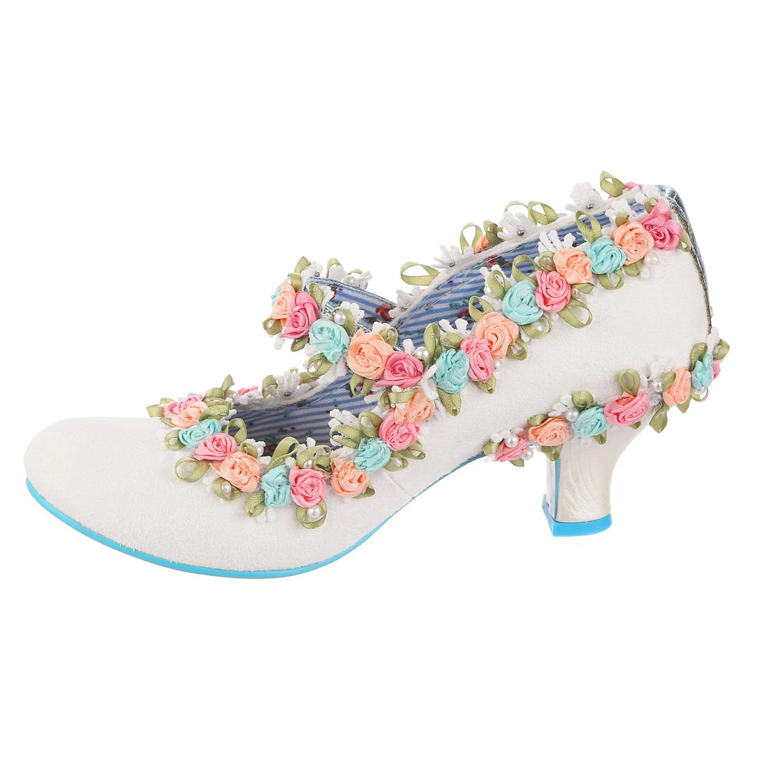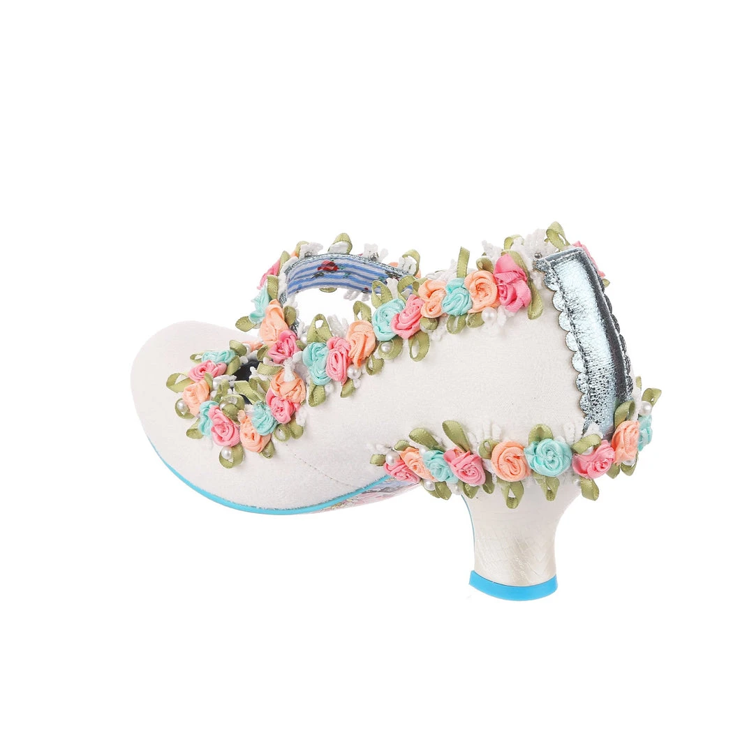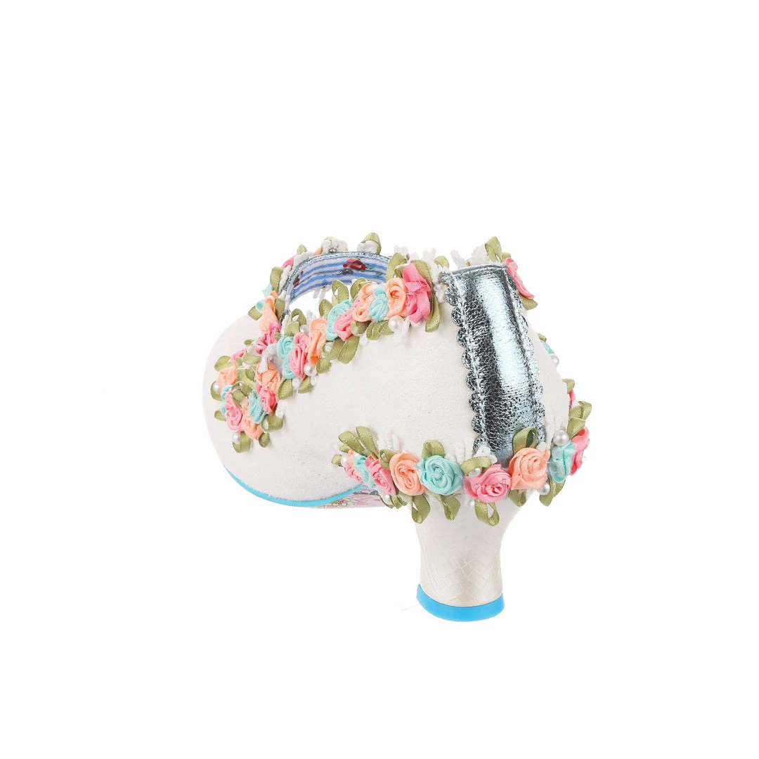 Aren’t these the most darling wedding shoes? These perfect bridal mid heels are adorned with 3D floral trim in blue, pink and orange with green leaves and dotted with pearlescent beads. Even the metallic blue Mary Jane strap is decorated with them! Finished with a wearable white mid heel and fastened with hook and loop that makes them so easy to slip on and off. Make your big day with these beauties!
