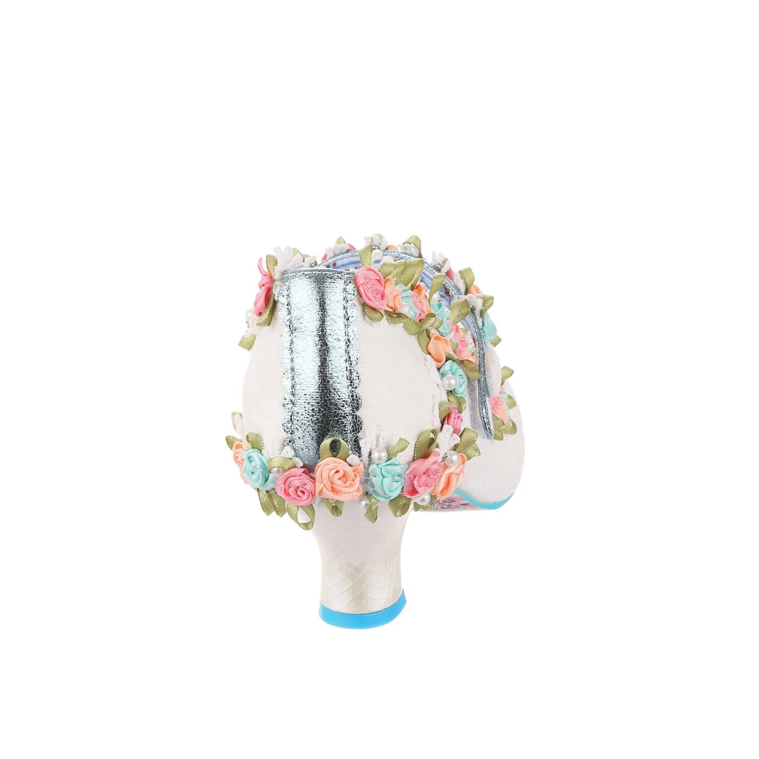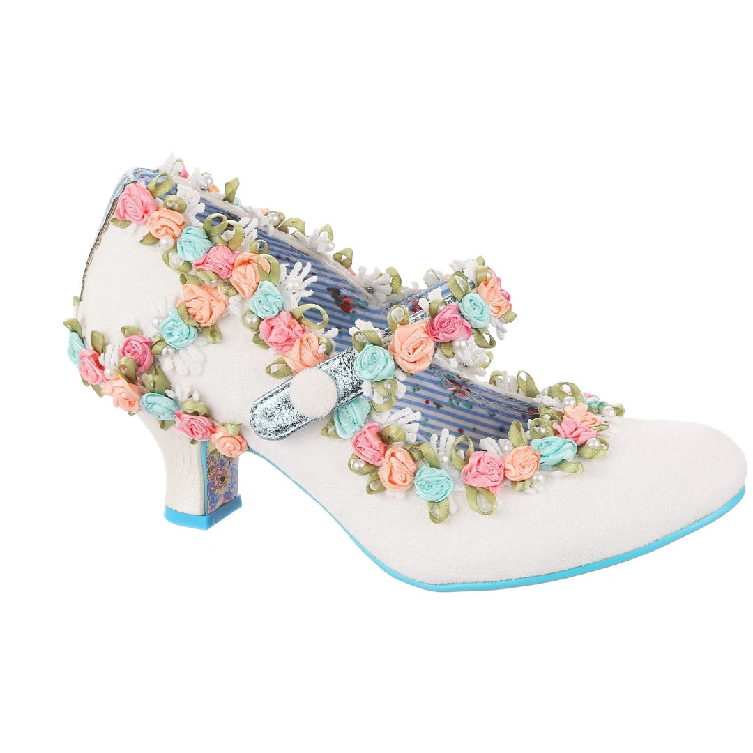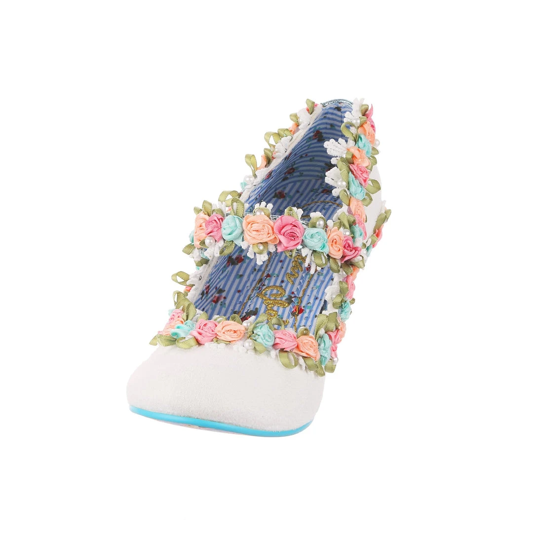 Aren’t these the most darling wedding shoes? These perfect bridal mid heels are adorned with 3D floral trim in blue, pink and orange with green leaves and dotted with pearlescent beads. Even the metallic blue Mary Jane strap is decorated with them! Finished with a wearable white mid heel and fastened with hook and loop that makes them so easy to slip on and off. Make your big day with these beauties!