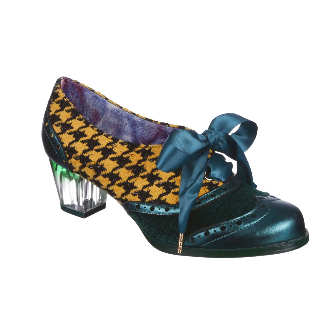 Tip tap your feet about town in these perfectly pretty mid heels. Featuring a bold yellow and black houndstooth upper with contrasting green toe and heel, brogue detailing, ribbon laces and an ombre effect lucite mid-heel.
