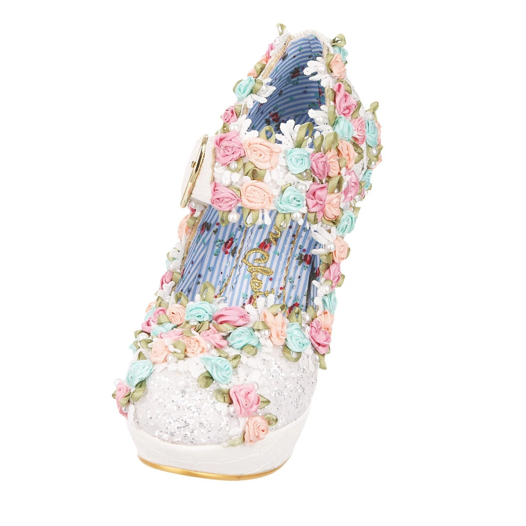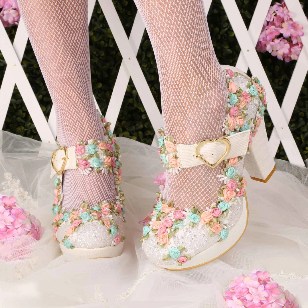 Wrap yourself in flowers and love in these darling heels! Stunning flowers criss-cross around the ivory upper in hues of pink, teal and green, adding opulence and elegance to this gorgeous pair of shoes – this is all pulled together with the delicate sparkling white glitter. The chunky heel and platform are a textured white as the perfect finish. Add these bridal shoes to your big day!