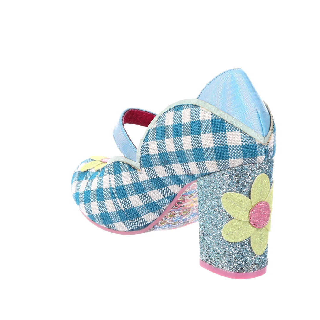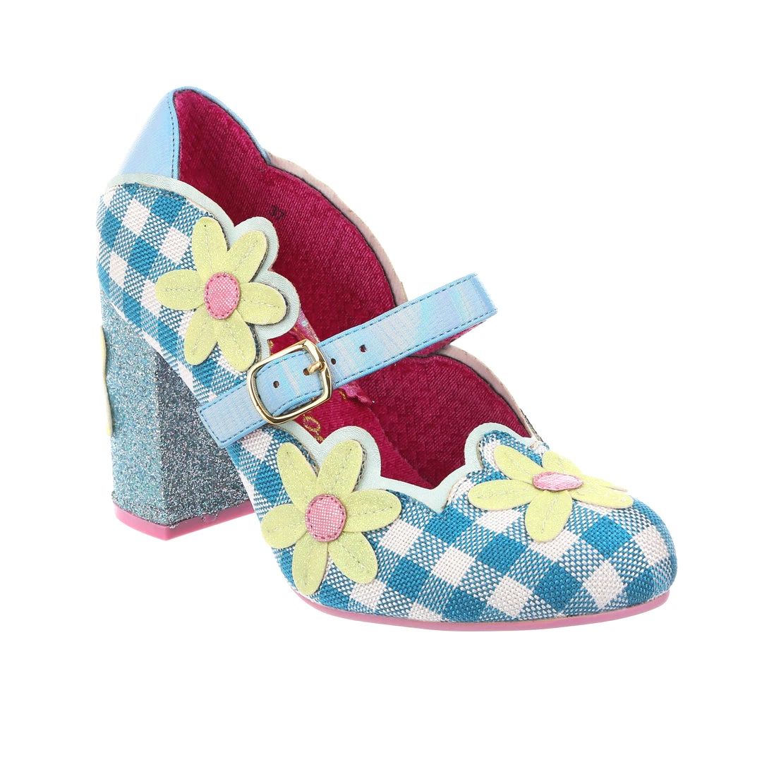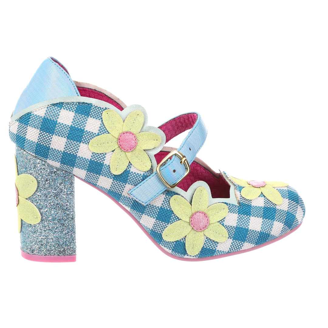 Dance on daisies and dreams in these magical heels! These iconic chunky high heeled Mary Janes have been reimagined this season in all new colours, Daisy Dancer is here for all you flower lovers! Blue and white gingham is paired with yellow and pink blossoms and a metallic blue Mary Jane strap! Add them to your collection today!