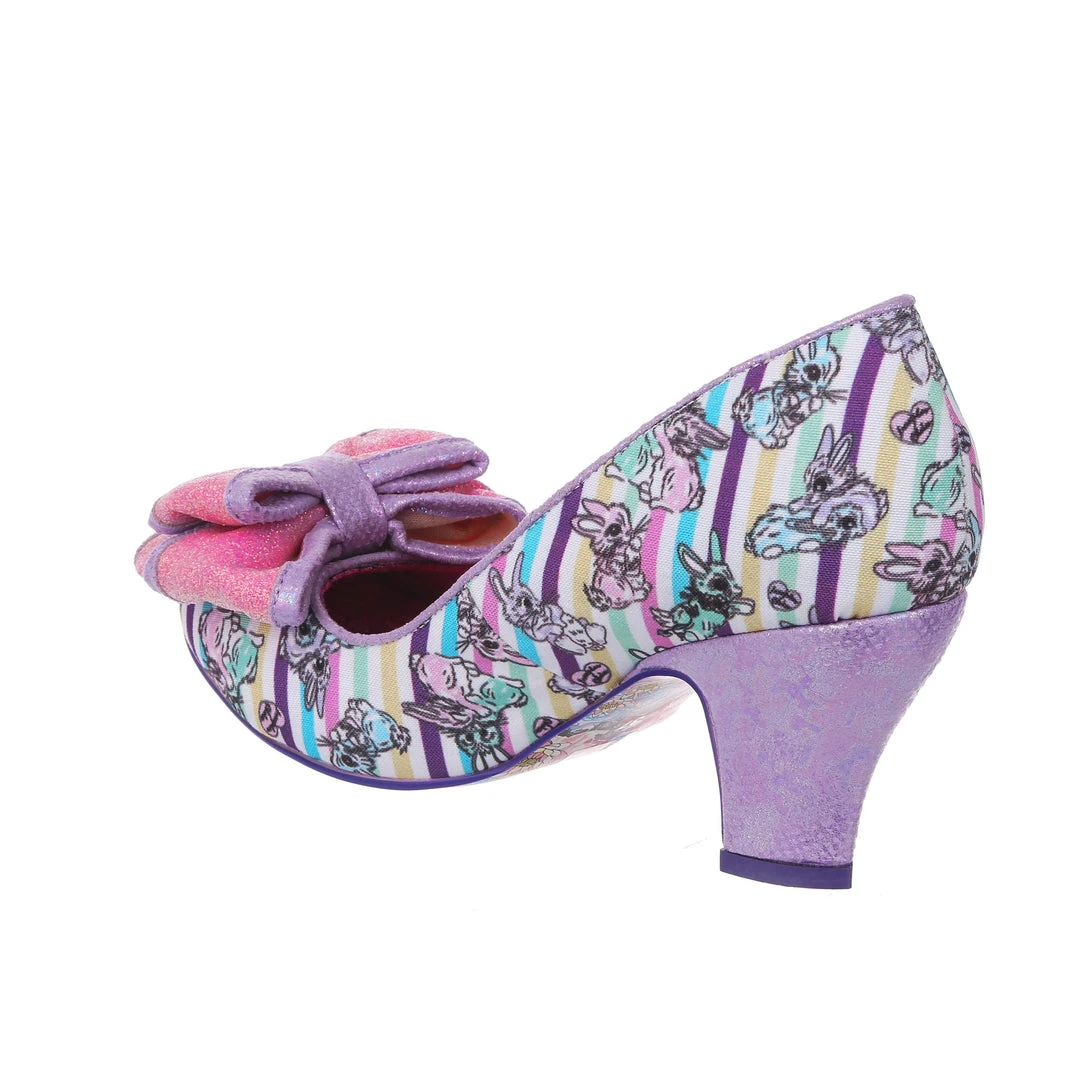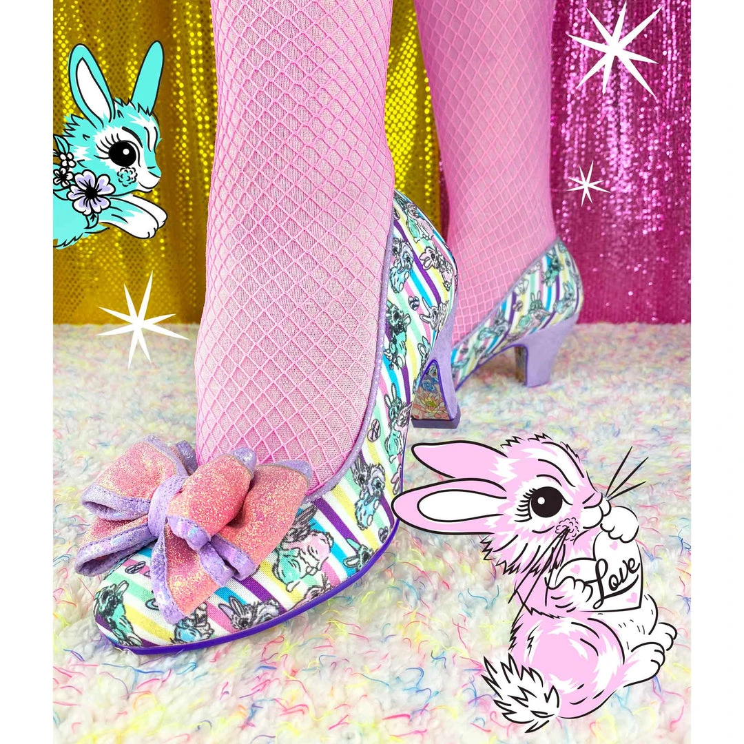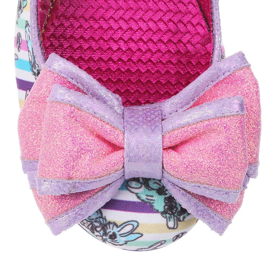 Hop into a piece of classic IC! This Iconic Ban Joe is covered with adorable spring bunnies, a favourite archive print from SS17! They sit on a striped background and the comfortable mid heel is a metallic pastel purple with a contrasting deep purple sole, all finished with a cute sparkly pink and purple bow on the toe. Binky with joy over these beauties!