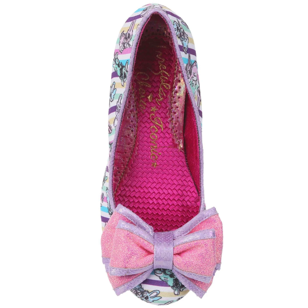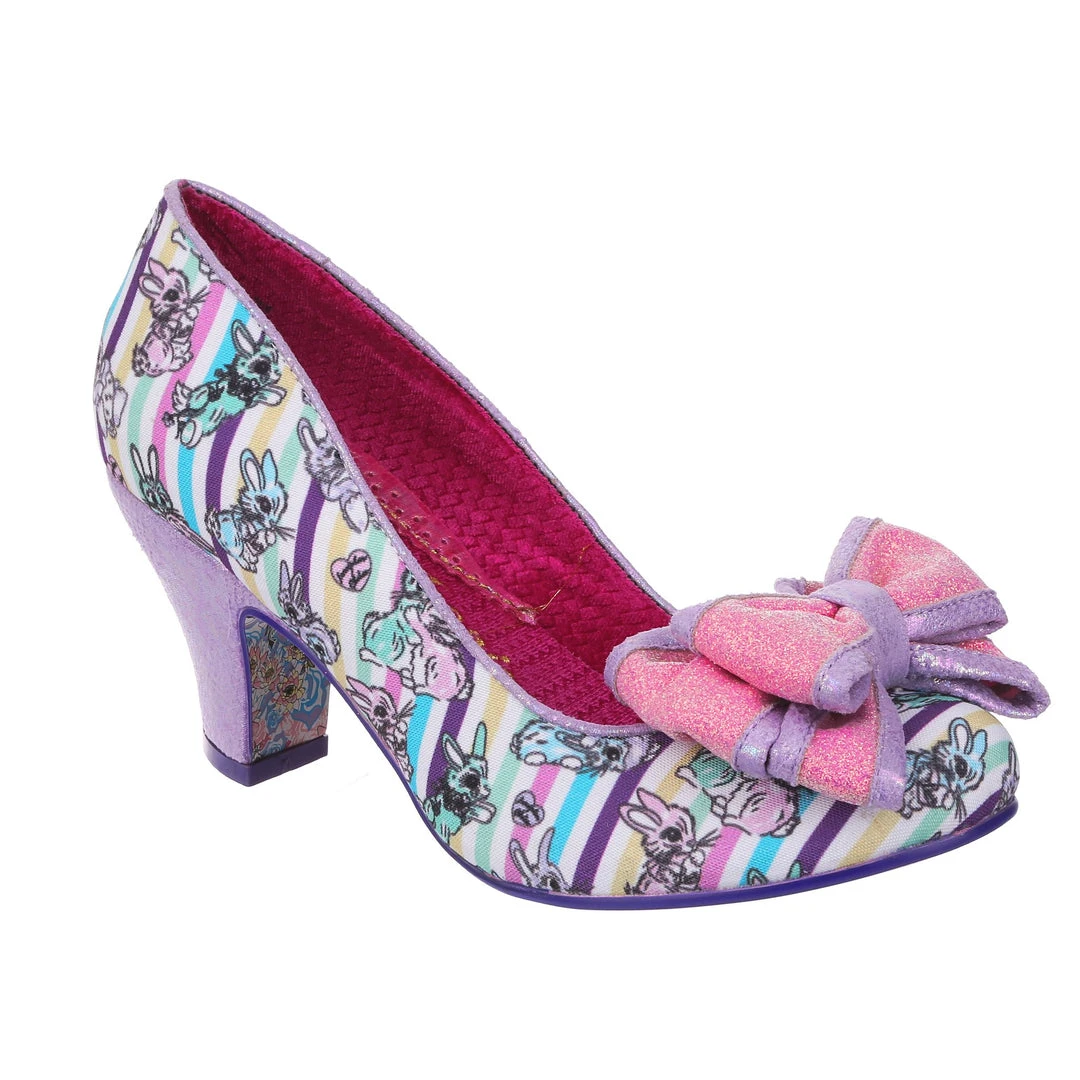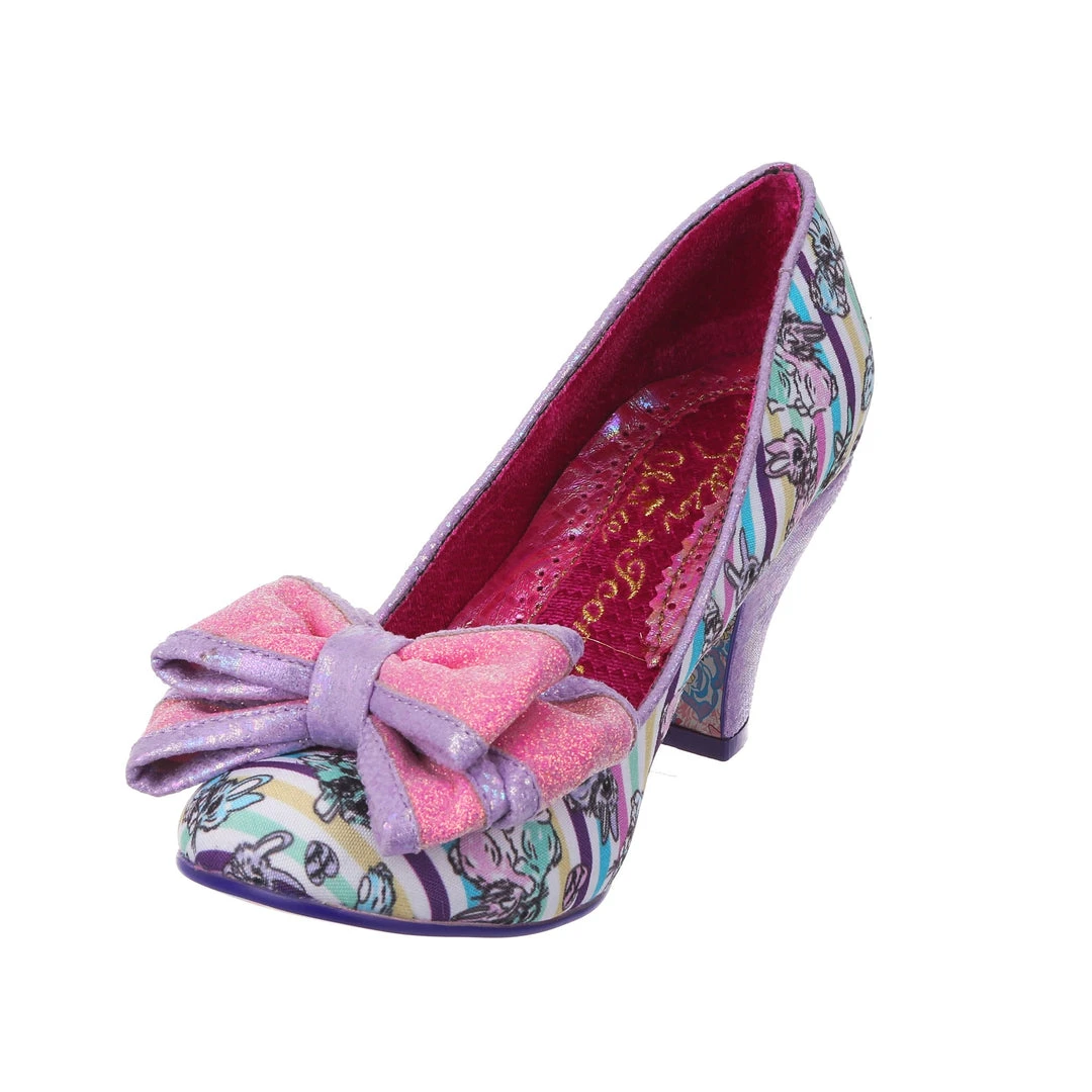Hop into a piece of classic IC! This Iconic Ban Joe is covered with adorable spring bunnies, a favourite archive print from SS17! They sit on a striped background and the comfortable mid heel is a metallic pastel purple with a contrasting deep purple sole, all finished with a cute sparkly pink and purple bow on the toe. Binky with joy over these beauties!