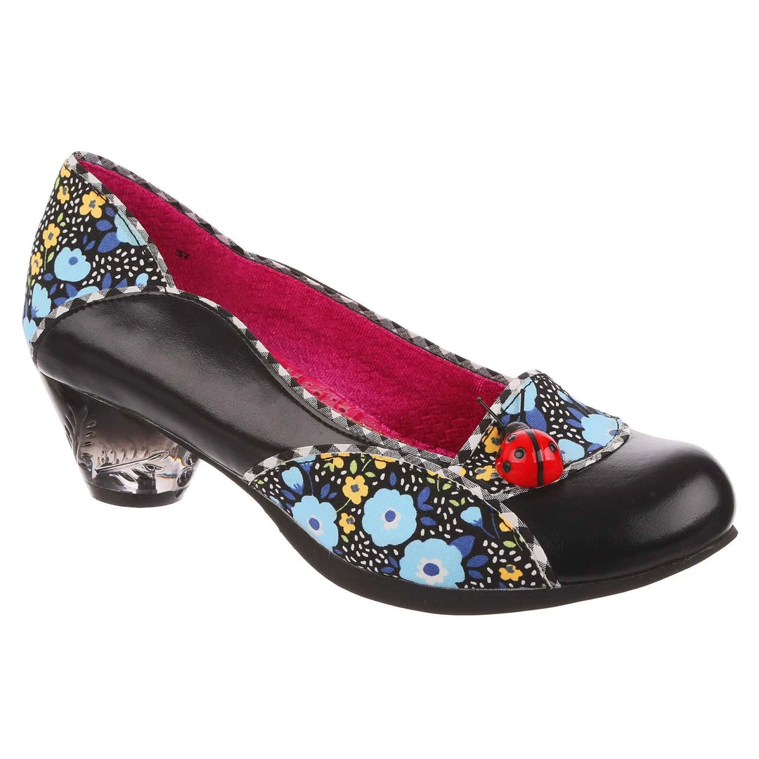 Oh so cute! These little ladybug faves are back! Classic black is paired with adorable blue, monochrome and yellow florals, along with black gingham piping and, of course, the ladybug charm on the toe! Finished with our adorable lower lucite heel, these are one for all you comfort lovers who still want to be styling!