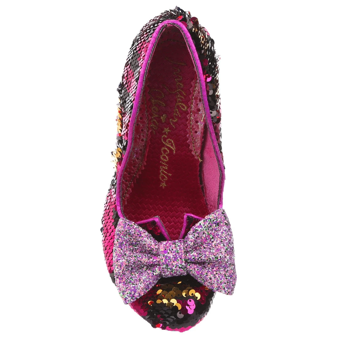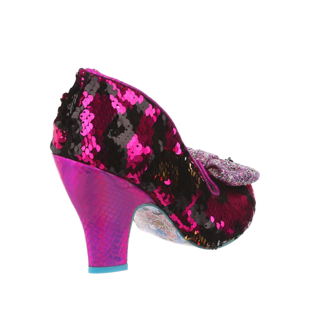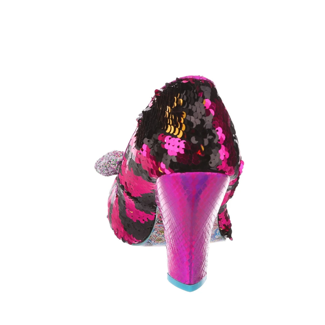 Give your look some serious WOW factor in these sequinned and spectacular heels! Our classic high heels, Nick of Time, have been all decked out in graphic black and pink and gold reversible sequins in a tiger stripe pattern! Tied together with the baby pink glitter bow on the toe, and metallic covered heel – these beauties are here to make your day, and your wardrobe, better!