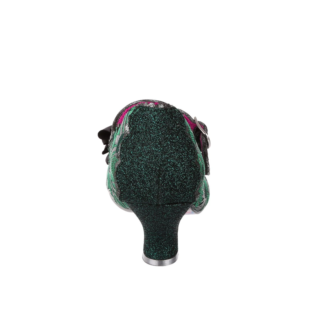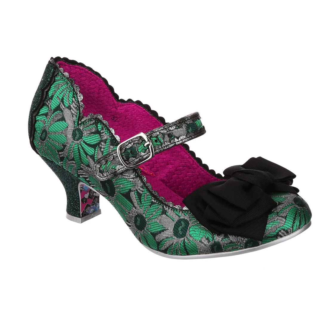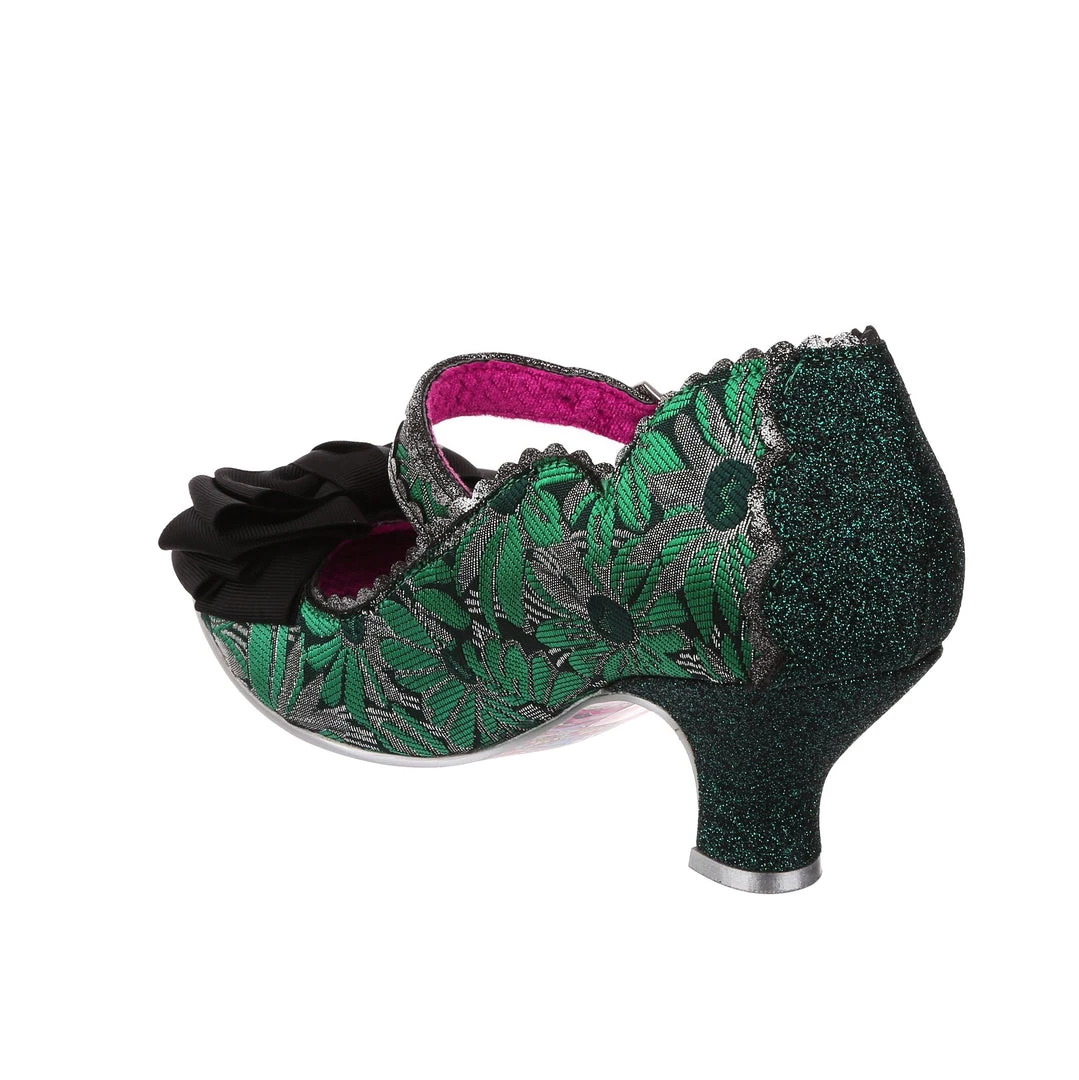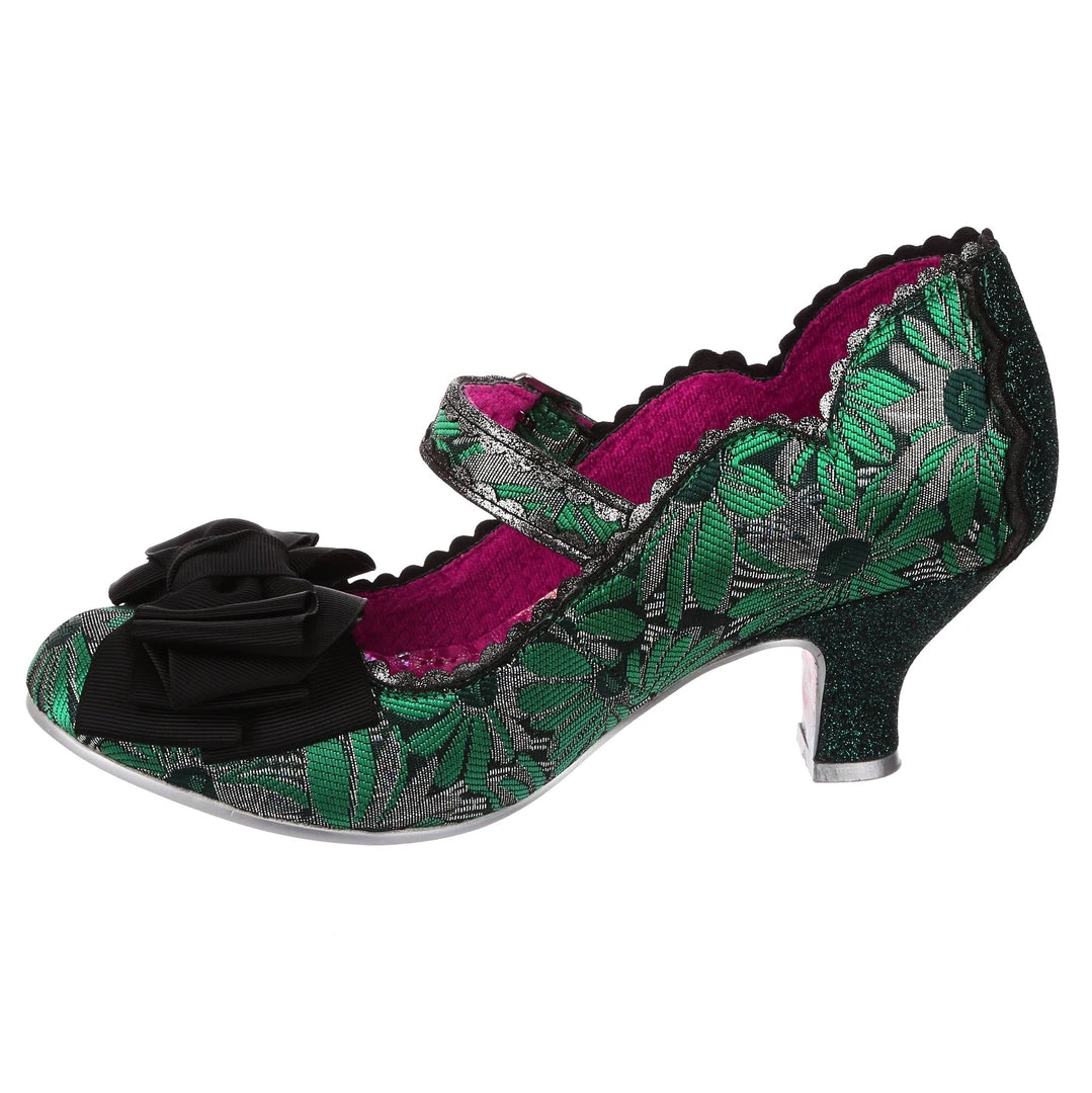 Oh who doesn’t love our classic Summer Breeze mary jane style? These fan favourite mid heels are back, this time in a stunning green and silver brocade – accented with a black bow, and a dark green metallic wrapped heel with matching back panelling. These vintage style shoes are bright, fun and fabulous!