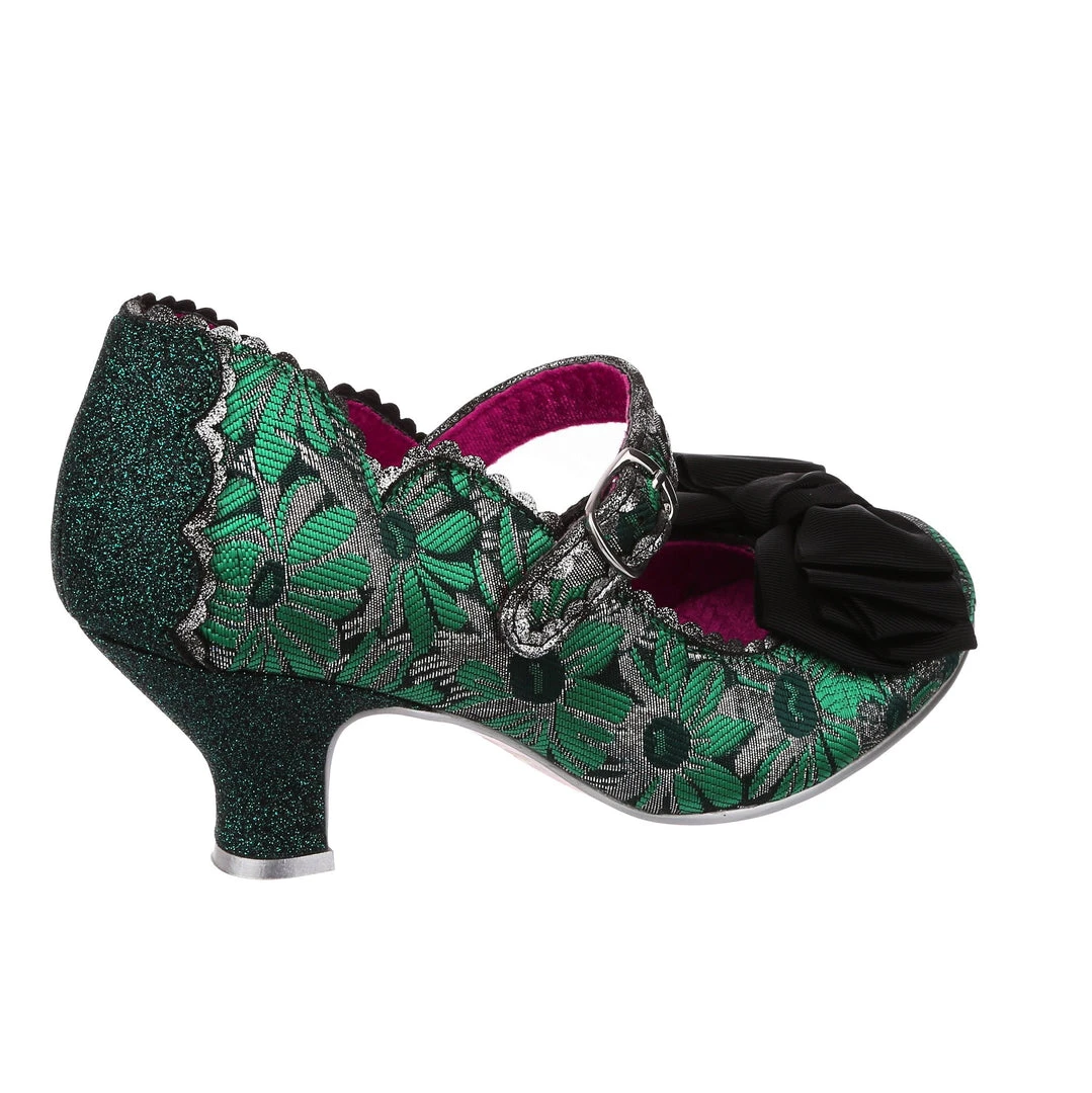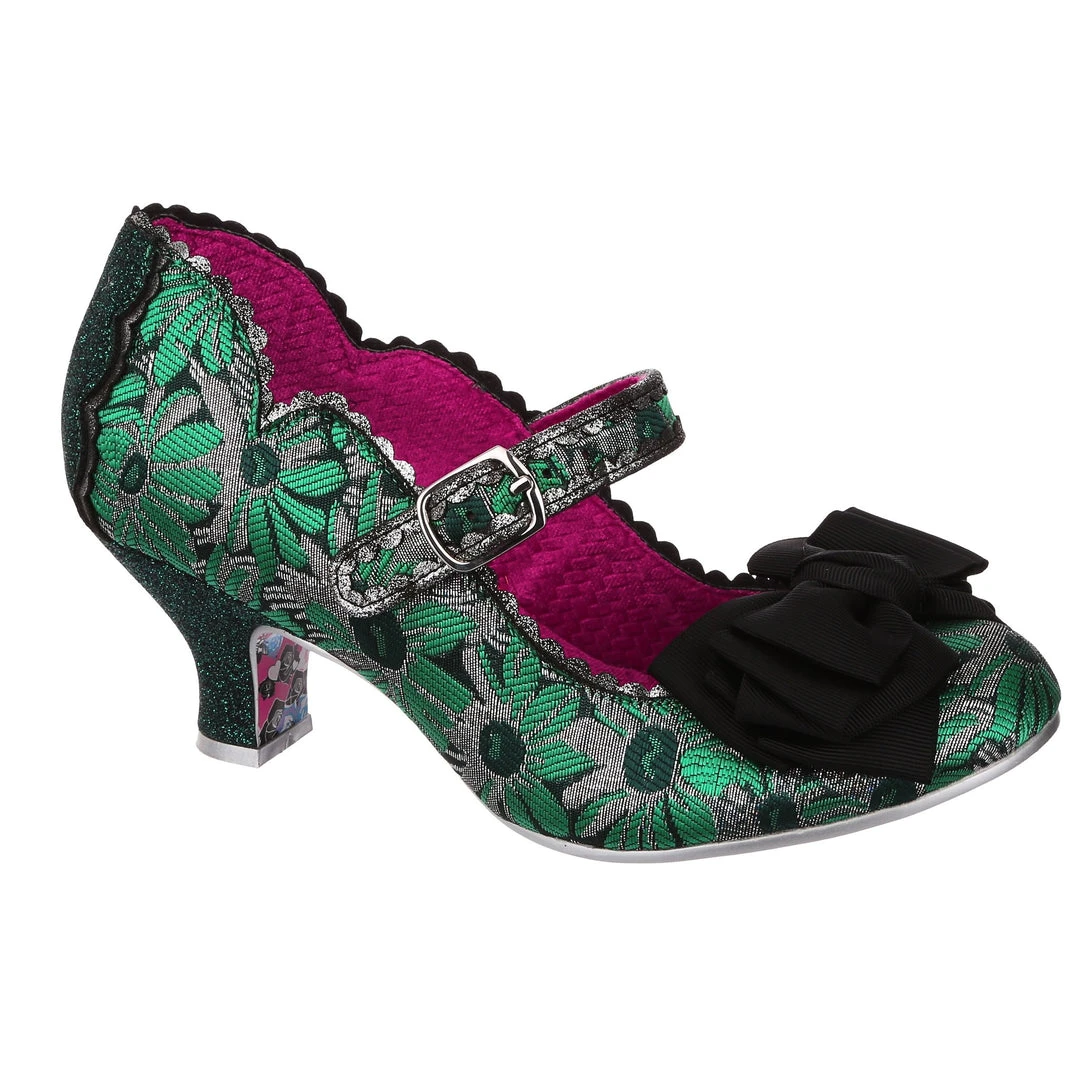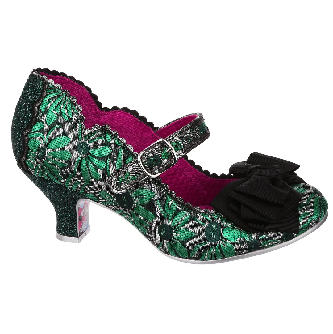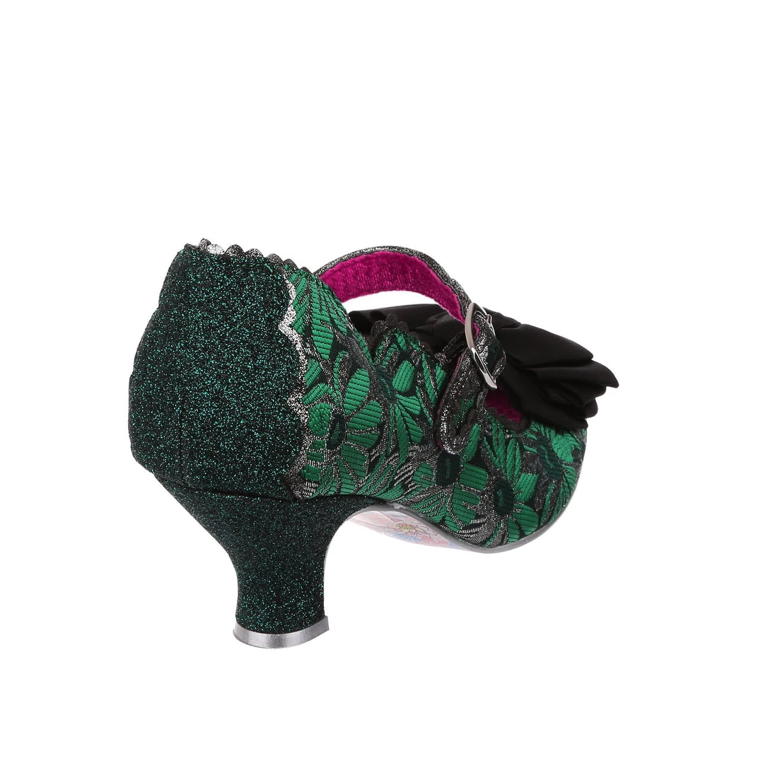 Oh who doesn’t love our classic Summer Breeze mary jane style? These fan favourite mid heels are back, this time in a stunning green and silver brocade – accented with a black bow, and a dark green metallic wrapped heel with matching back panelling. These vintage style shoes are bright, fun and fabulous!