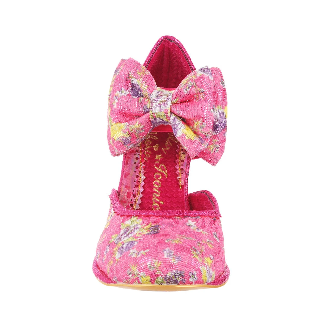 Giggles and Chips sports a cute double bow on the elasticated strap and a classic heel height inspired by our timeless Miaow boot and, destined to be a sweet addition to your IC collection! These pink and purple summer heels are here for all your garden parties and weddings, decked out in a soft velvet woven with strands of glitter and lilac flowers, a golden iridescent sequinned heel and hot pink piping.
