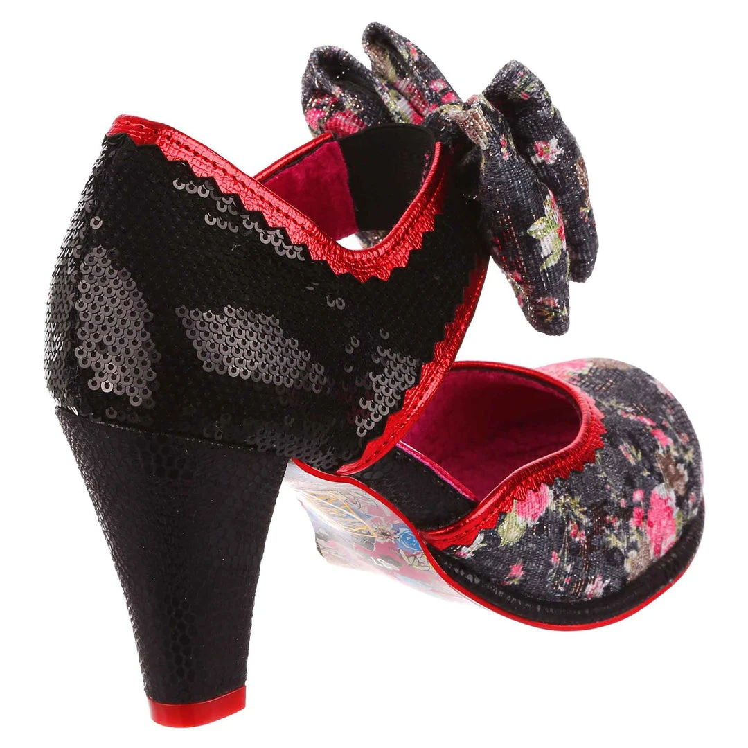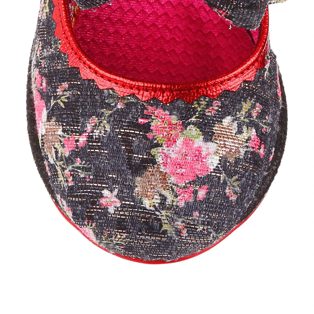 Giggles and Chips boasts a comfy heel height inspired by our timeless Miaow boot and a cute double bow on the elasticated strap, they are sure to be a sweet addition to your IC collection. These comfy black and red summer heels are here for all your garden parties and evenings out, decked out in a soft velvet woven with strands of glitter and pink flowers, a glossy black sequinned heel and red metallic piping.