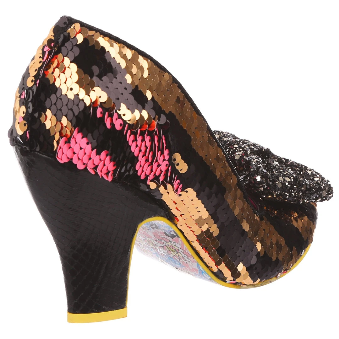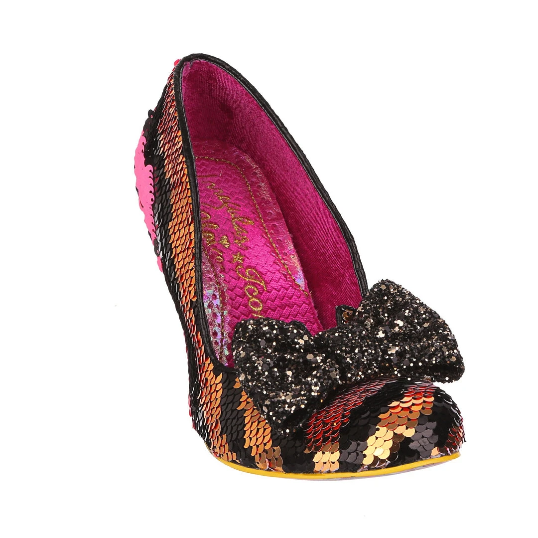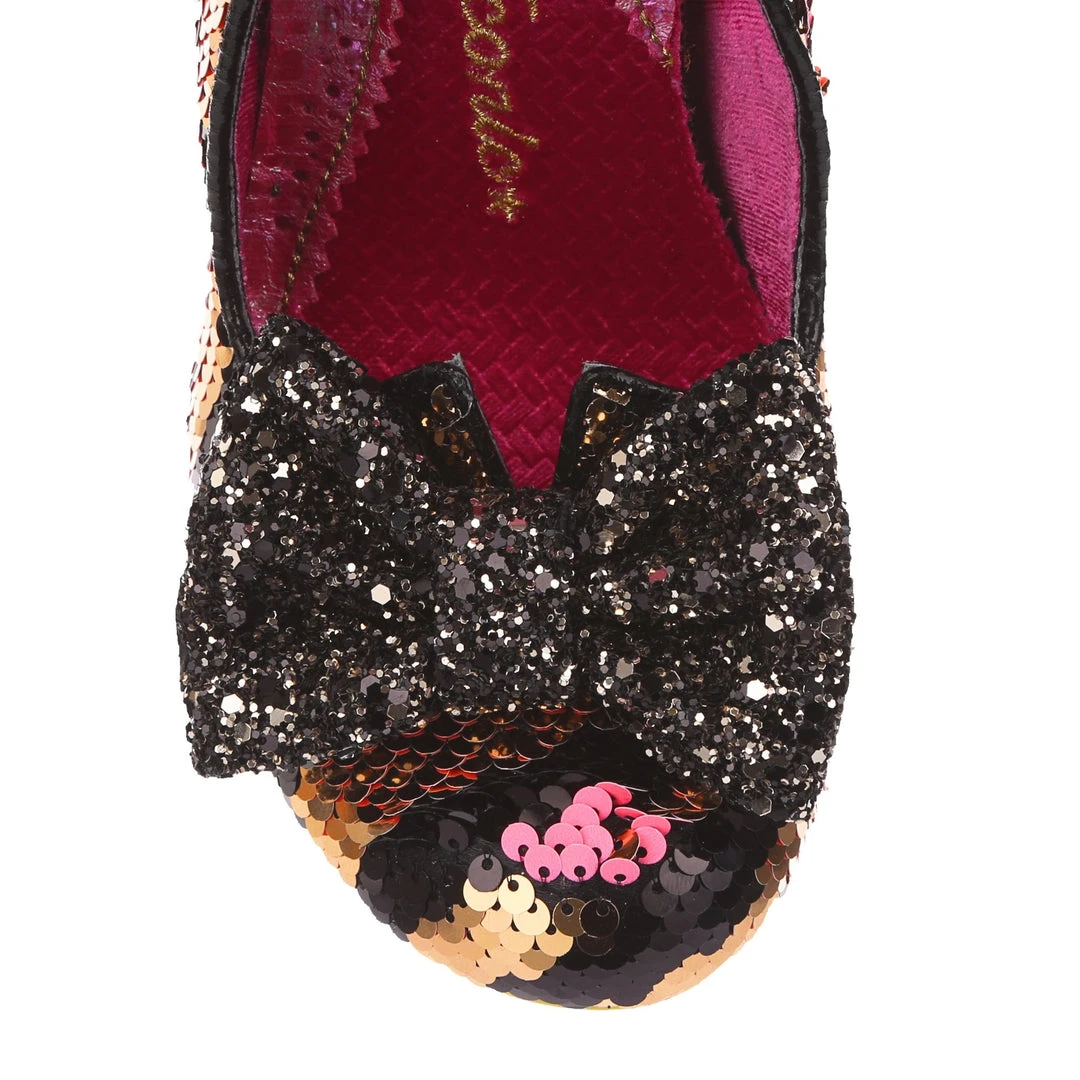Give your look some serious WOW factor in these sequinned and spectacular heels! Our classic high heels, Nick of Time, have been all decked out in graphic black and gold and pink reversible sequins in a stripy pattern. Tied together with the black iridescent glitter bow on the toe, and metallic covered heel – these beauties are here to make your day, and your wardrobe, better!