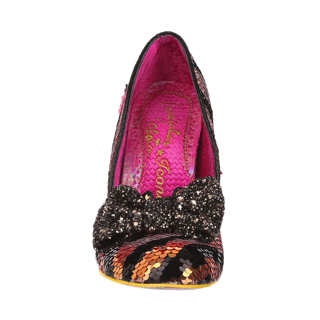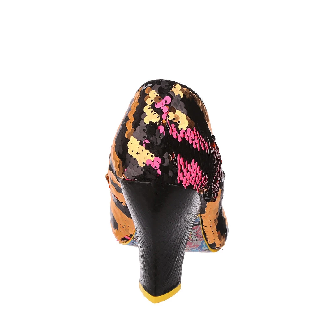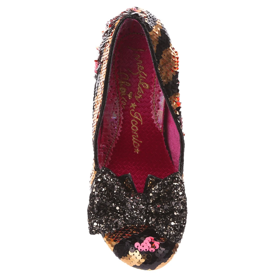 Give your look some serious WOW factor in these sequinned and spectacular heels! Our classic high heels, Nick of Time, have been all decked out in graphic black and gold and pink reversible sequins in a stripy pattern. Tied together with the black iridescent glitter bow on the toe, and metallic covered heel – these beauties are here to make your day, and your wardrobe, better!