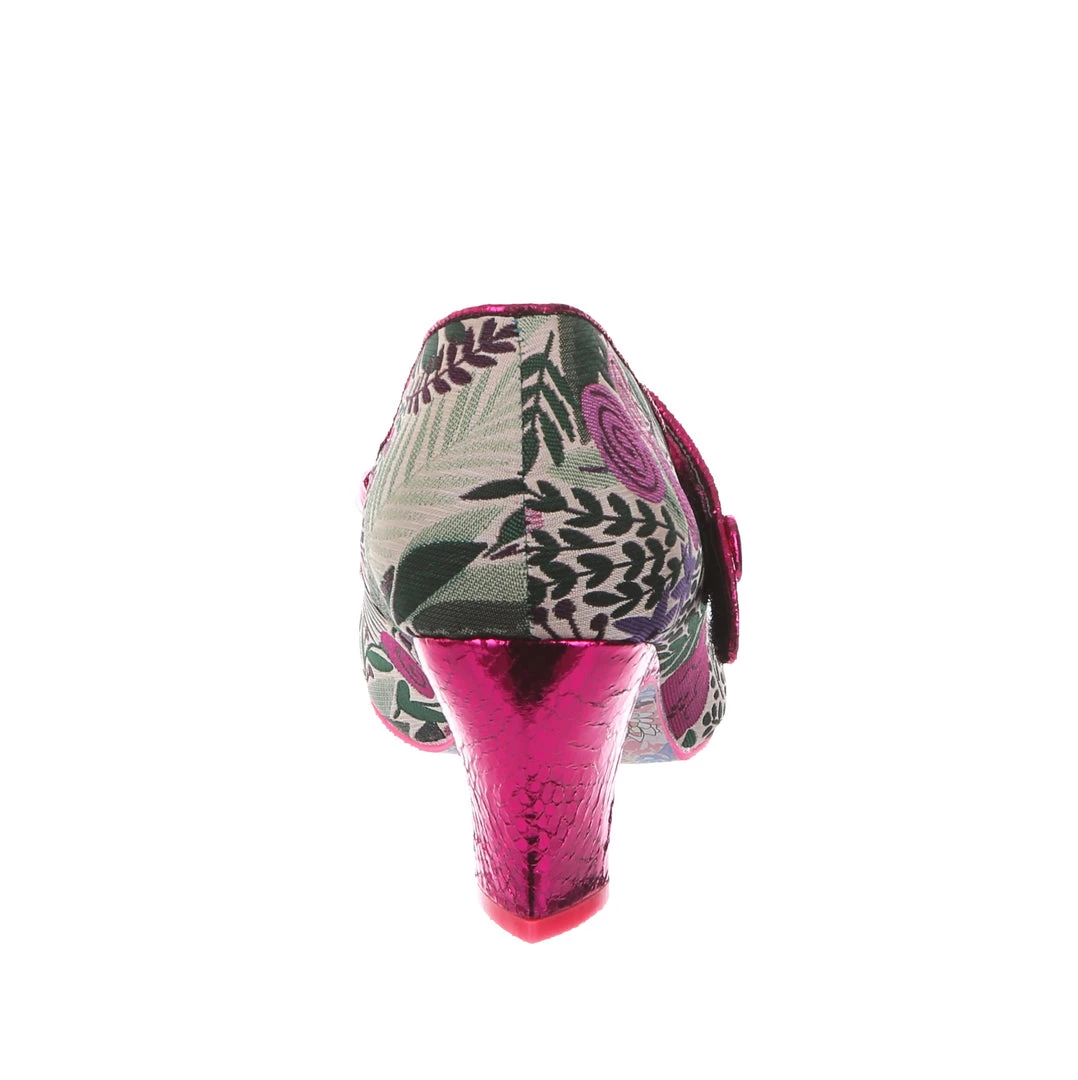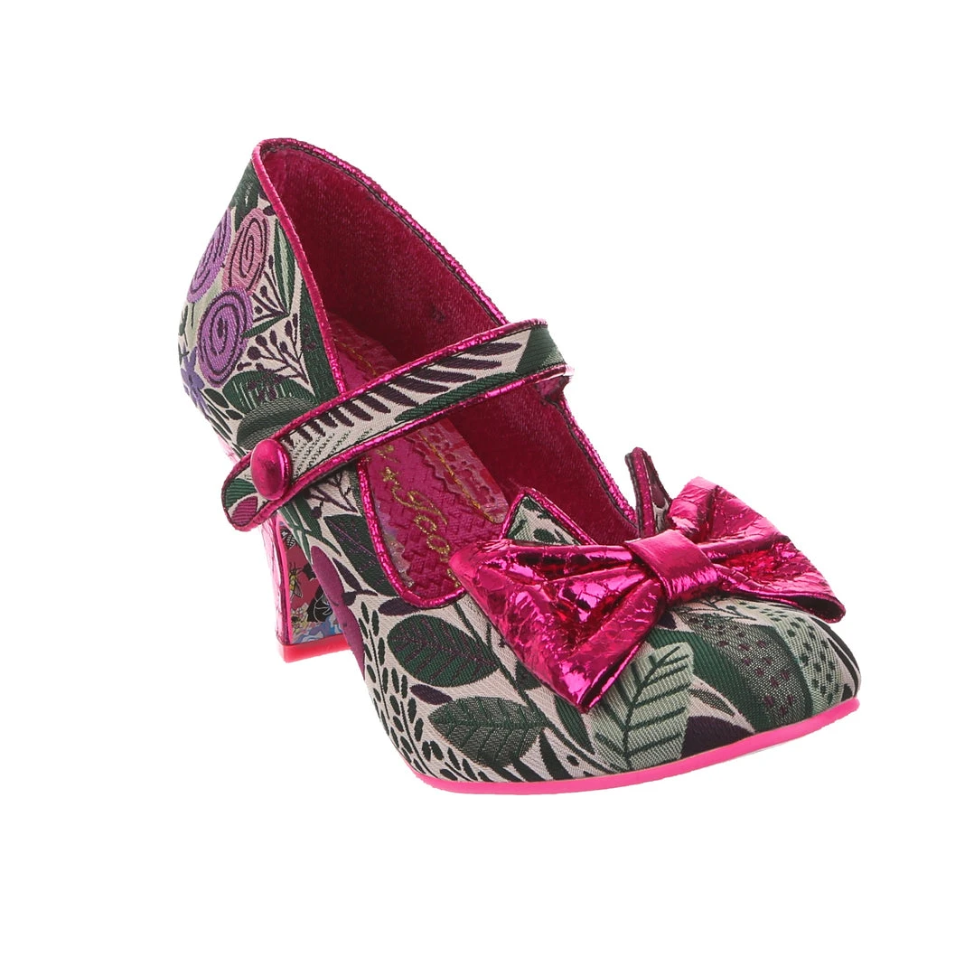 Get retro ready! The IC classic style has been given a vintage feel, these Mary Jane heels are wearable, fun, and suitably irregular! A graphic jewel tone print with splashes of green, pink and purple is accented with the hot pink piping, metallic bow on the toe and matching wrapped heel! A great staple shoe in anyones eccentric wardrobe!