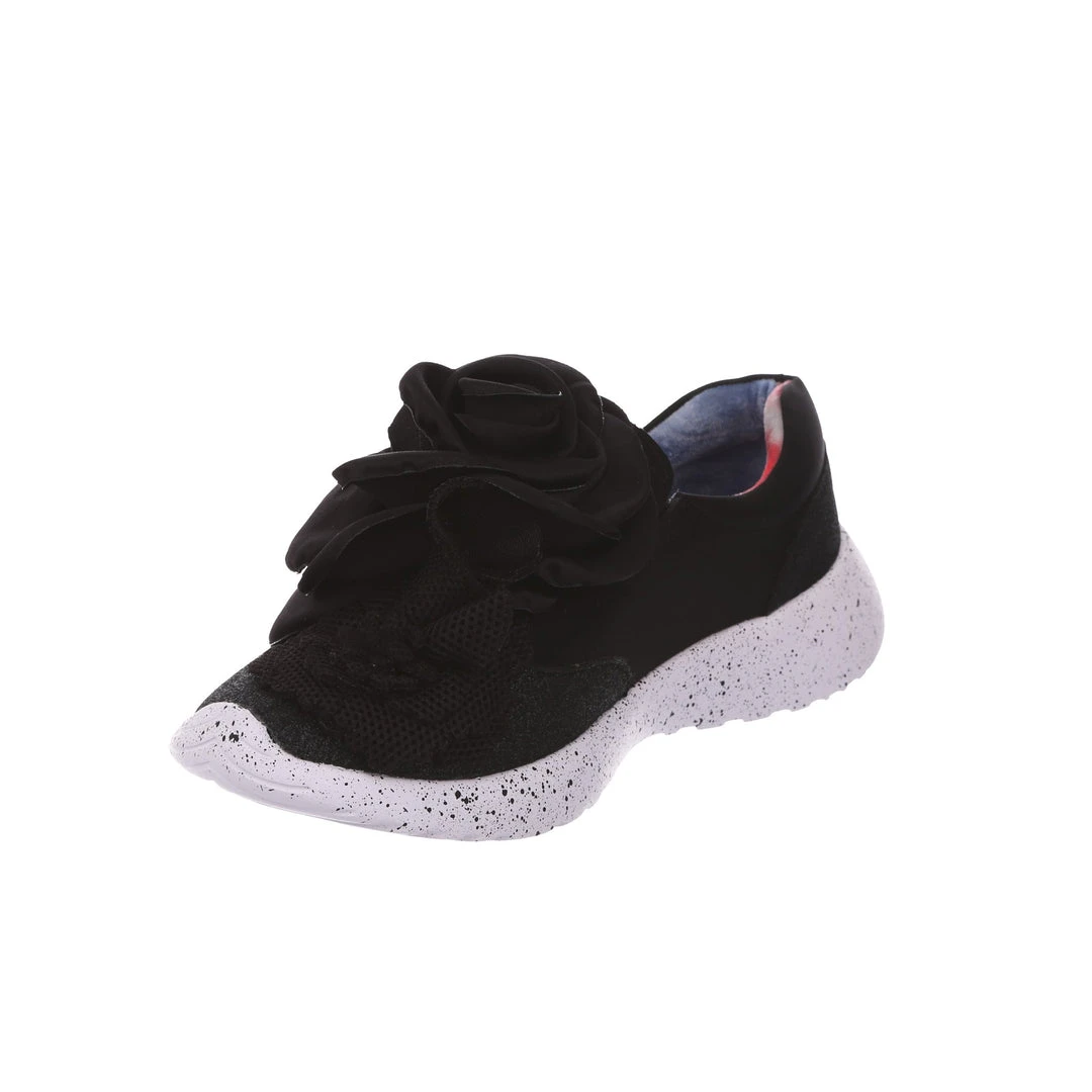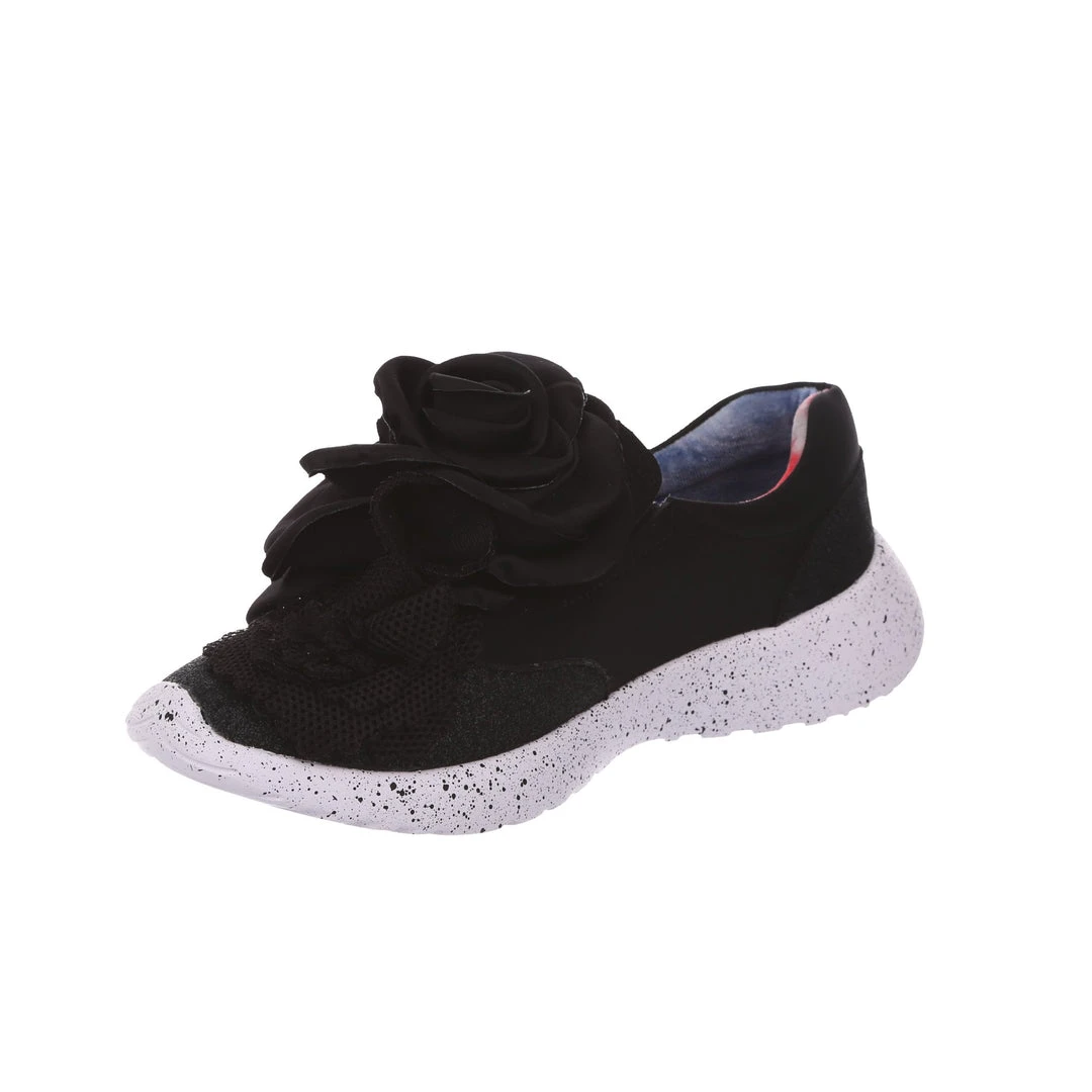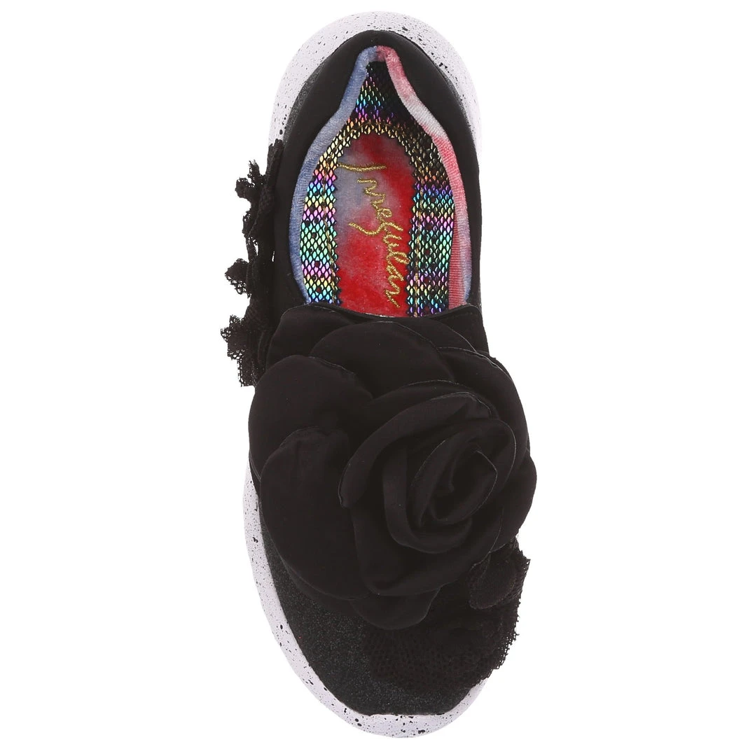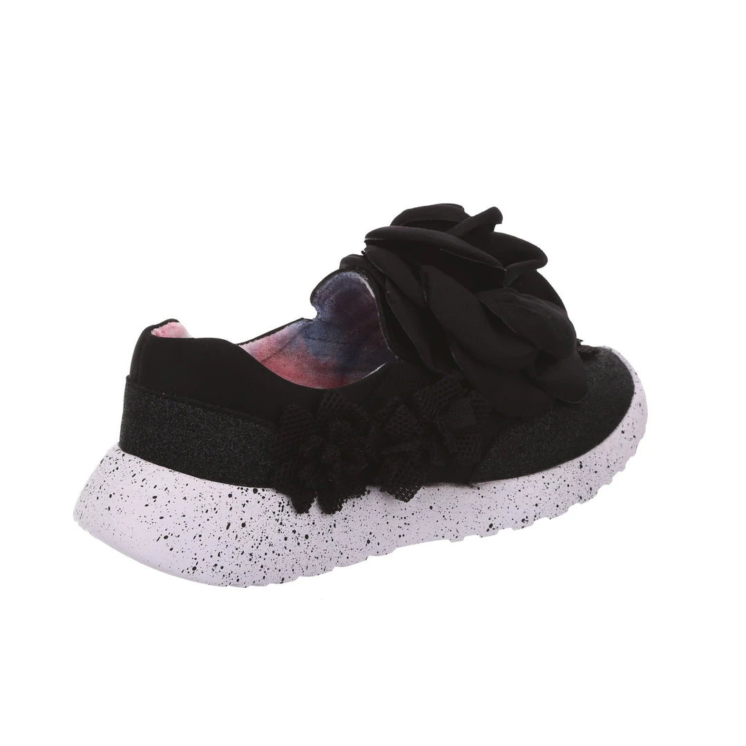 Soft shoe shuffle your way into sporty comfort in our new season Rambling Roses! Huge fabric flowers and delicate trims nestle on a glinting iridescent black glitter background.