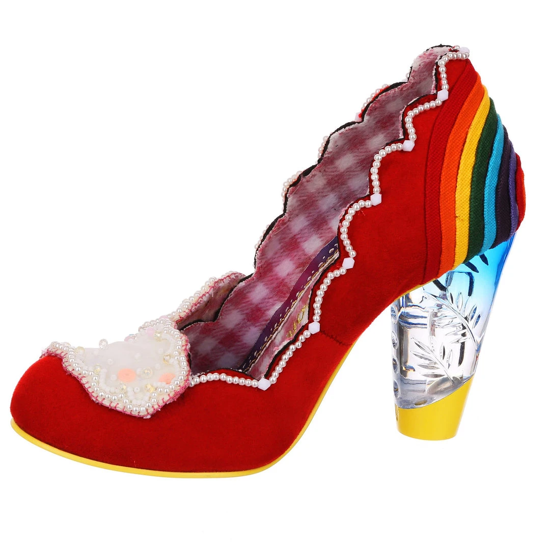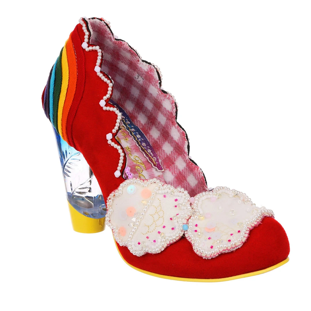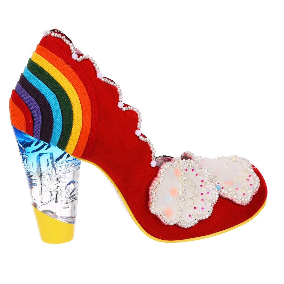 Ready for a trip over the rainbow? Add some whimsy to your feet and fall head over heels for the gorgeous ‘Shirley Bass’ shoes! A perfect ruby red base is contrasted with a dazzling rainbow and darling clouds along the toe! All paired with our fabulous lucite heel, these are the pot of gold in any wardrobe!