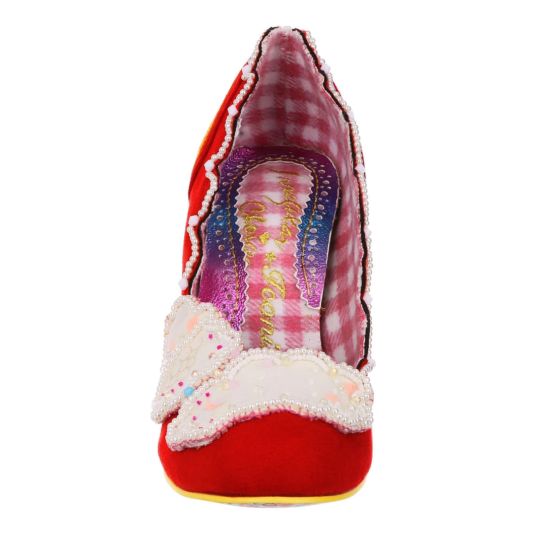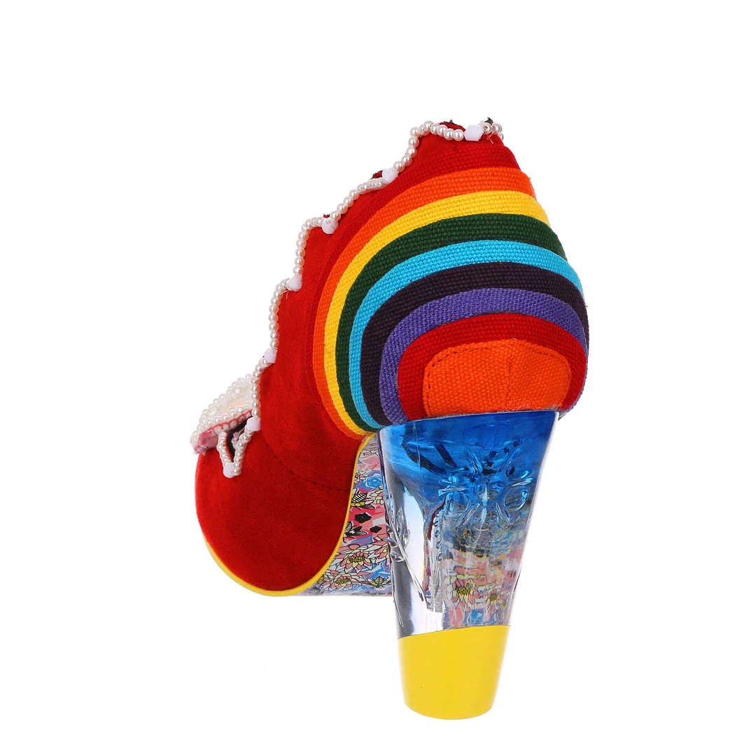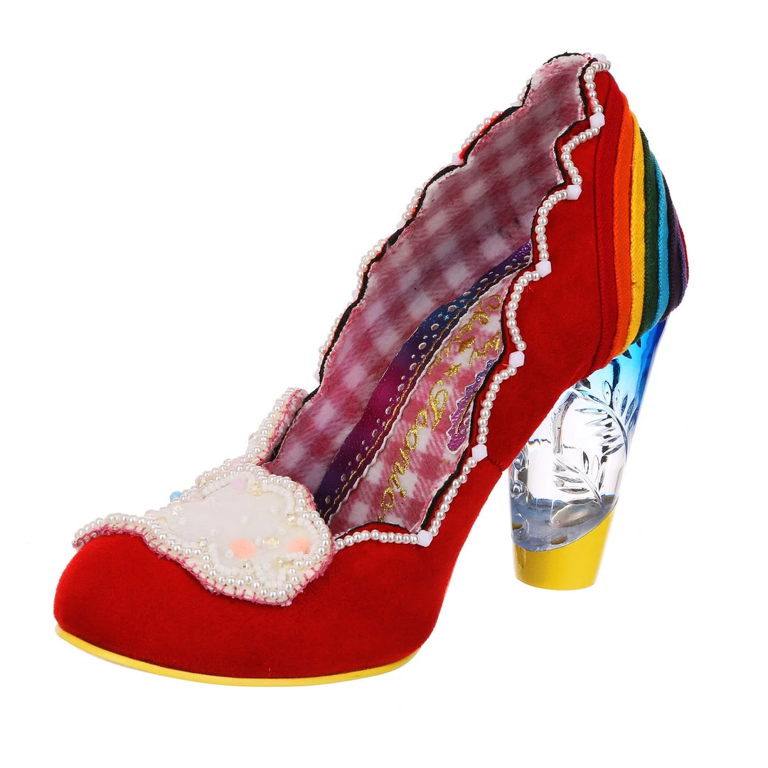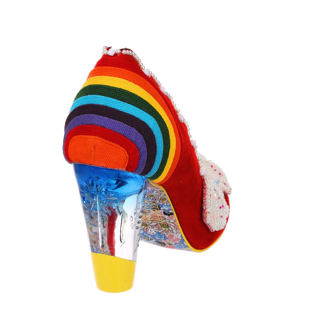Ready for a trip over the rainbow? Add some whimsy to your feet and fall head over heels for the gorgeous ‘Shirley Bass’ shoes! A perfect ruby red base is contrasted with a dazzling rainbow and darling clouds along the toe! All paired with our fabulous lucite heel, these are the pot of gold in any wardrobe!
