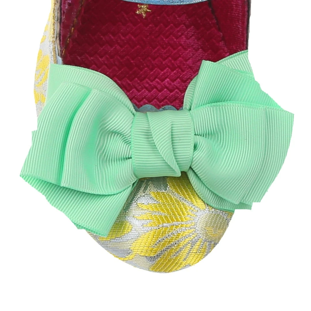Oh who doesn’t love our classic Summer Breeze mary jane style? These fan favourite mid heels are back, this time in a stunning yellow and silver brocade – accented with a lime green bow, and a teal metallic wrapped heel with matching back panelling. These vintage style shoes are bright, fun and fabulous!