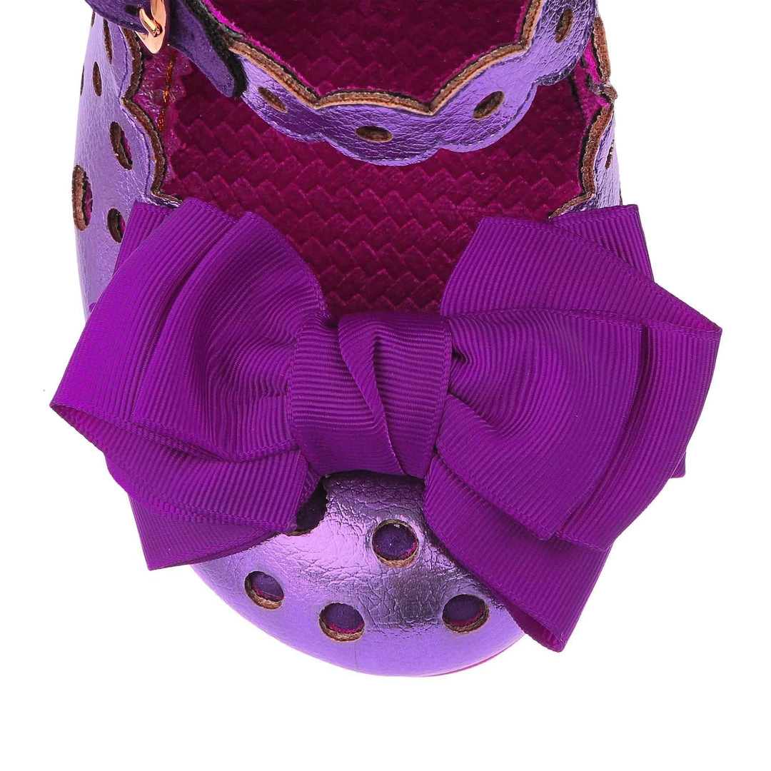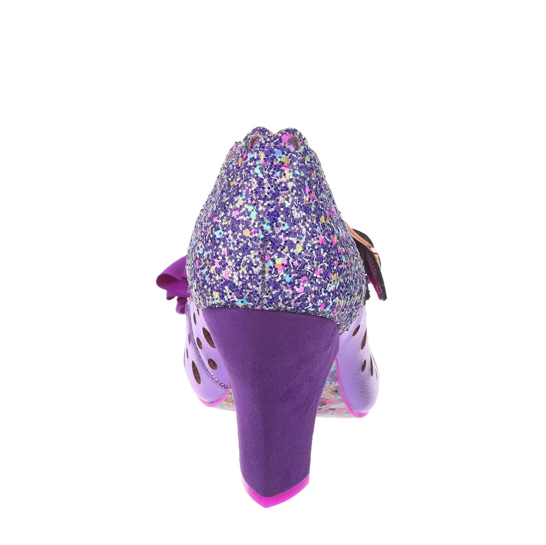 Dotty and fabulous, these heels are a great throwback style which we have reimagined for the season in stunning metallic purple, which has adorable holes cut into it in multiple diameters! Featuring a buckled Mary Jane strap in a matching finish, accented by the violet suedette heel and iridescent glitter panel on the heel. The toe bow is a gorgeous grosgrain ribbon layered beautifully, the perfect final touch!