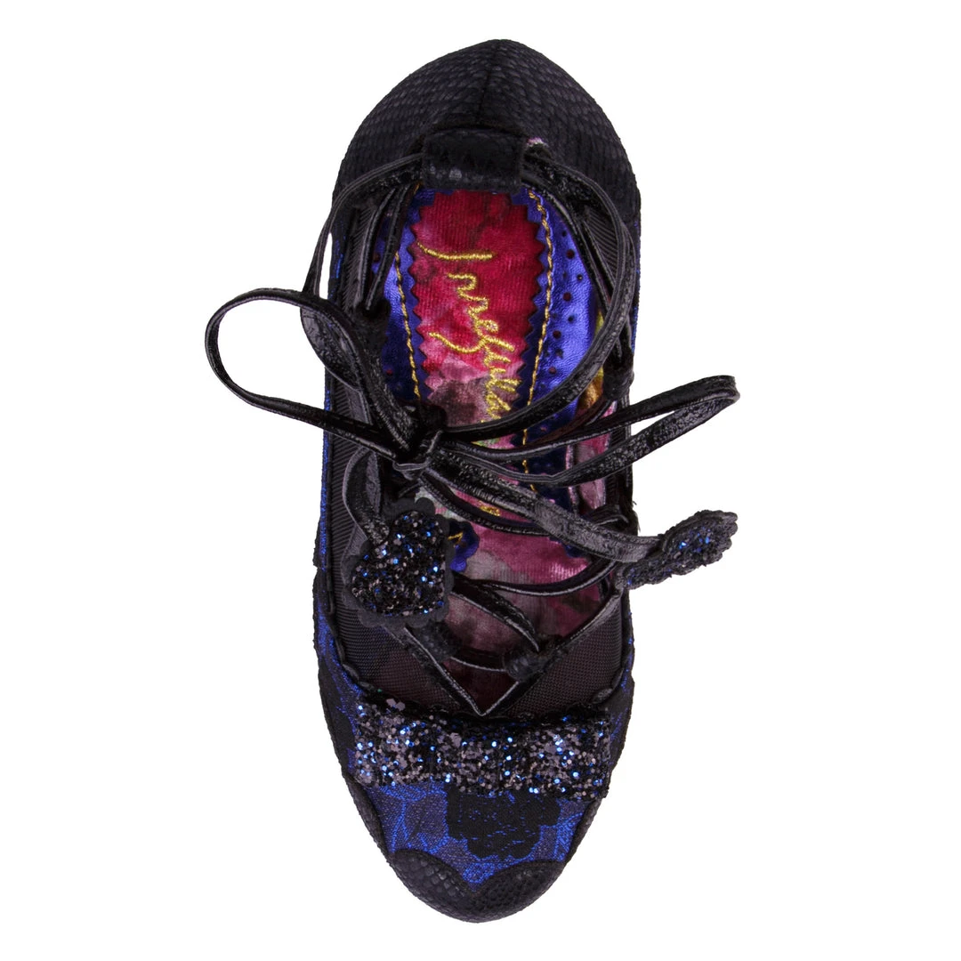 Live the VIP life in these luxurious heels! Classy black scalloping along the edge is combined with shimmering deep blue glitter and sumptuous black mesh. Ribbon wraps around the foot and is tied in a bow to create a super glamourous and elegant shoe! Get red carpet or living room carpet glam today!