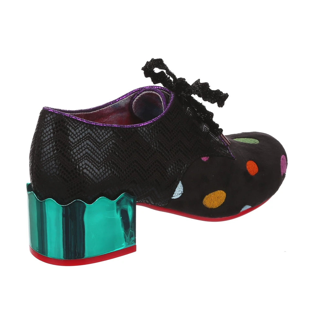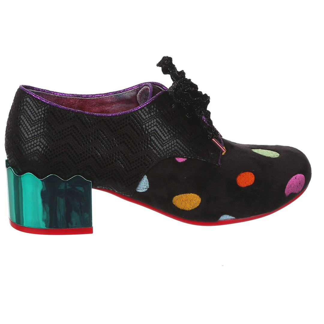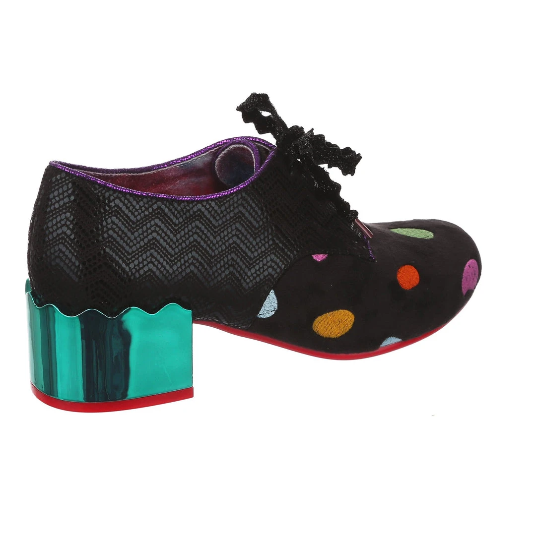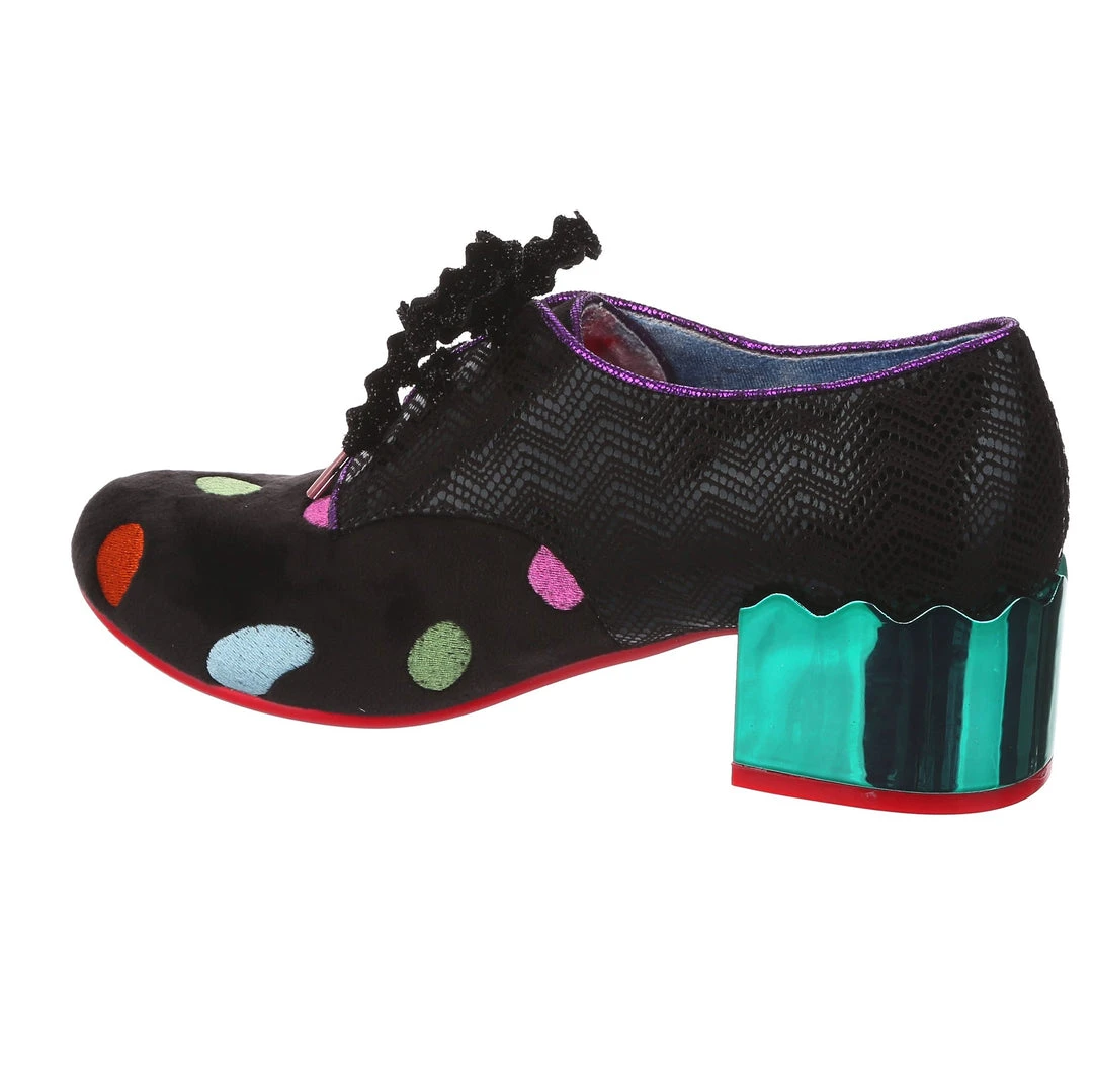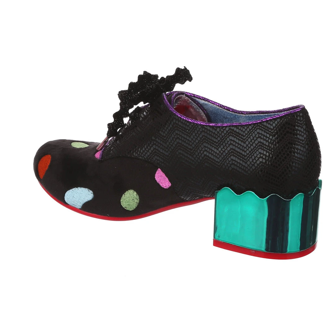 Something preppy with a twist! These lovely lace ups are the perfect little pair of wearable mid heels for any occasion! A slick black shimmer texture is paired with a sparkling matching rick rack lace, and a unique plush multicolour polkadot embroidered fabric on the toe. Statement chunky heels are finished in a high shine striking teal mirror gloss, meaning that you are sure to make a splash wherever you go. So what are you waiting for? Bring them home today!