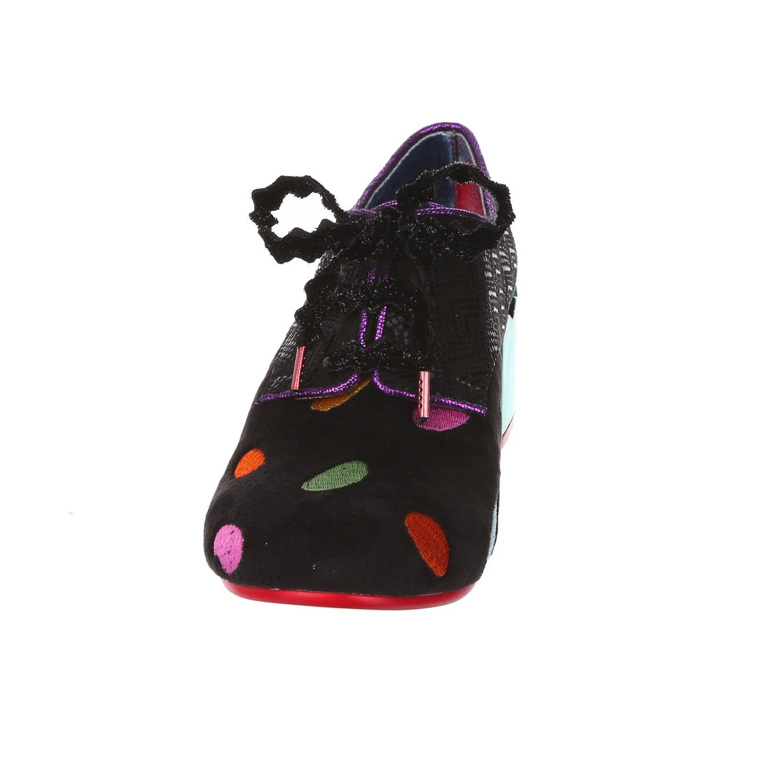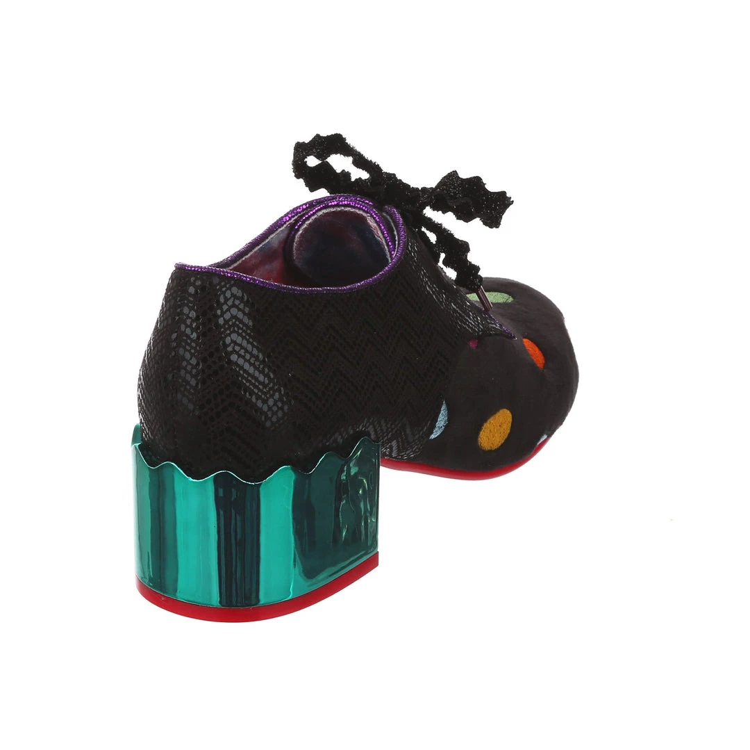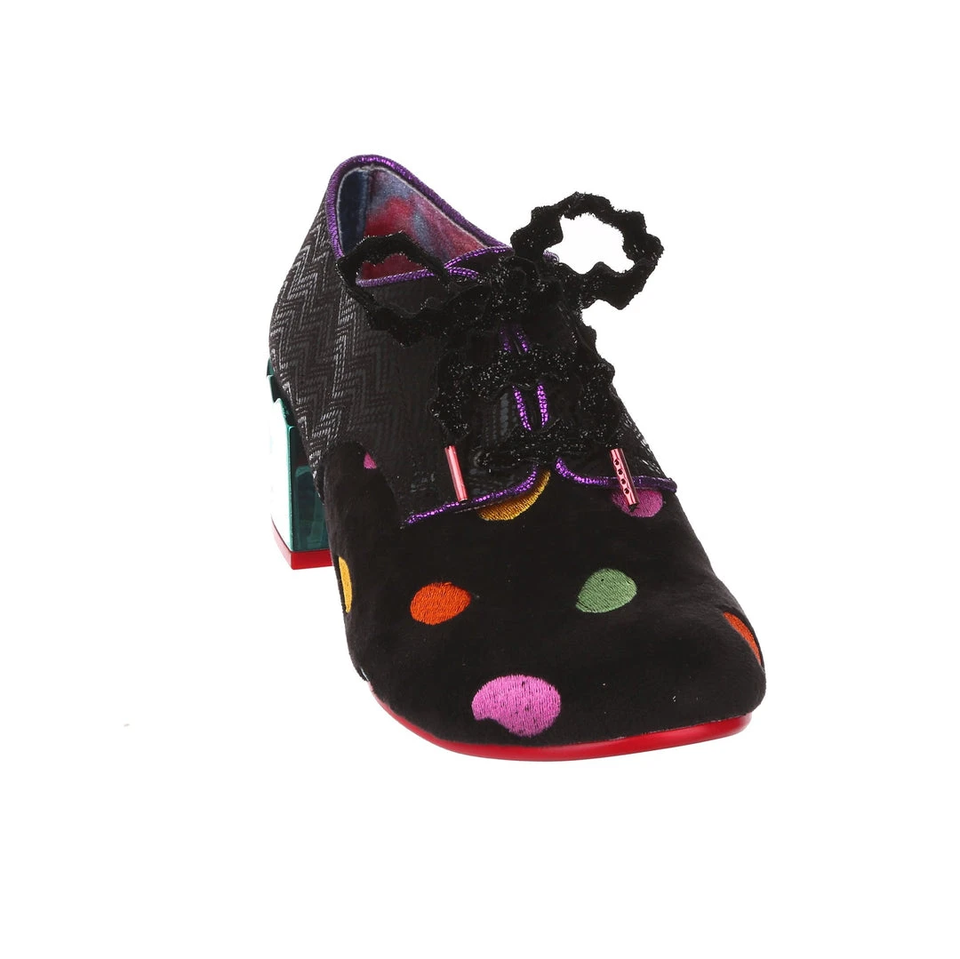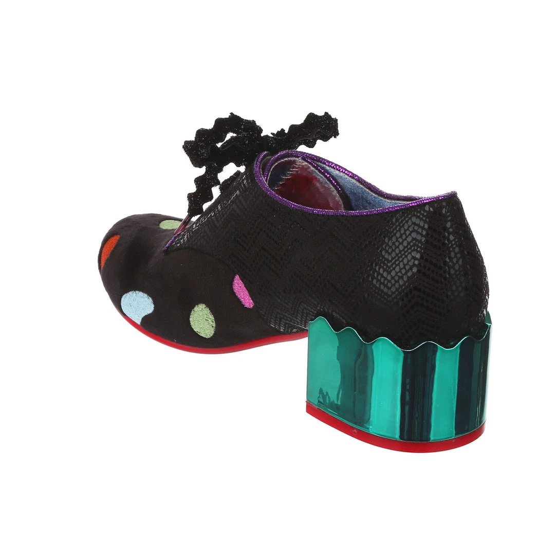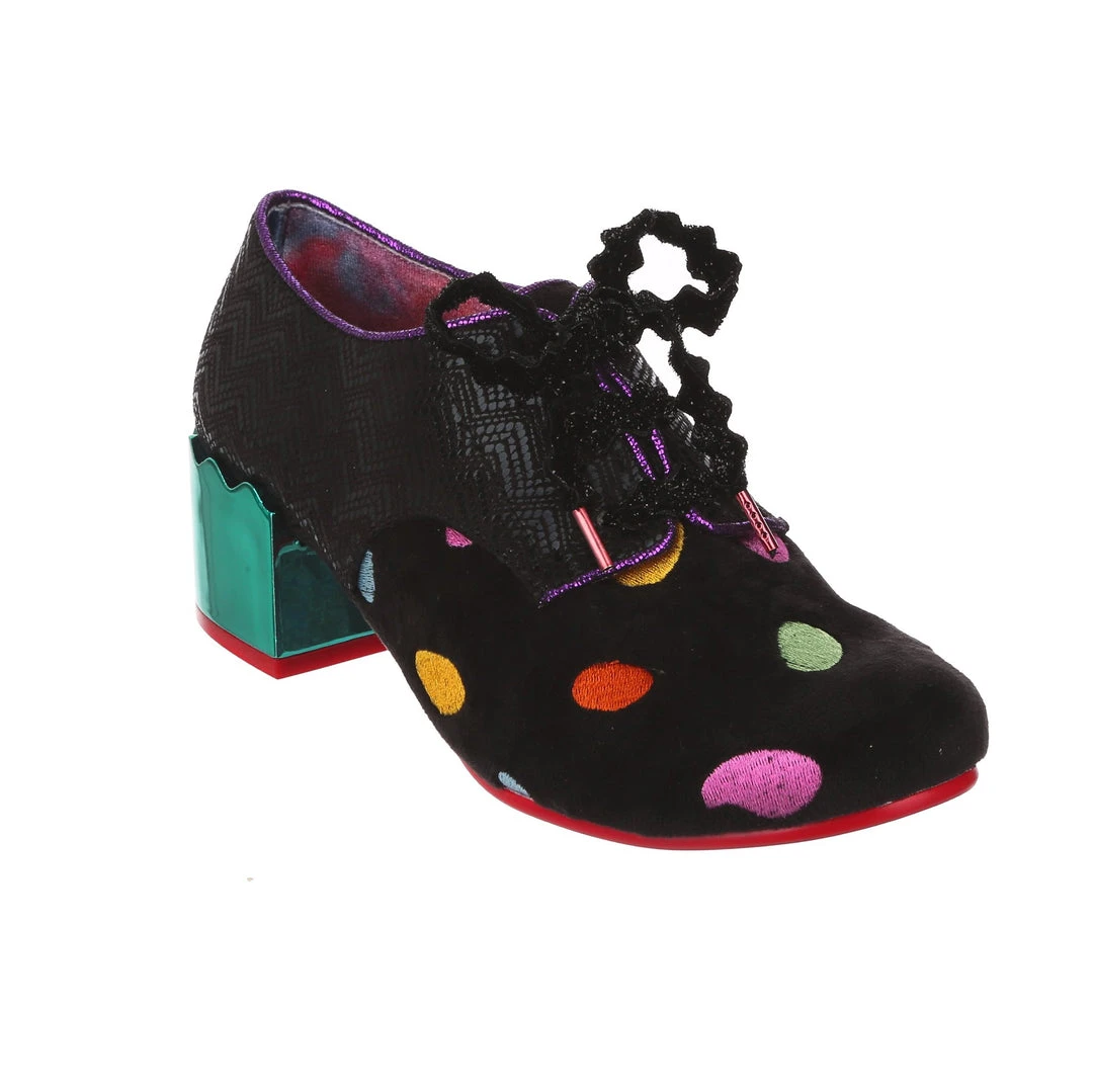 Something preppy with a twist! These lovely lace ups are the perfect little pair of wearable mid heels for any occasion! A slick black shimmer texture is paired with a sparkling matching rick rack lace, and a unique plush multicolour polkadot embroidered fabric on the toe. Statement chunky heels are finished in a high shine striking teal mirror gloss, meaning that you are sure to make a splash wherever you go. So what are you waiting for? Bring them home today!