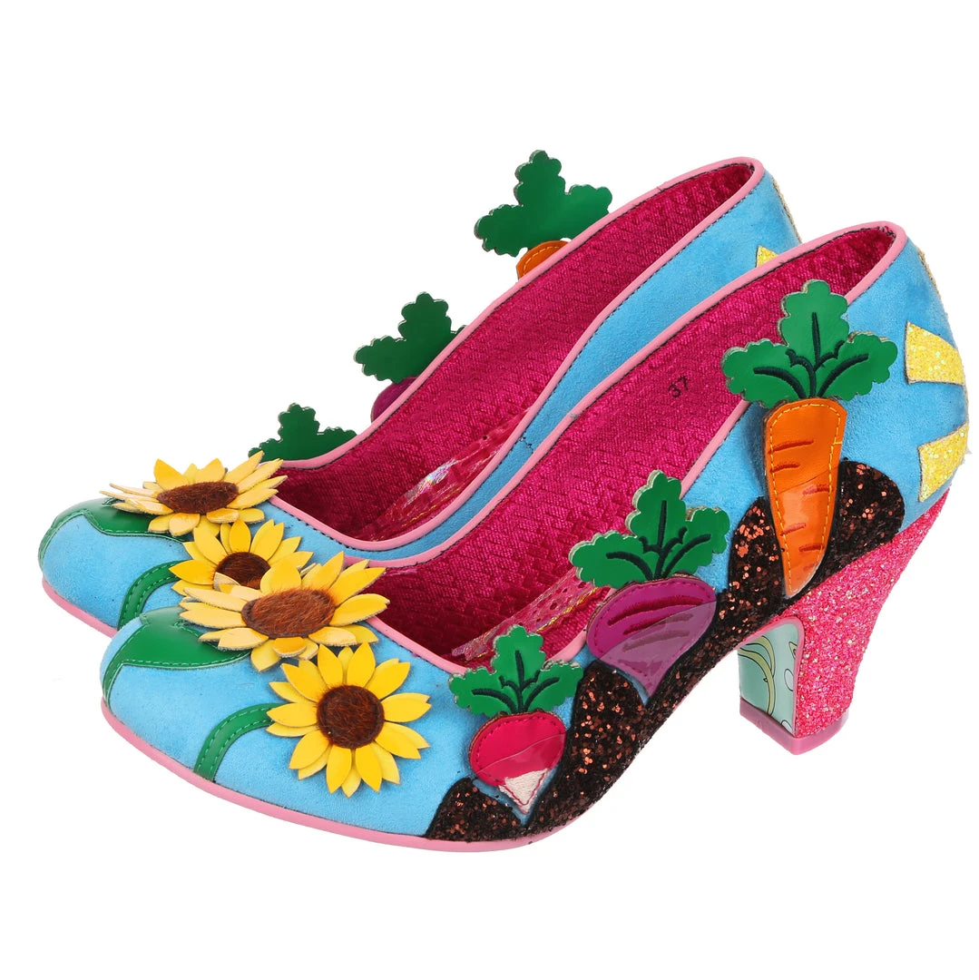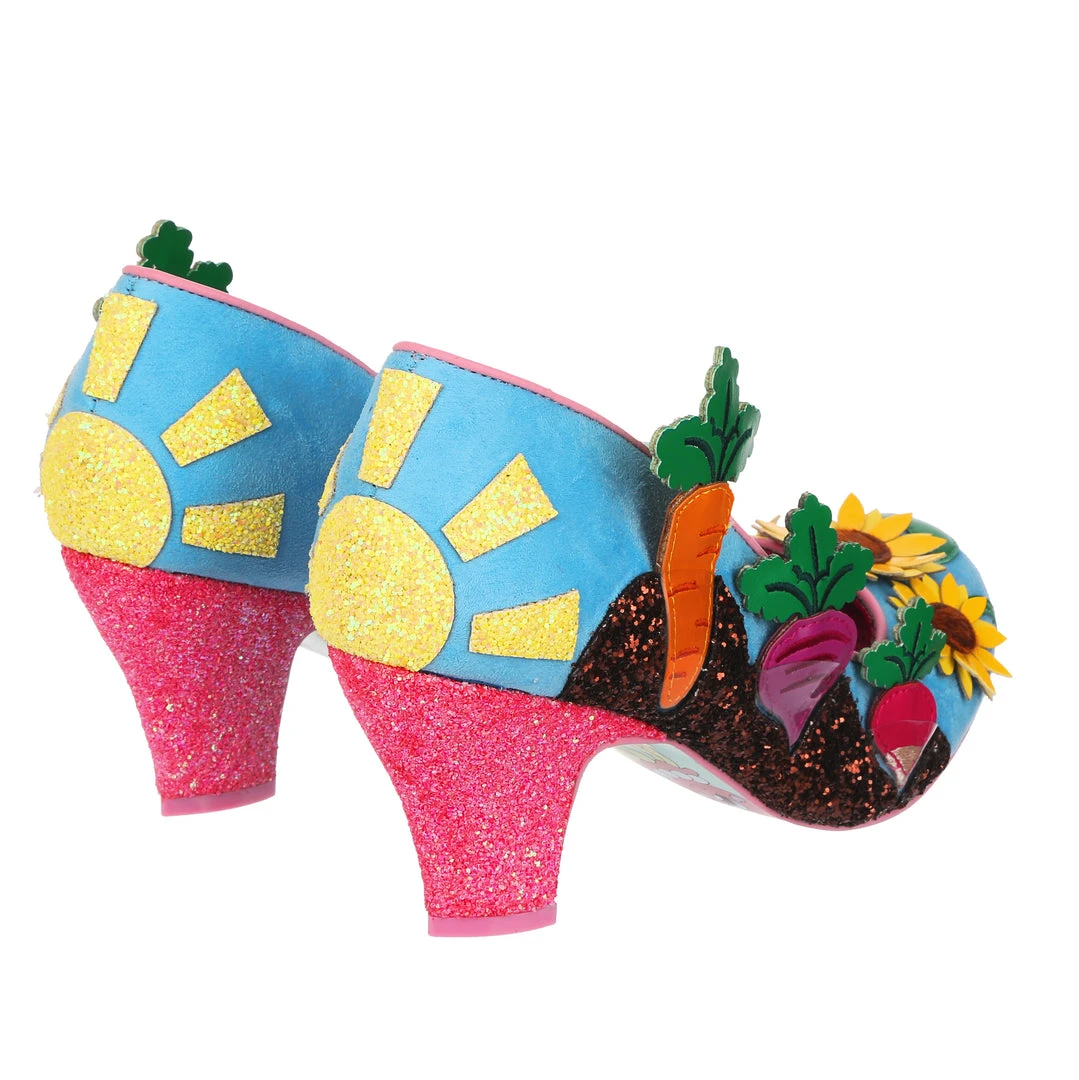 You are sure to win best in show with these allotment angels! Bright and fun, the blue suedette court shoes are embellished with 3D patent sunflowers, glittery soil and the star of the show – the removable veg! Sure to start conversations and great to grow any look to the next level, don’t miss out on these in your 5-a-day!