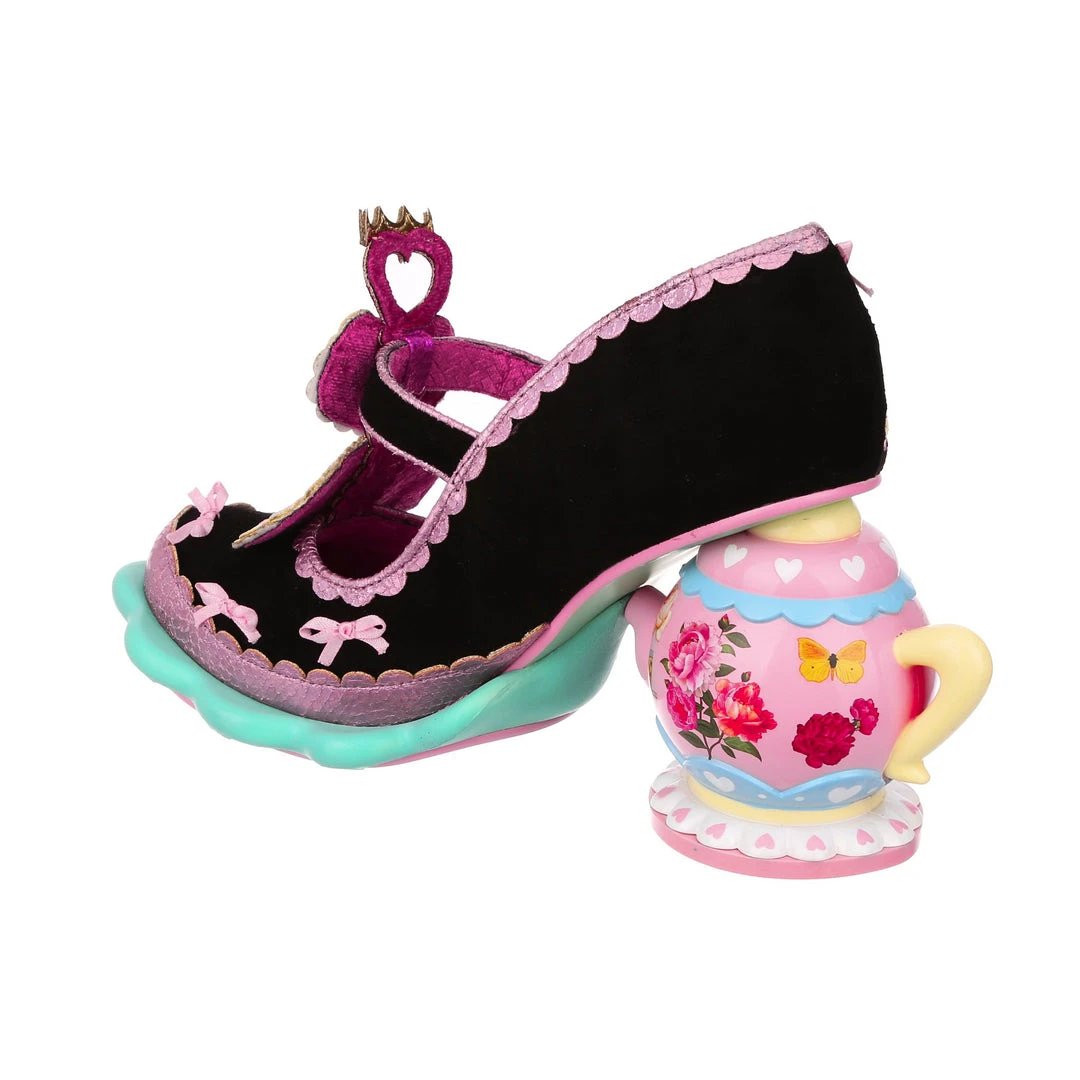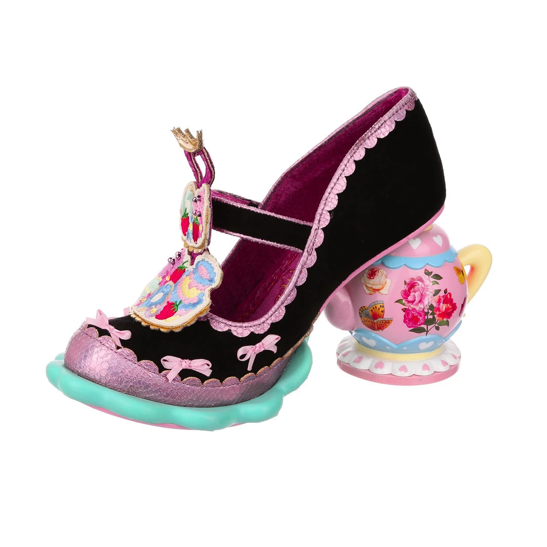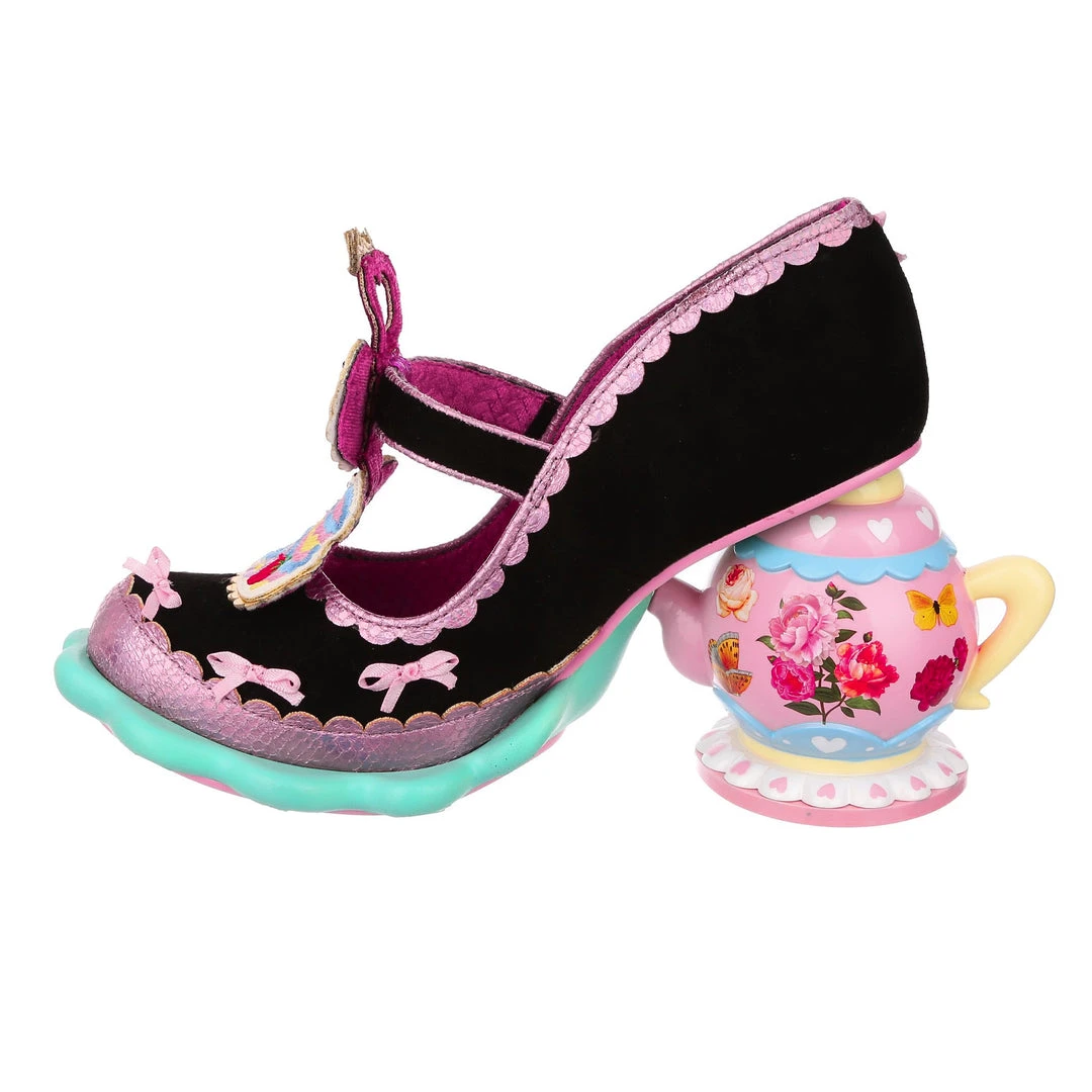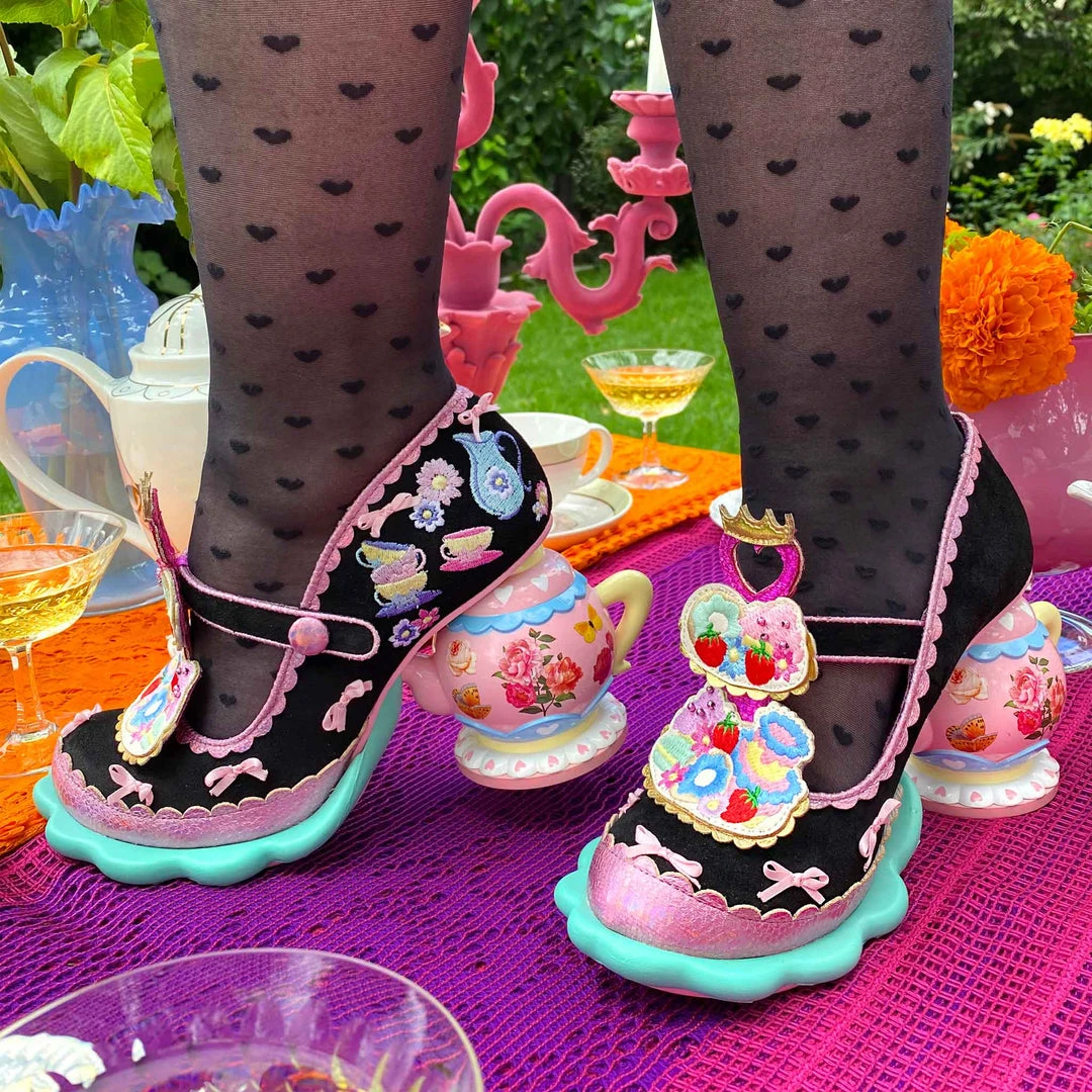 Who’s for a spot of tiffin? Hit the sweet spot in these statement heels! The gorgeous black upper is embroidered with adorable afternoon tea supplies, and dotted with tiny little bows which lead up to the fabulous decoration on the T-Bar strap! Detailed and gorgeous embellished cakes and treats sit on the front of your foot and look good enough to eat, and if you need something to wash that down then take a look at the heel! Our newest fabulous concept heel is shaped like a teapot! Fabulously detailed with a floral design, this pink teapot is spilling out teal tea which forms the sole on these showstoppers!