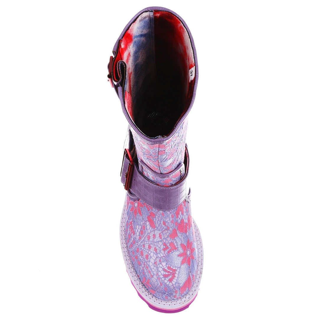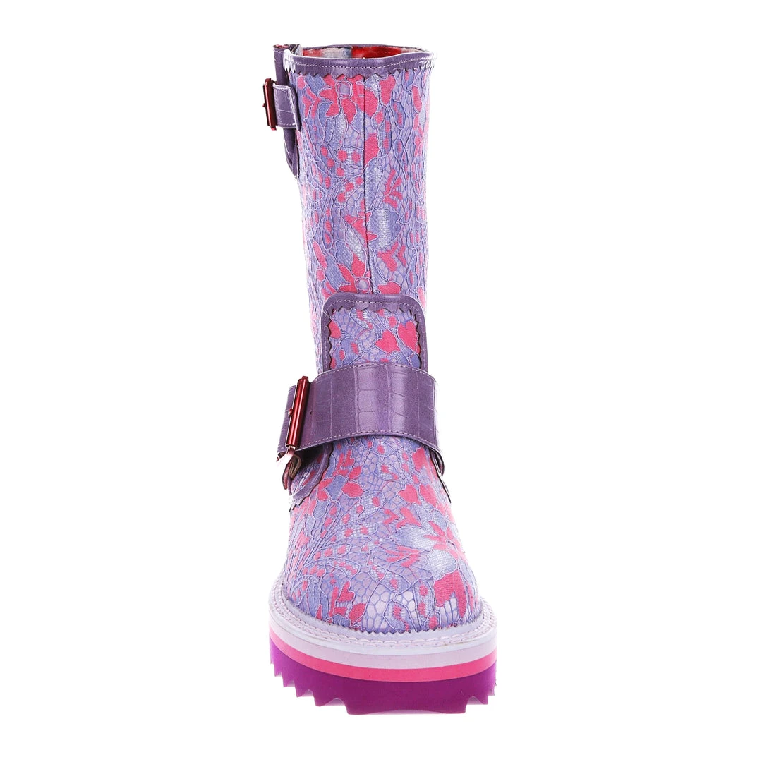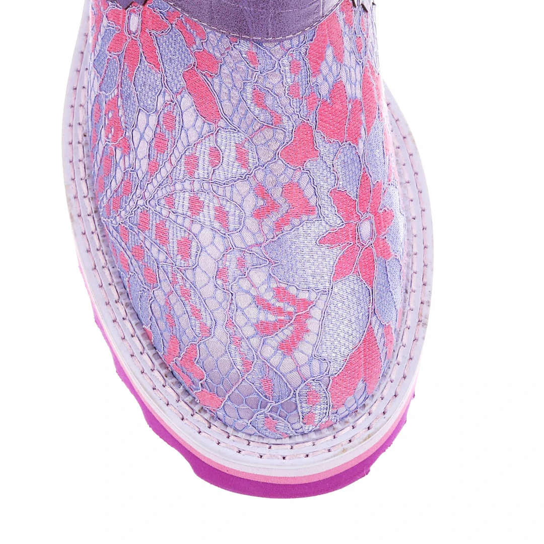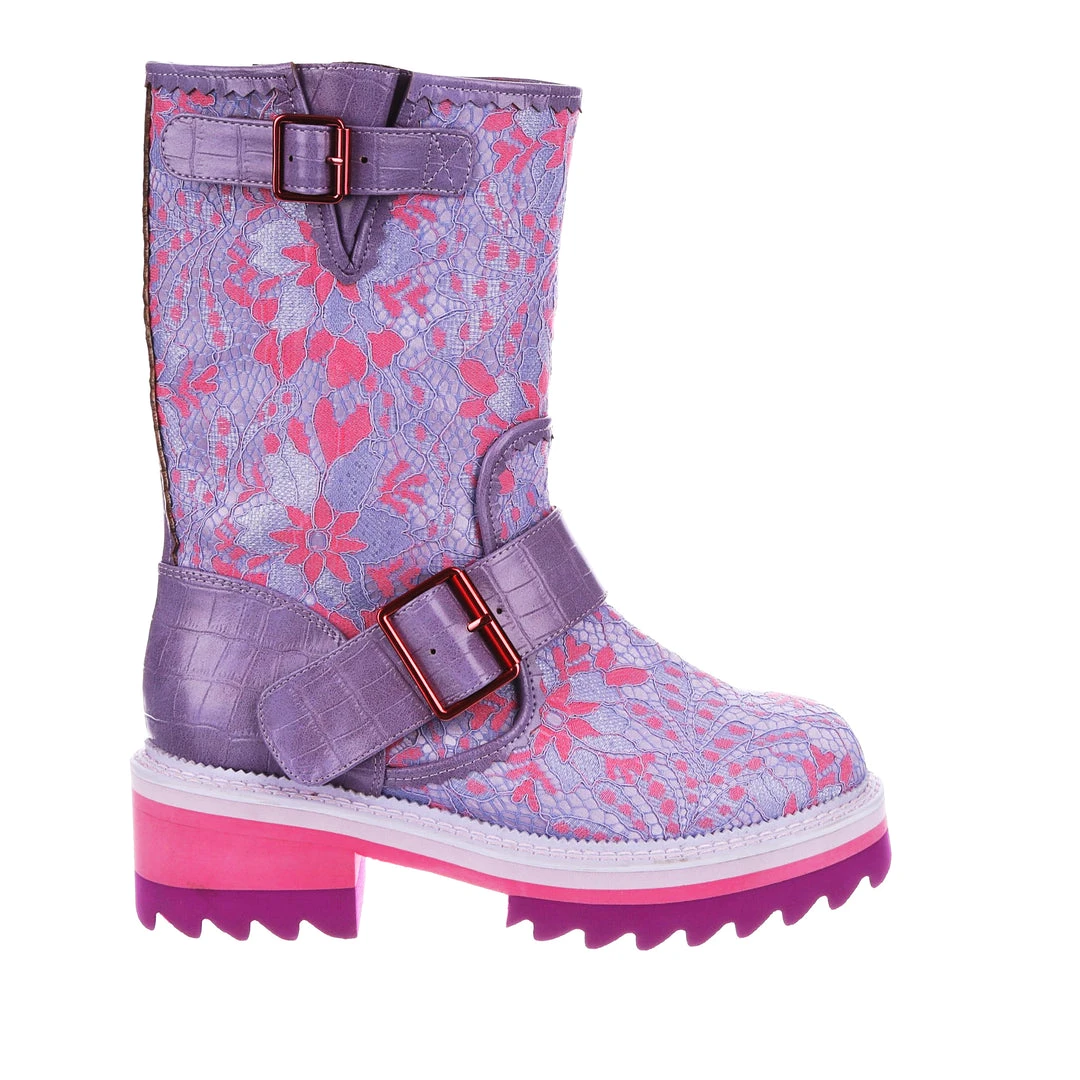 Perfect for those chilly walks, these boots are here to infuse some fun into your wardrobe for the colder months! Featuring a bright lilac and baby pink floral fabric, accented with lavender crocodile texture and rose gold buckles – these boots are sure to take any outfit to the next level! The chunky tread means that they are super comfortable and also create a great impact when worn! Perfect to pair with some fun tights or snazzy trousers, add them to your life today!