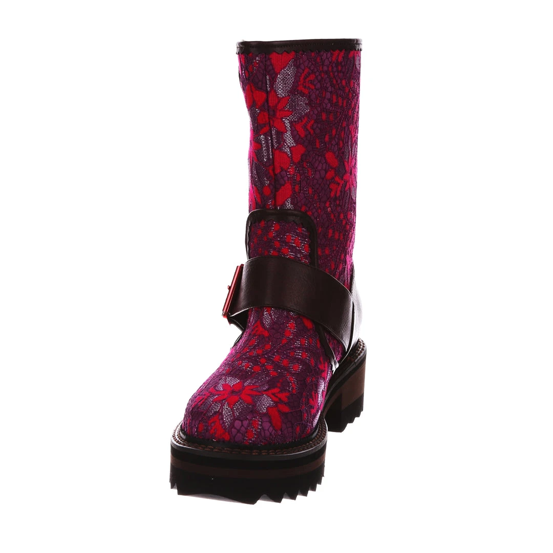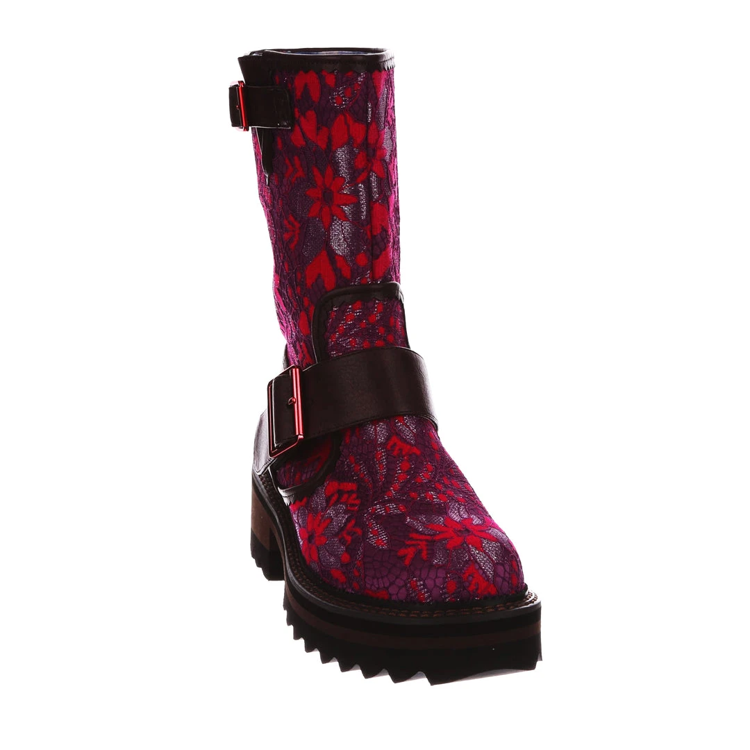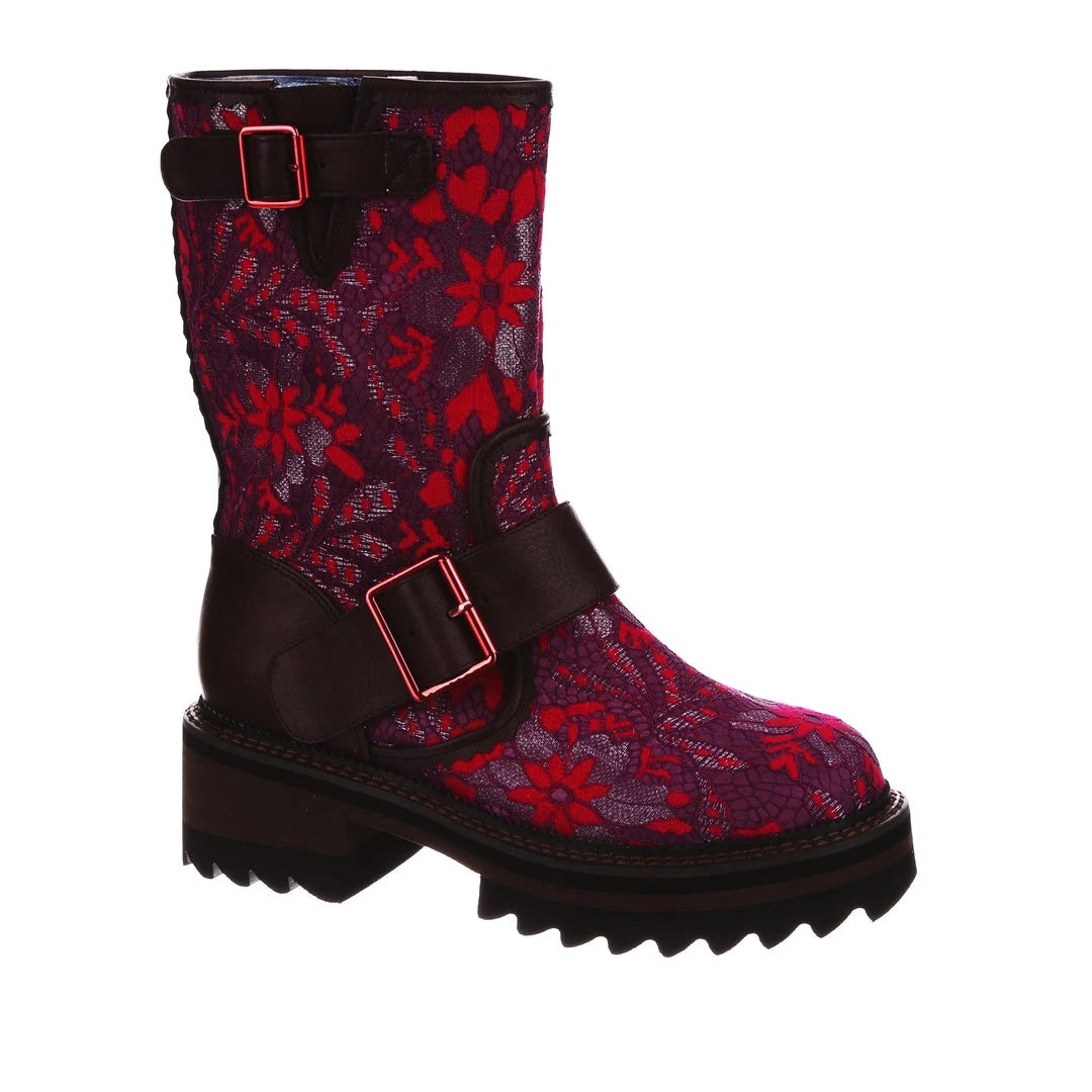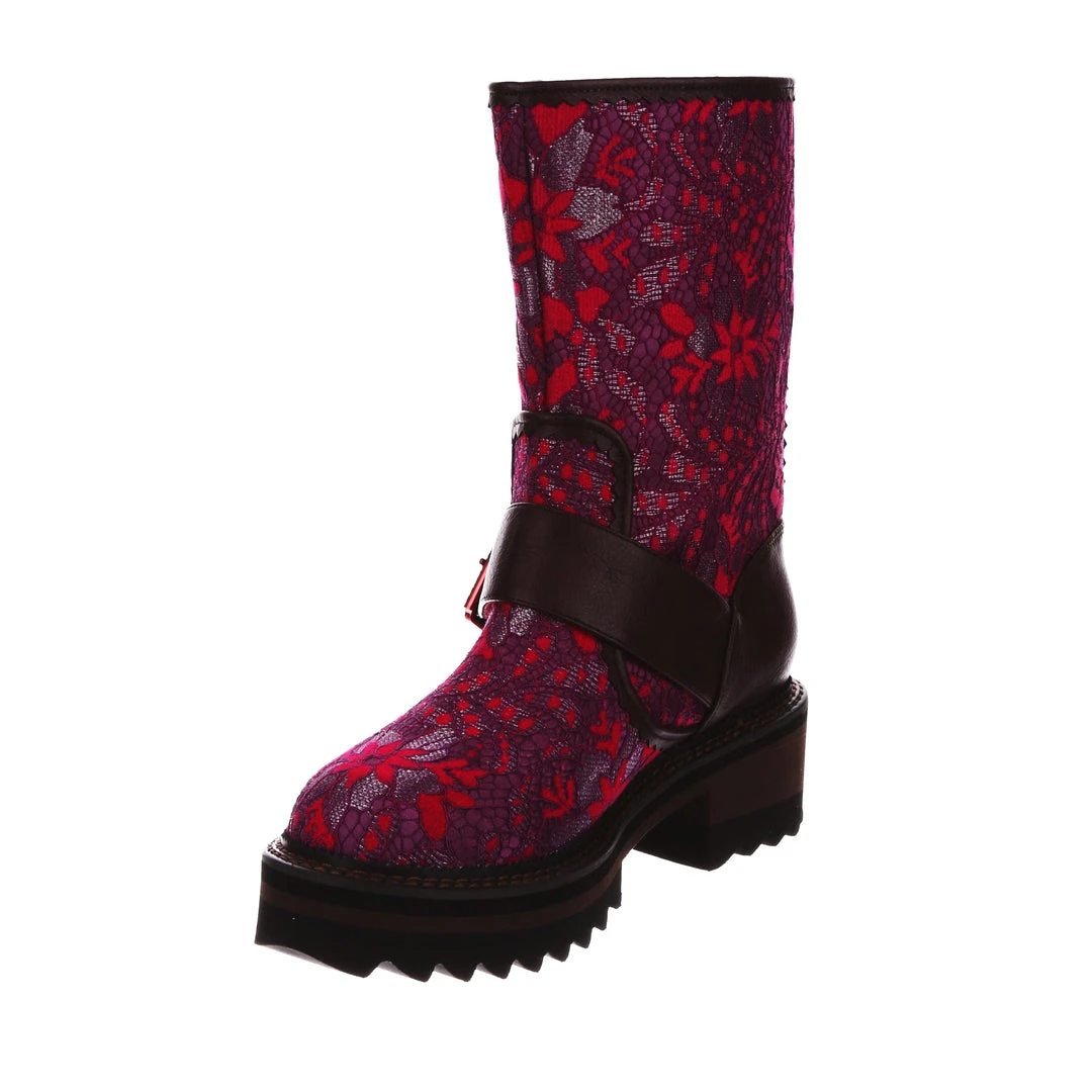 Perfect for those chilly walks, these boots are here to infuse some fun into your wardrobe for the colder months! Featuring a striking purple and hot pink floral fabric, accented with an aubergine leather texture and rose gold buckles – these boots are sure to take any outfit to the next level! The chunky tread means that they are super comfortable and also create a great impact when worn! Perfect to pair with some fun tights or snazzy trousers, add them to your life today!