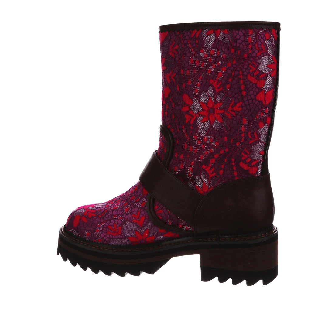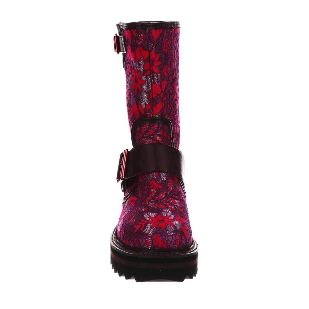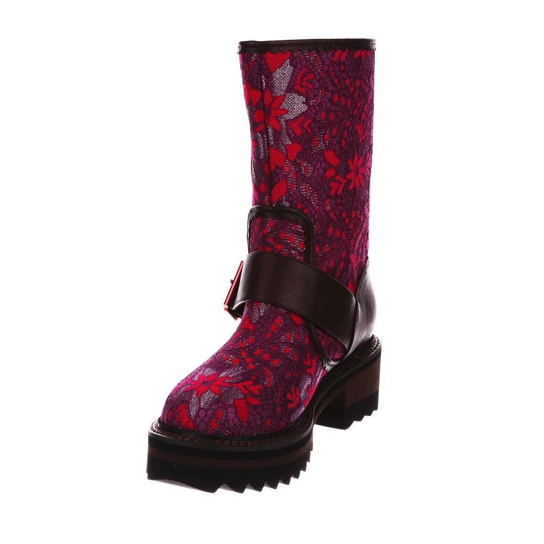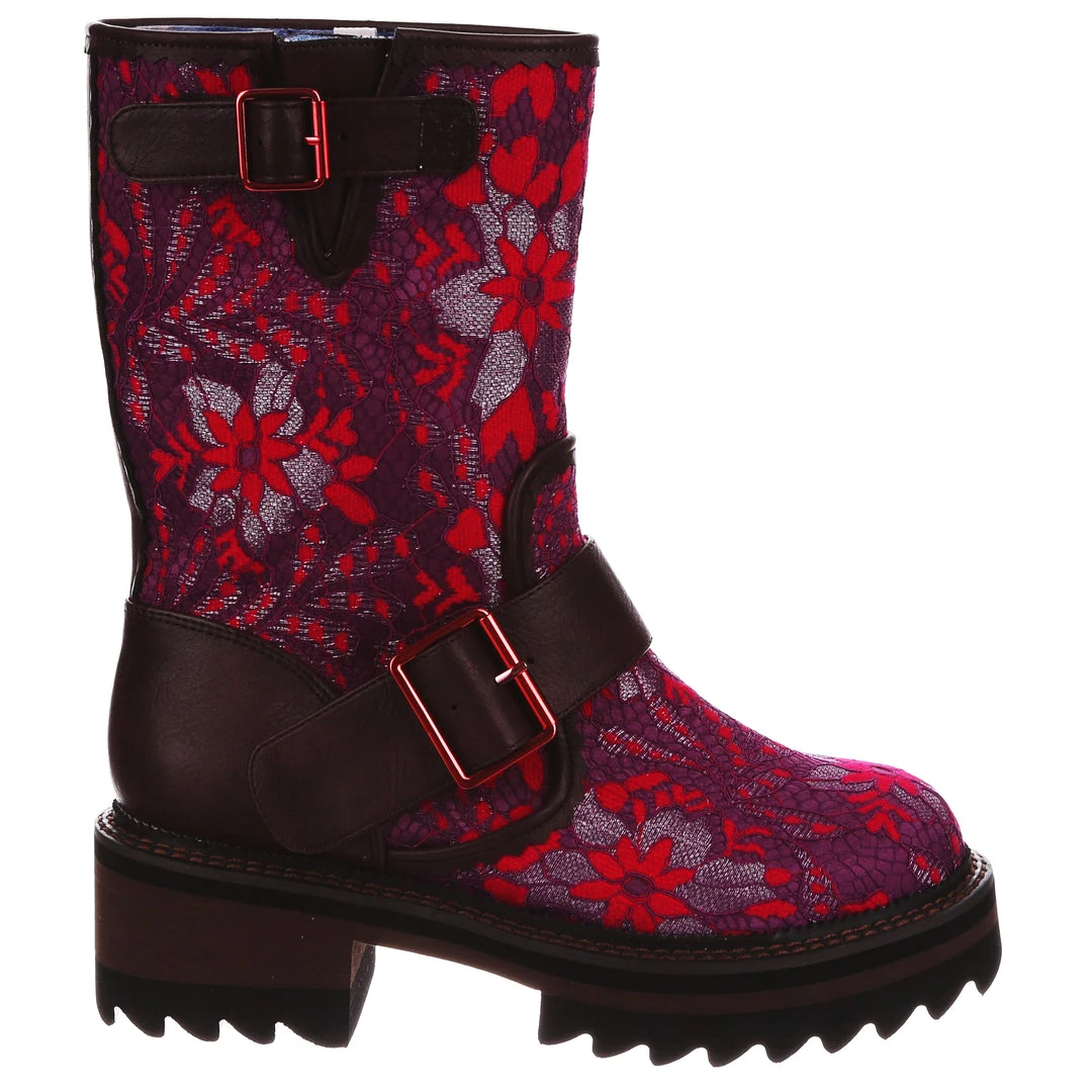 Perfect for those chilly walks, these boots are here to infuse some fun into your wardrobe for the colder months! Featuring a striking purple and hot pink floral fabric, accented with an aubergine leather texture and rose gold buckles – these boots are sure to take any outfit to the next level! The chunky tread means that they are super comfortable and also create a great impact when worn! Perfect to pair with some fun tights or snazzy trousers, add them to your life today!