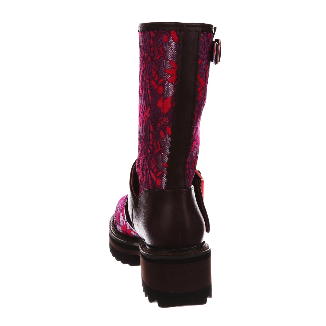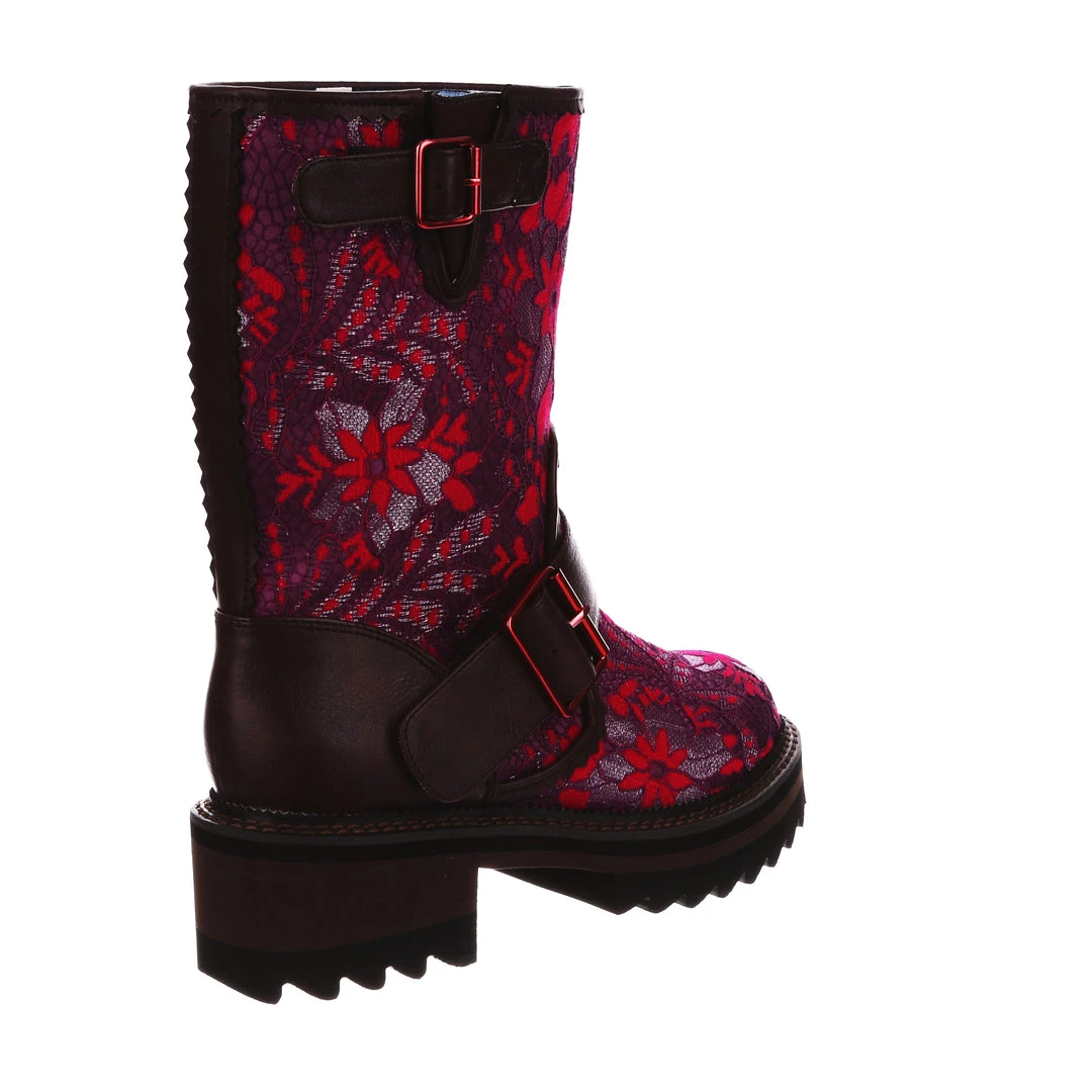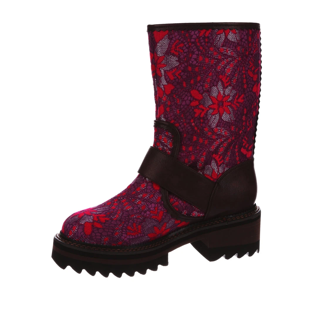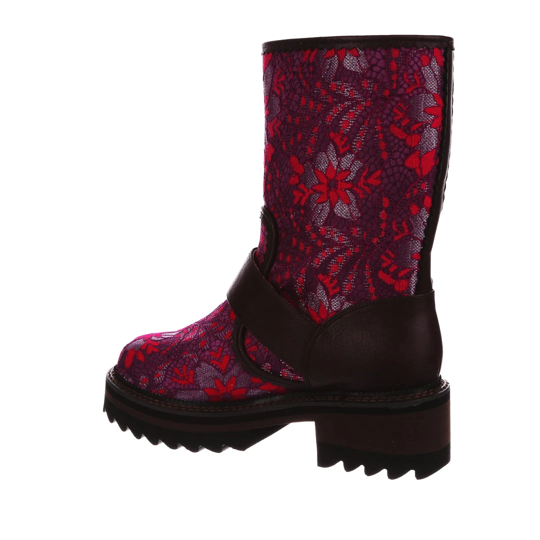 Perfect for those chilly walks, these boots are here to infuse some fun into your wardrobe for the colder months! Featuring a striking purple and hot pink floral fabric, accented with an aubergine leather texture and rose gold buckles – these boots are sure to take any outfit to the next level! The chunky tread means that they are super comfortable and also create a great impact when worn! Perfect to pair with some fun tights or snazzy trousers, add them to your life today!