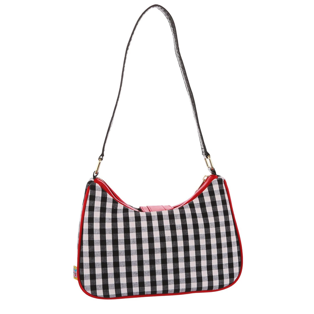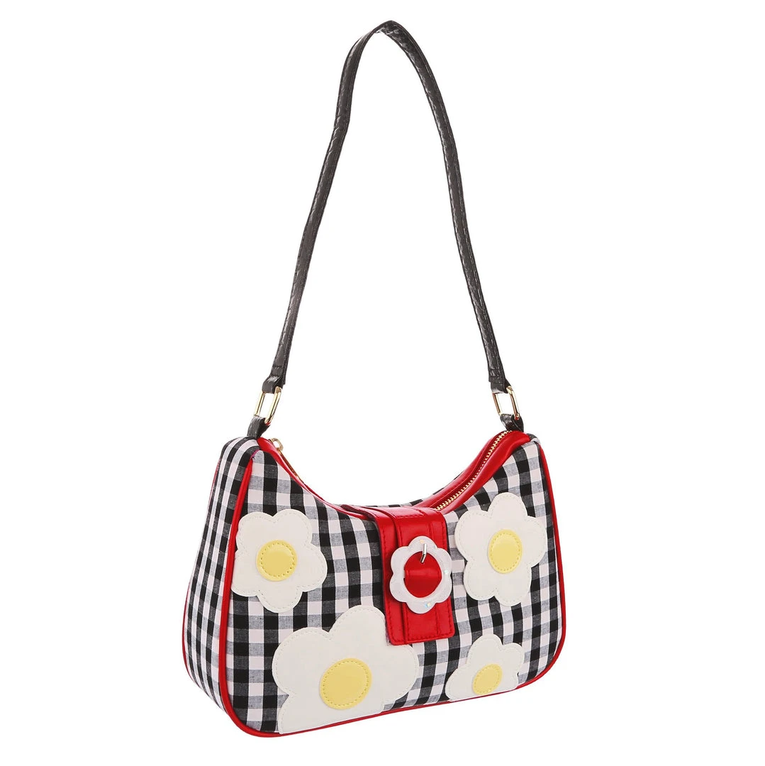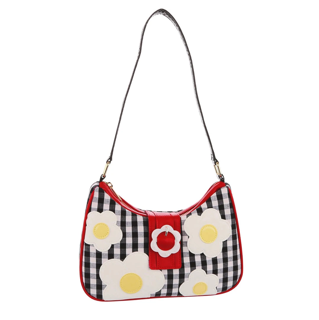 Oh daisy daisy! Perfect your picnic attire with this black and white gingham shoulder bag covered in adorbs white daisy appliques, finished with contrasting red piping and gusset. Fastened with a zip and a fold over magnetic popper which is decorated with a white daisy shaped buckle. Don’t forget to pick this daisy today!