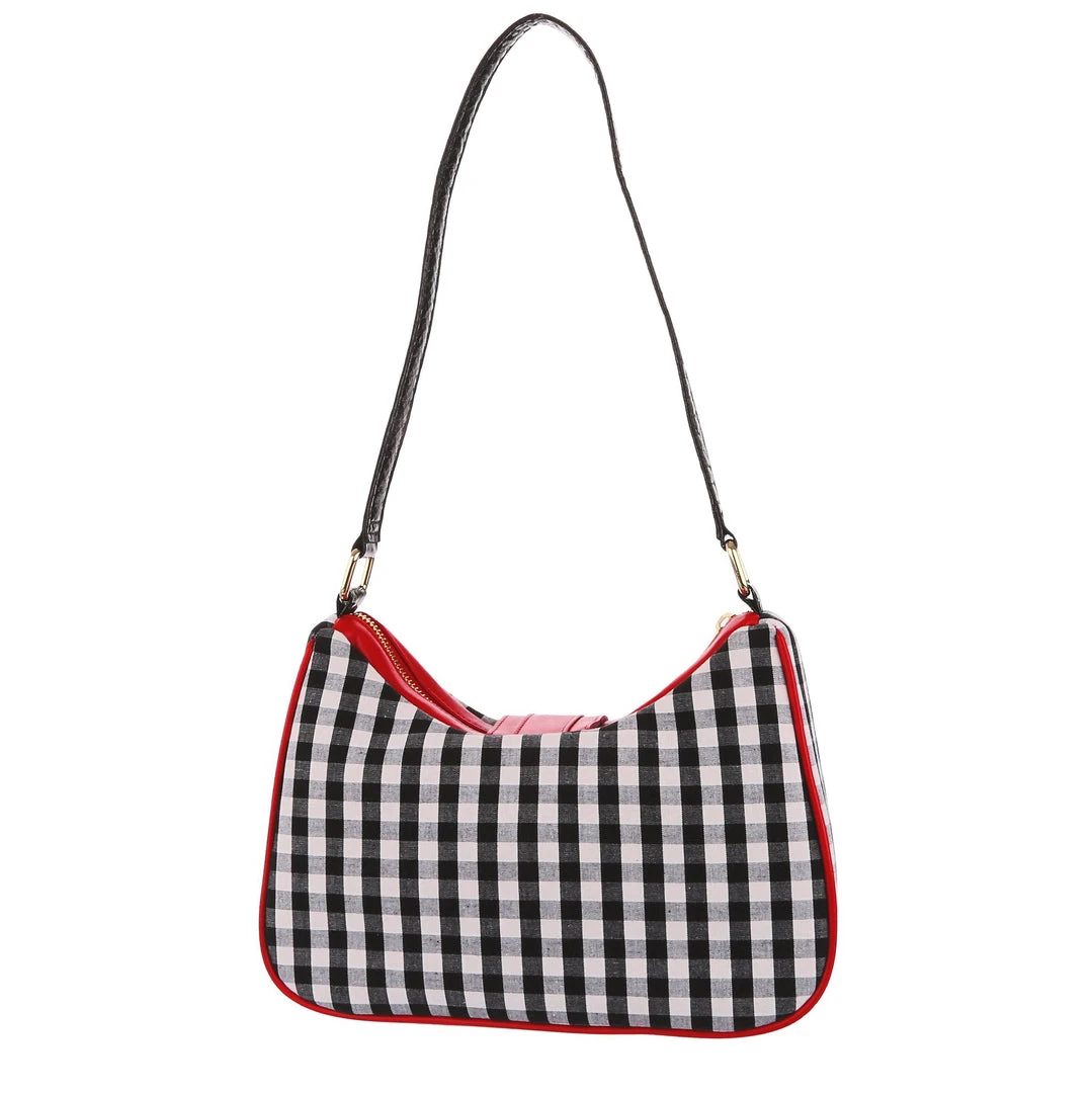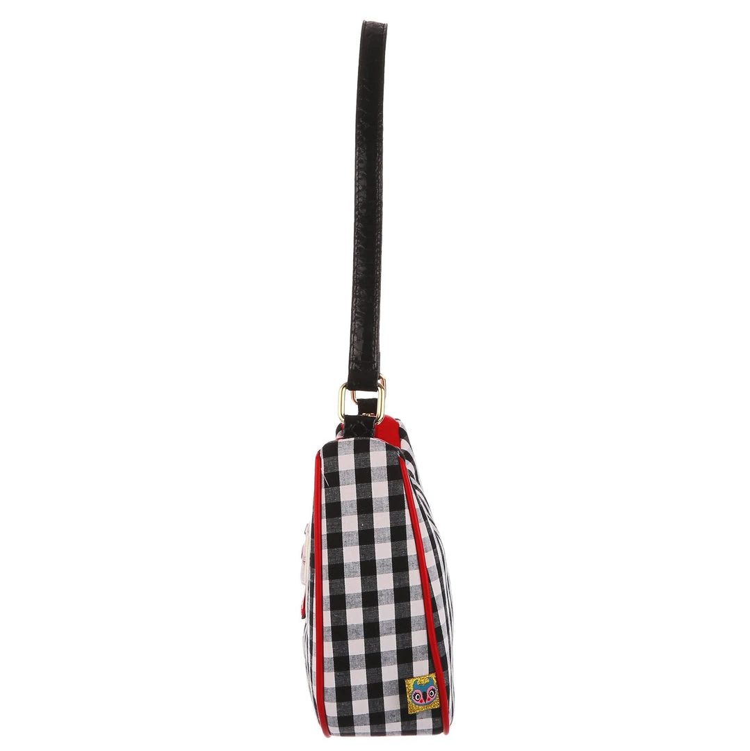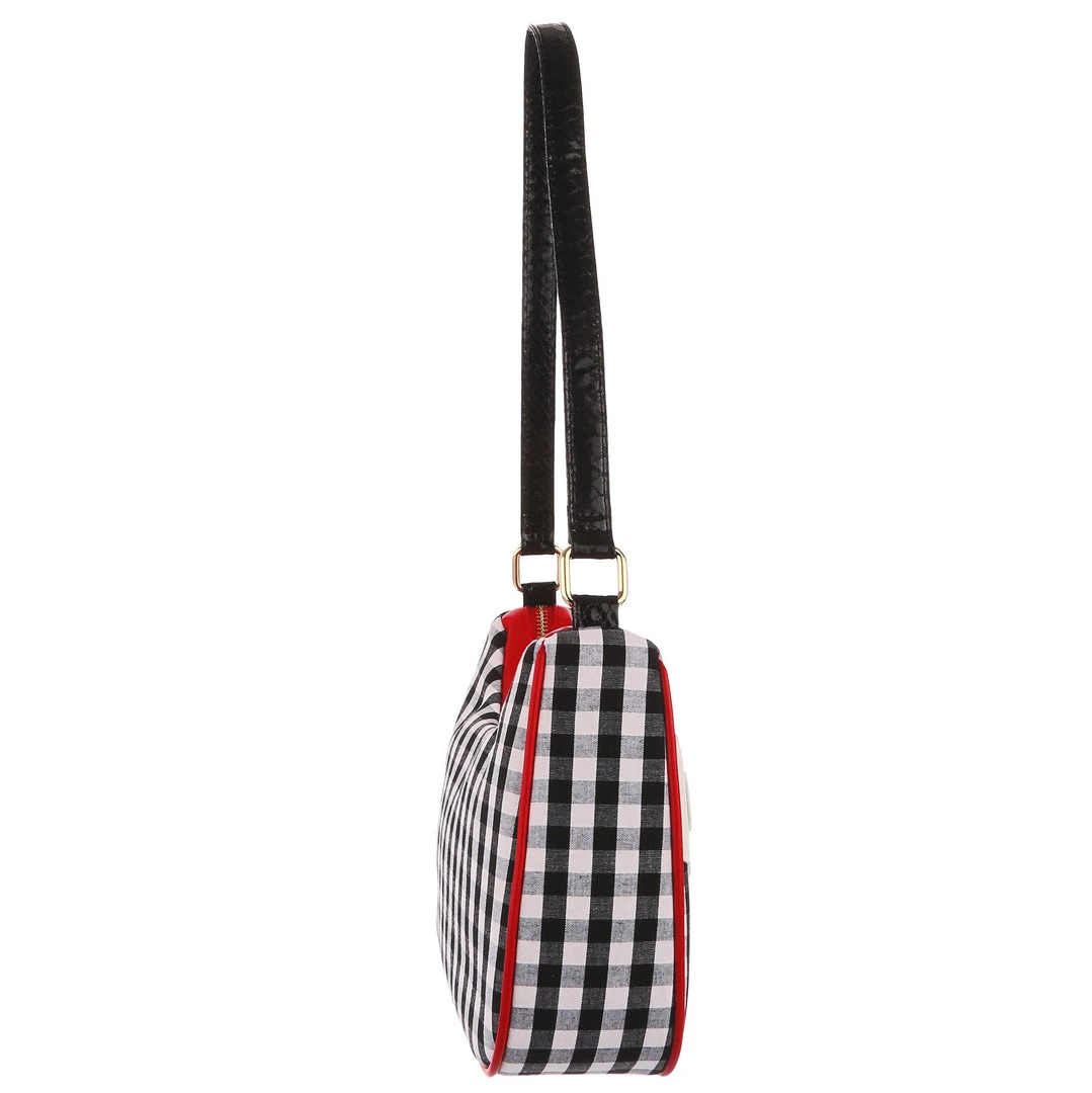 Oh daisy daisy! Perfect your picnic attire with this black and white gingham shoulder bag covered in adorbs white daisy appliques, finished with contrasting red piping and gusset. Fastened with a zip and a fold over magnetic popper which is decorated with a white daisy shaped buckle. Don’t forget to pick this daisy today!