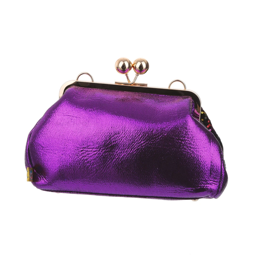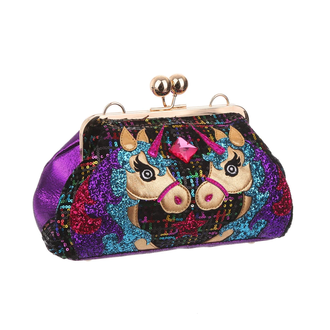 Shine bright like a unicorn! Transport your precious things to a magical unicorn kingdom with this IC classic Magic Pony bag. A double image of sparkly Misty the unicorn sits on a shiny rainbow sequin fabric with a large pink gemstone in the centre. Fastened with a ball clasp, this doctors style handbag also comes with an adjustable shoulder strap that matches the metallic purple reverse. Travel far and wide with this enchanting must-have accessory!