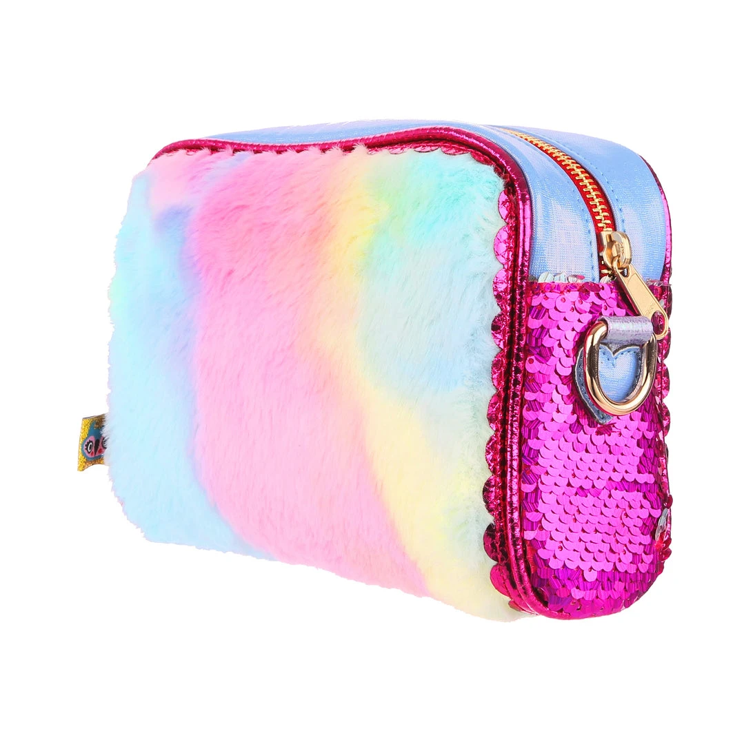 Blossom into your best bunny bliss! This small rectangular bag pastel bunny print from SS17 archives with colourful candy stripes and a pink metallic heart embroidered with ‘No bunny compares to you’ in gold. With a fluffy rainbow reverse and metallic scalloped edging and piping with a matching removable shoulder strap. Feel like the bunny that got all the carrots with this bag!