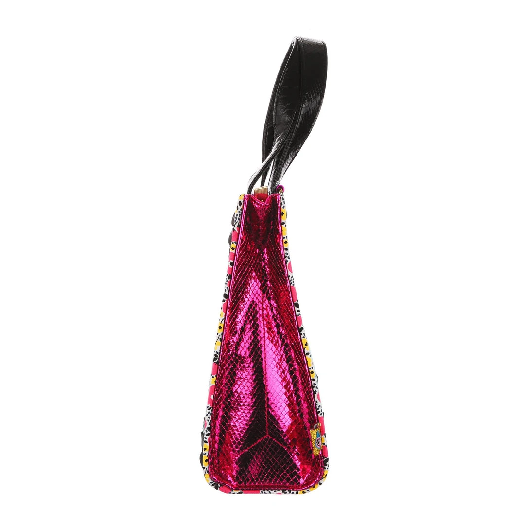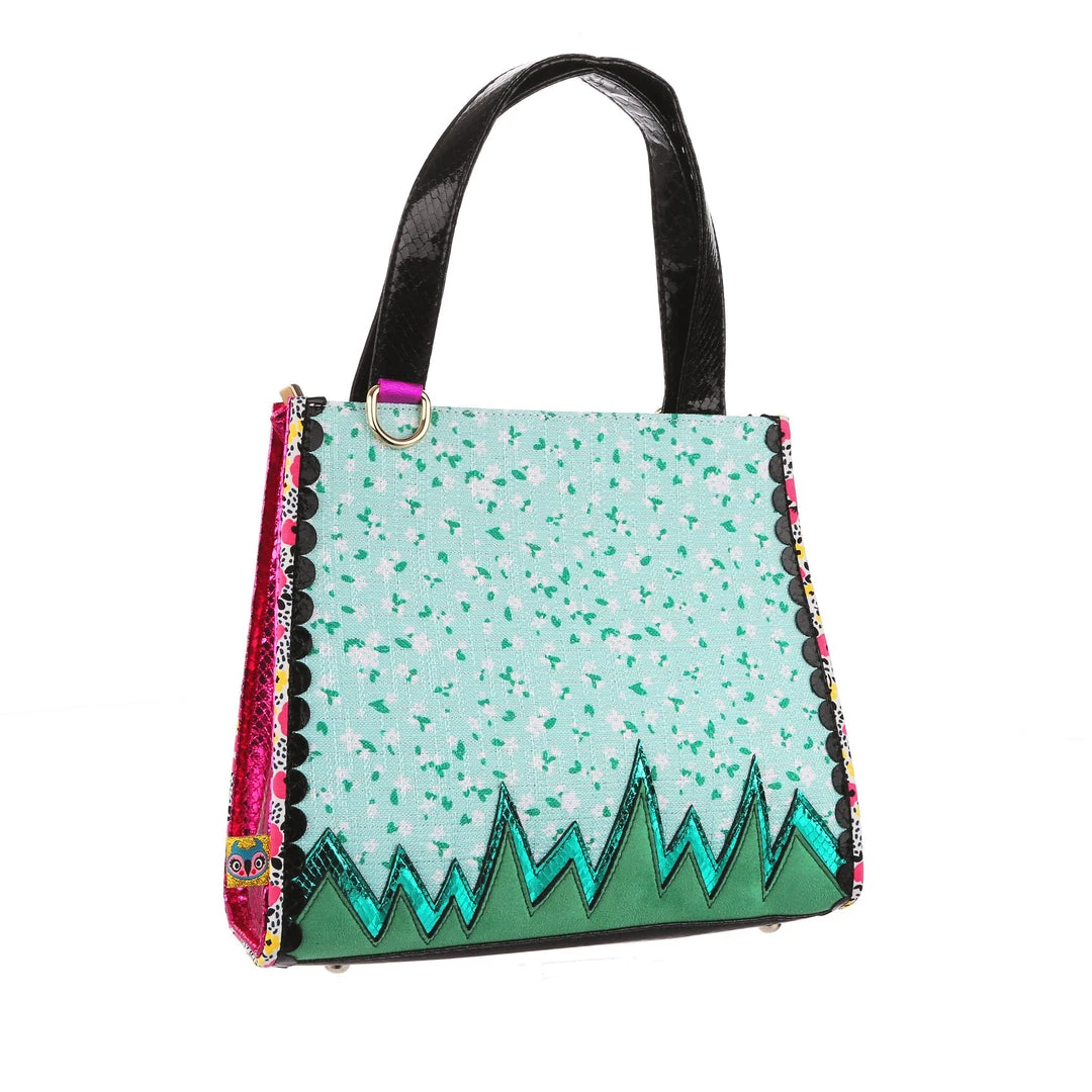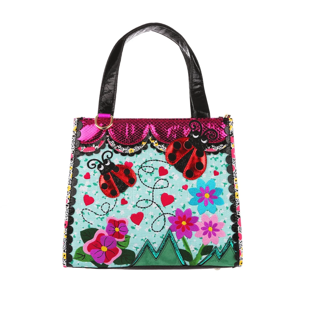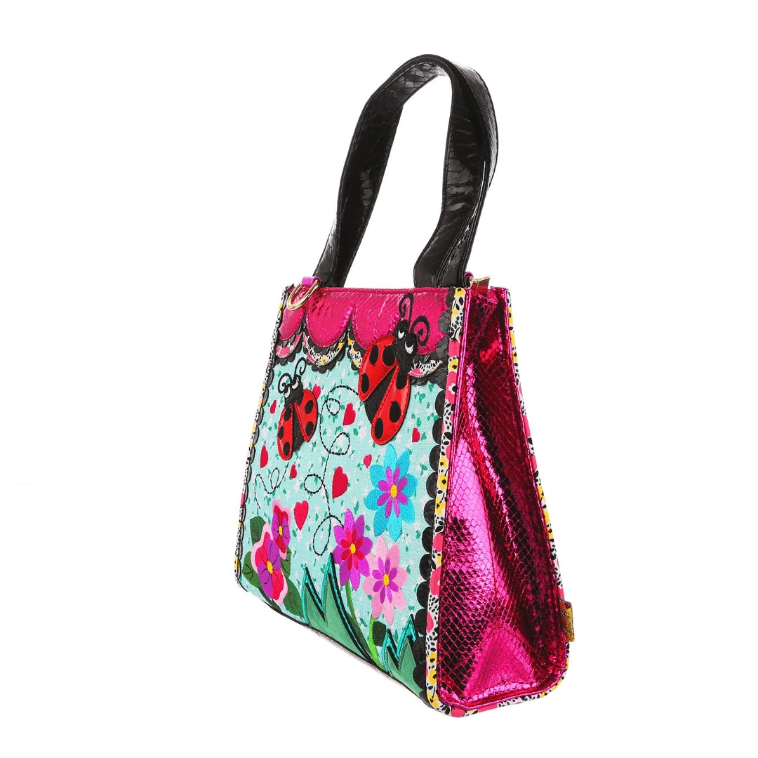 Flutter your wings with a lovely little ladybug! Fabulous teal floral handbag with swirling lines leading to the adorable red ladybug appliques who are flying above lovely embroidered flowers. Finished with a scalloped top edge in metallic pink and black and fastened with a zip to keep all your items safe!
