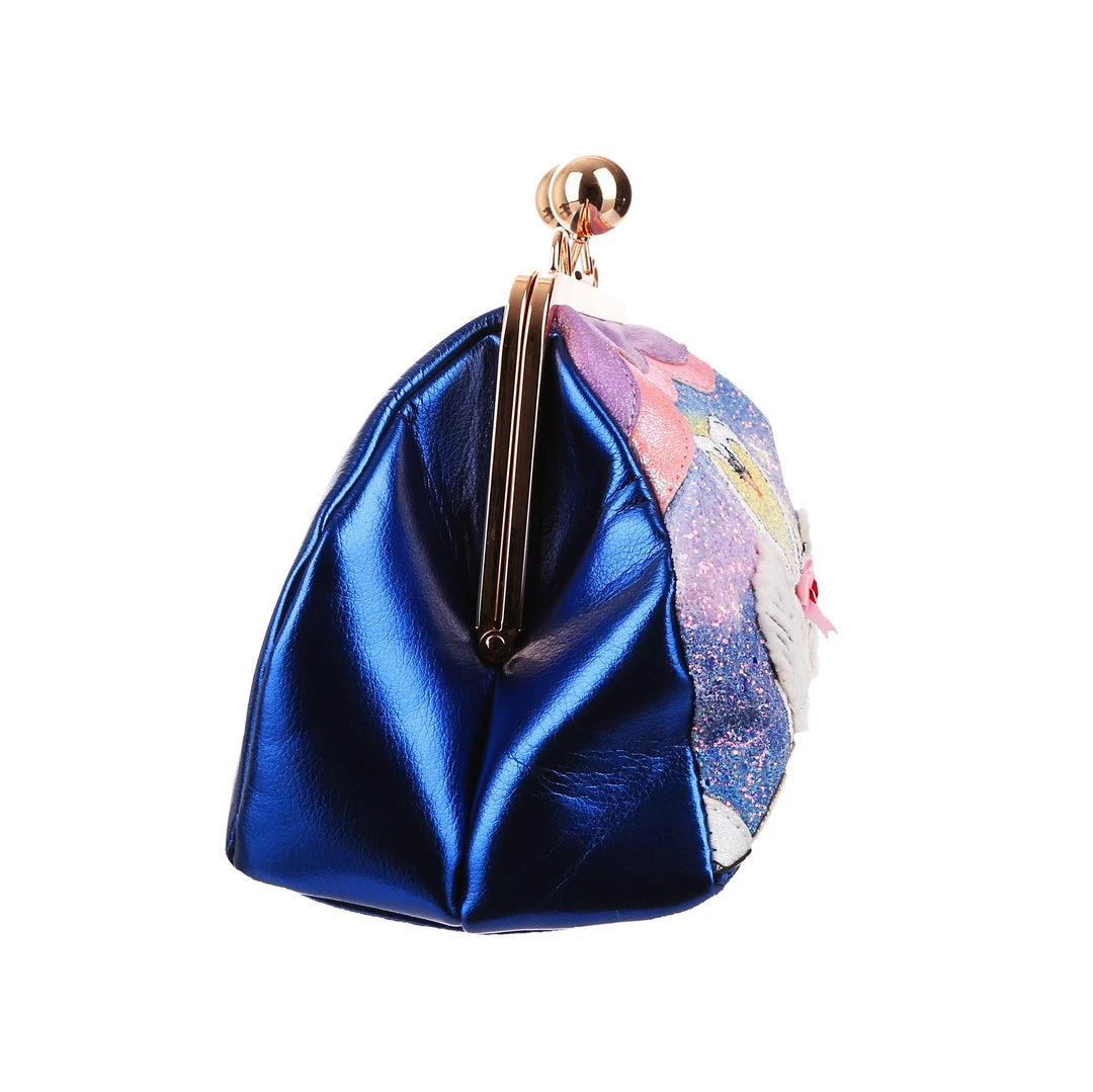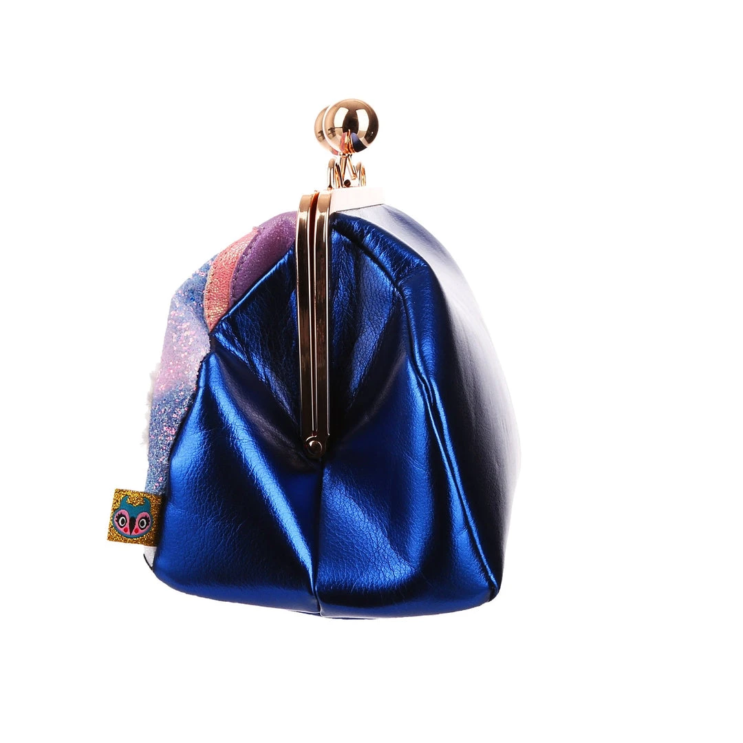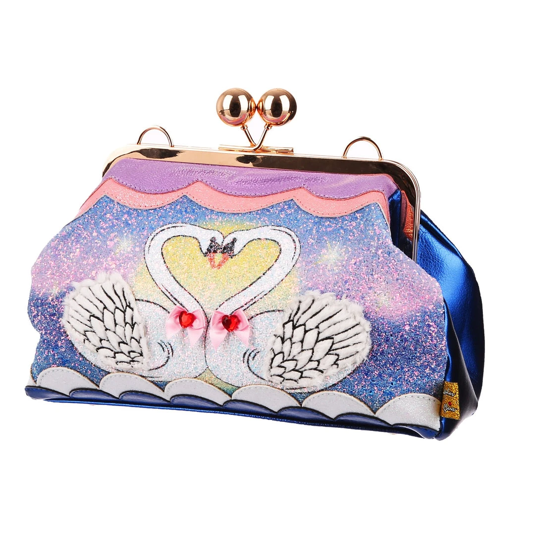 Float along with this stunning bag! This gold clasp top handbag is a serene dream, covered in sparkling glitter it depicts a pair of swans making a heart, with white fluffy wings and bow detailing, all surrounded with metallic scalloping. Finished with a deep metallic blue reverse and removable shoulder strap. Add to your collection and fall in love with it every day!