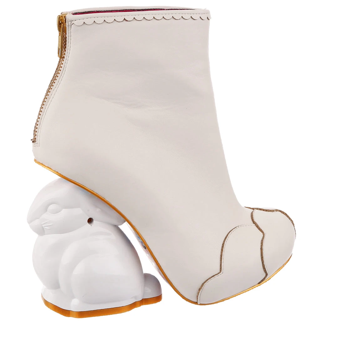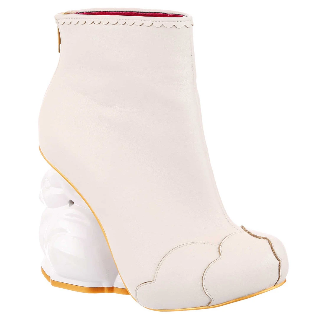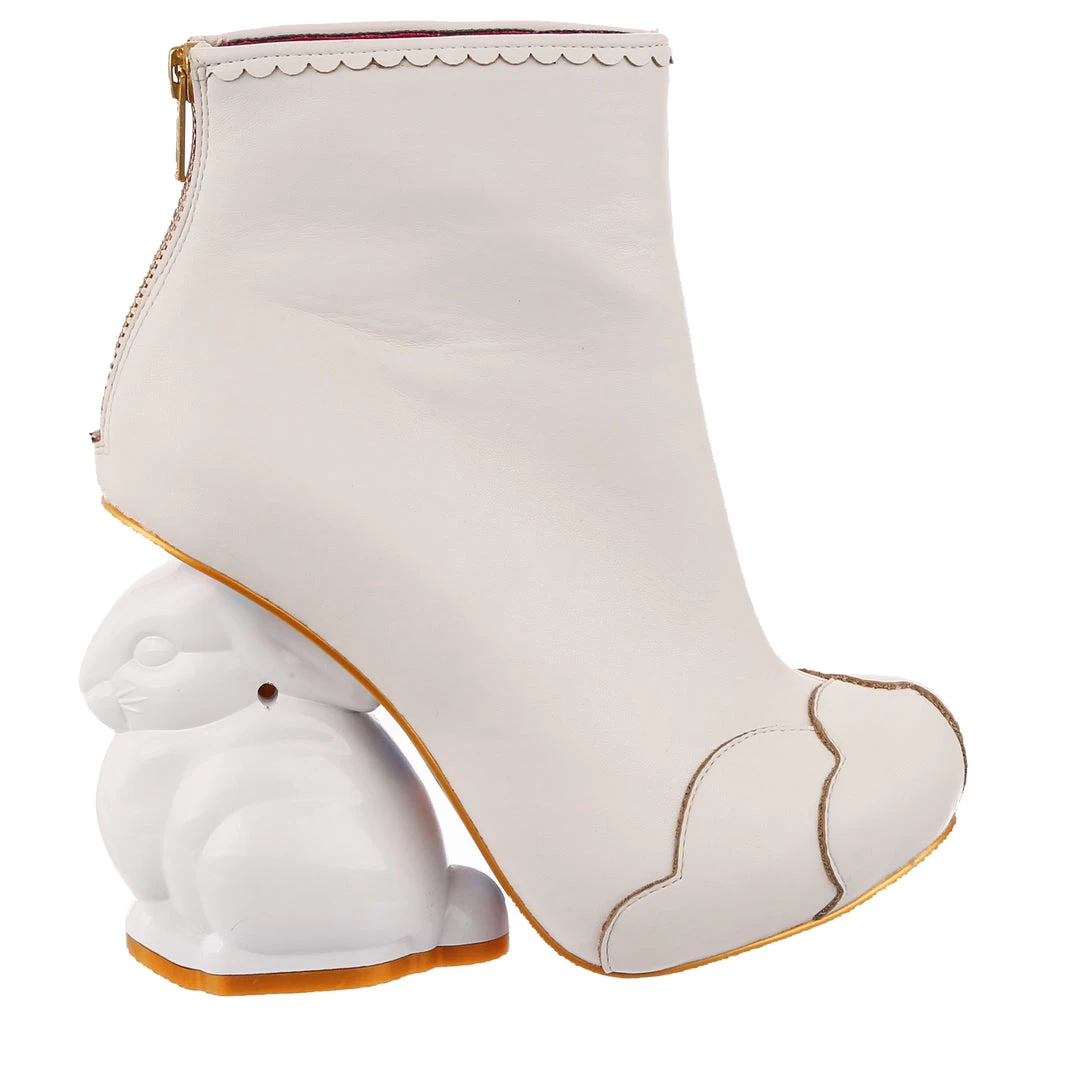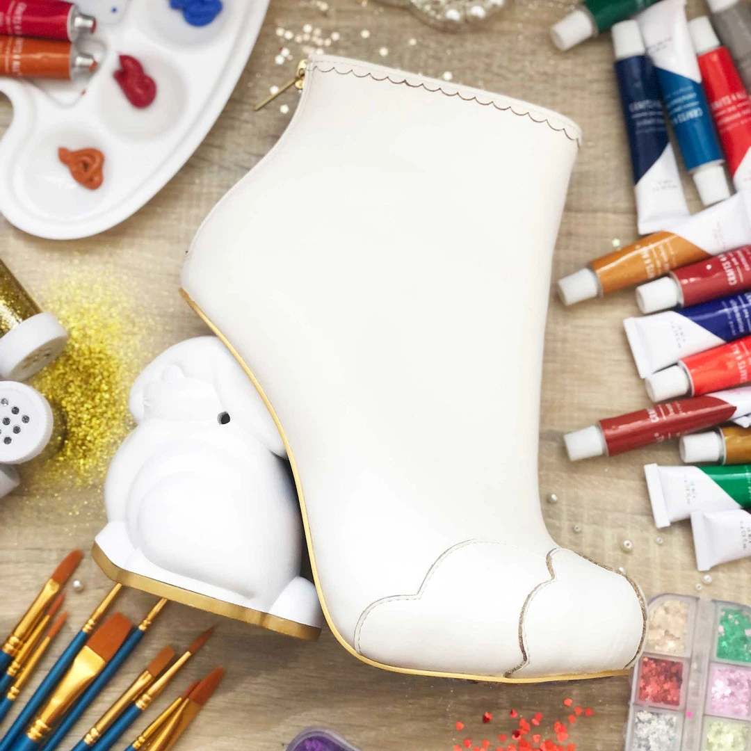 Get your paintbrush ready for these bunny boots! High heel ankle boots are left as a blank canvas for your creative designs, completed with a bunny heel, that has a hole ready for a bow of your choice! The zip fastening at heel makes these so easy to pop on and off. Finished with scallop detailing around the ankle and layered clouds on the toe, fulfil your bunny dreams with these fabulous boots today!