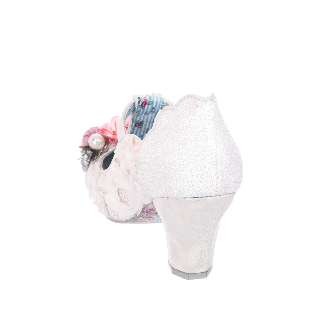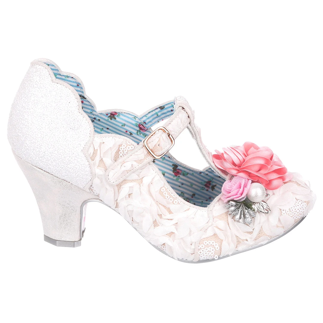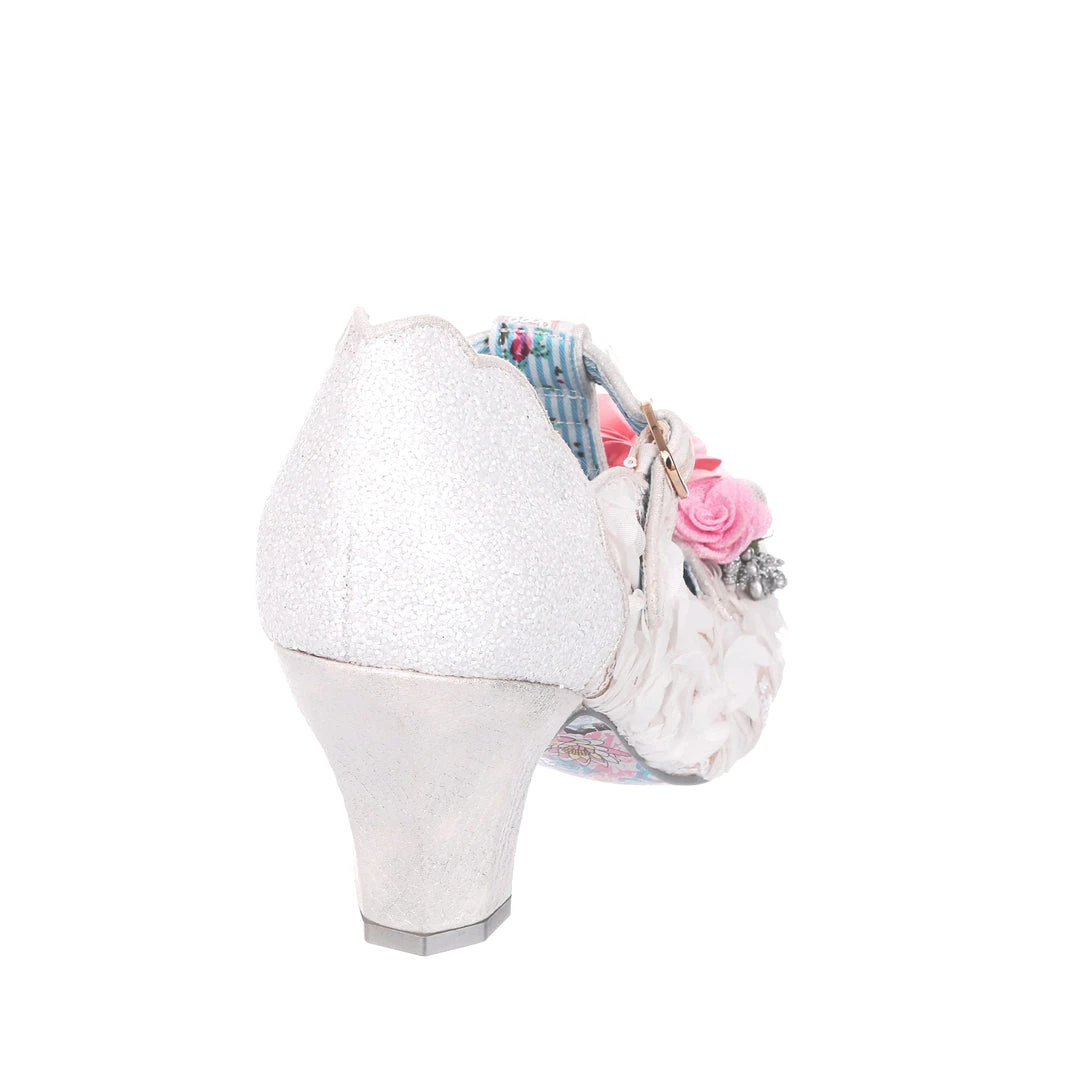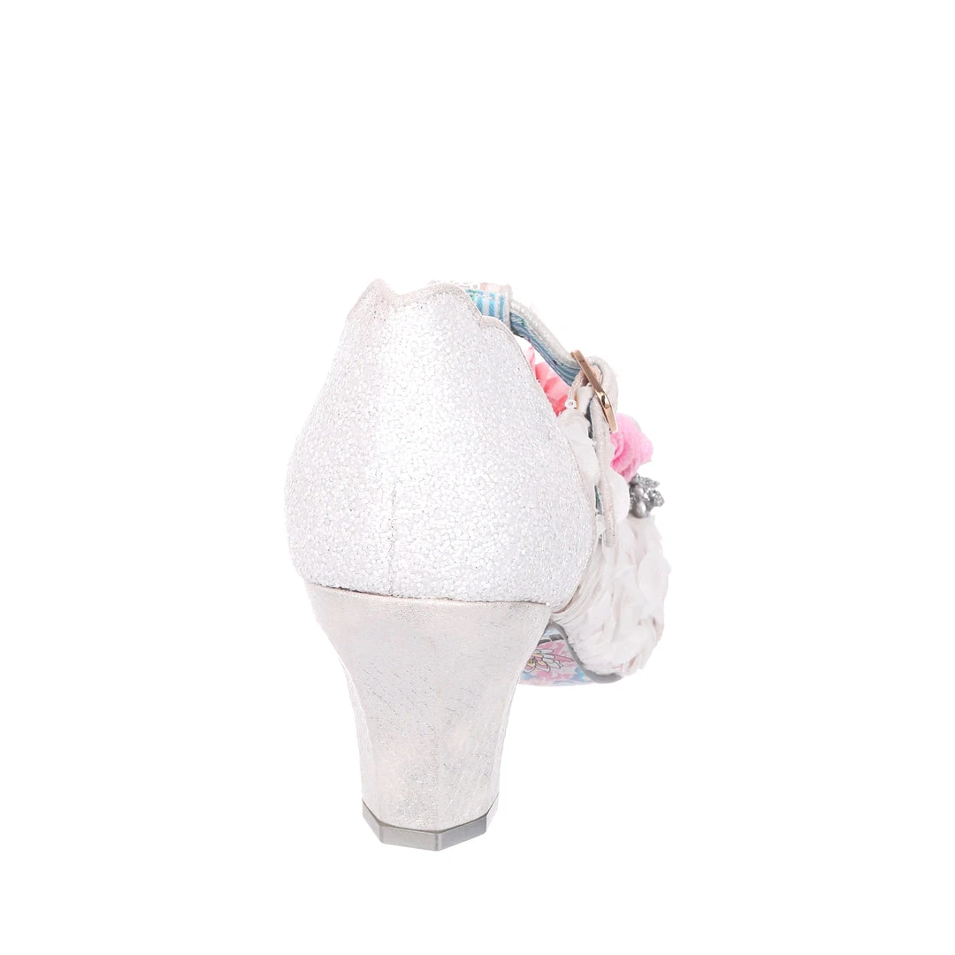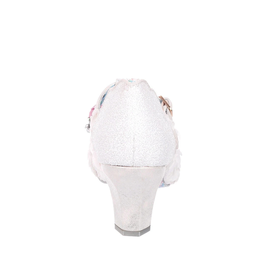 Add some glitz and glam to your toes! Beautiful white confetti and sequins cover a buff coloured base on these bridal mid heels, with a distressed iridescent faux snakeskin column heel. Fastened with a gold buckle on the t-bar, and finished with a posey of floral, pearl and trinket embellishments on the toe to add a touch of colour. Be your own decorations on your big day!