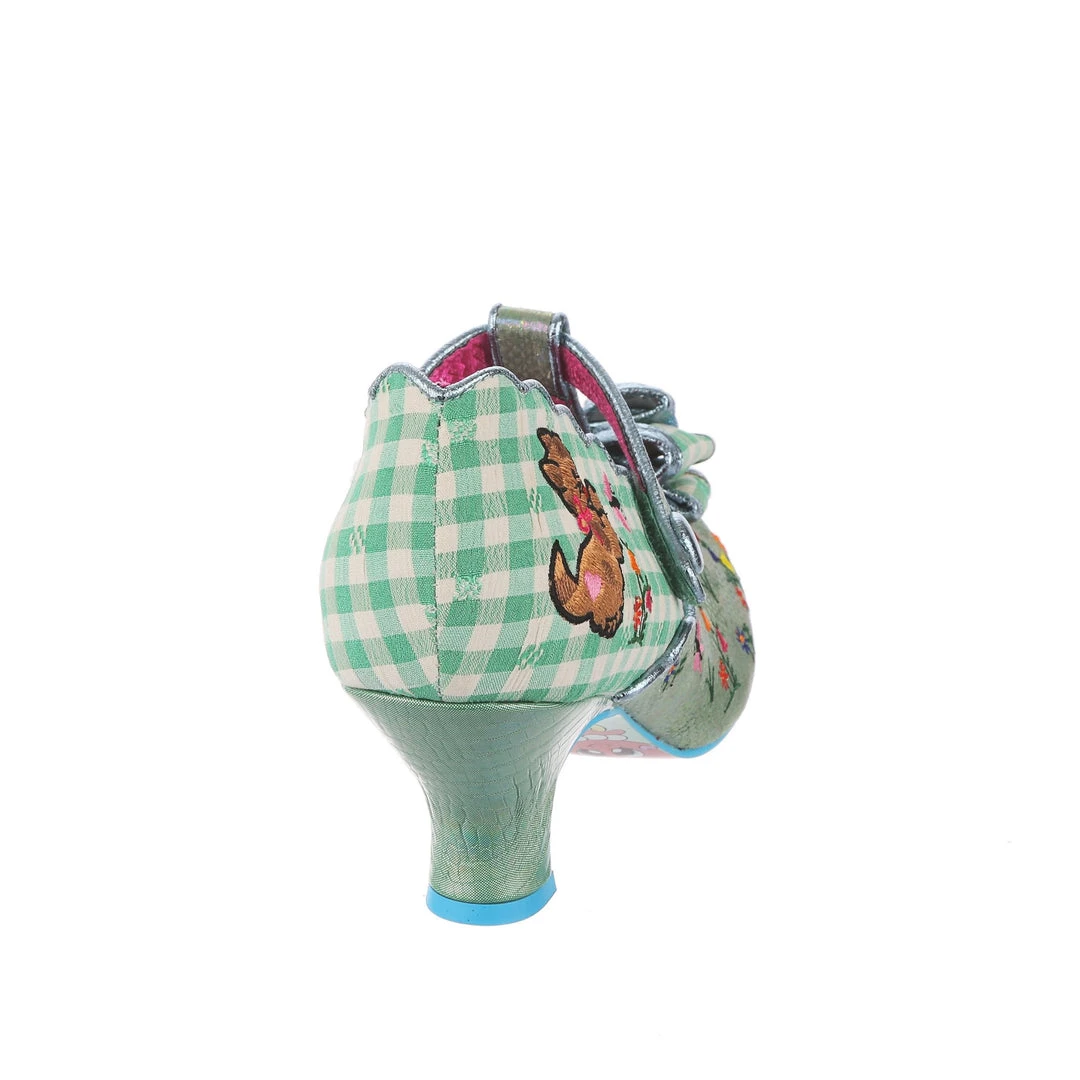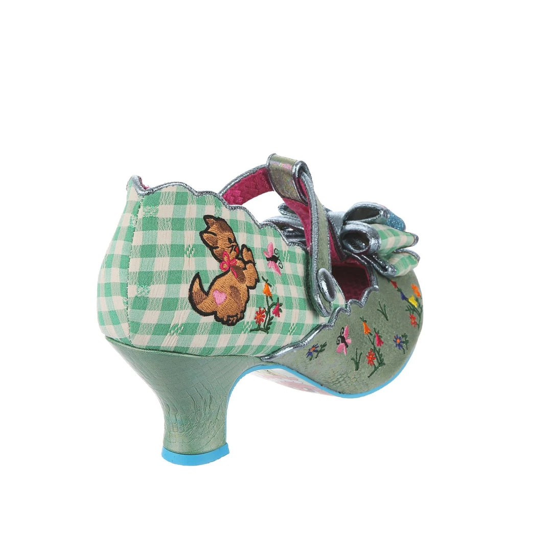 A whimsical wonder, these adorable mid heels are a little breath of fresh air for your wardrobe! A fabulous teal colour is embellished with tiny little embroidered posies, which is bordered by the scalloped edges with wrap around the whole shoe! A T-Bar strap leads to the most extravagant blue and green gingham bow on the toe, which ties into the matching piping and details all around the topline! Of course, we can’t forget to mention the darling little kitty and butterfly embroidered on the side too – simply purr-fect!