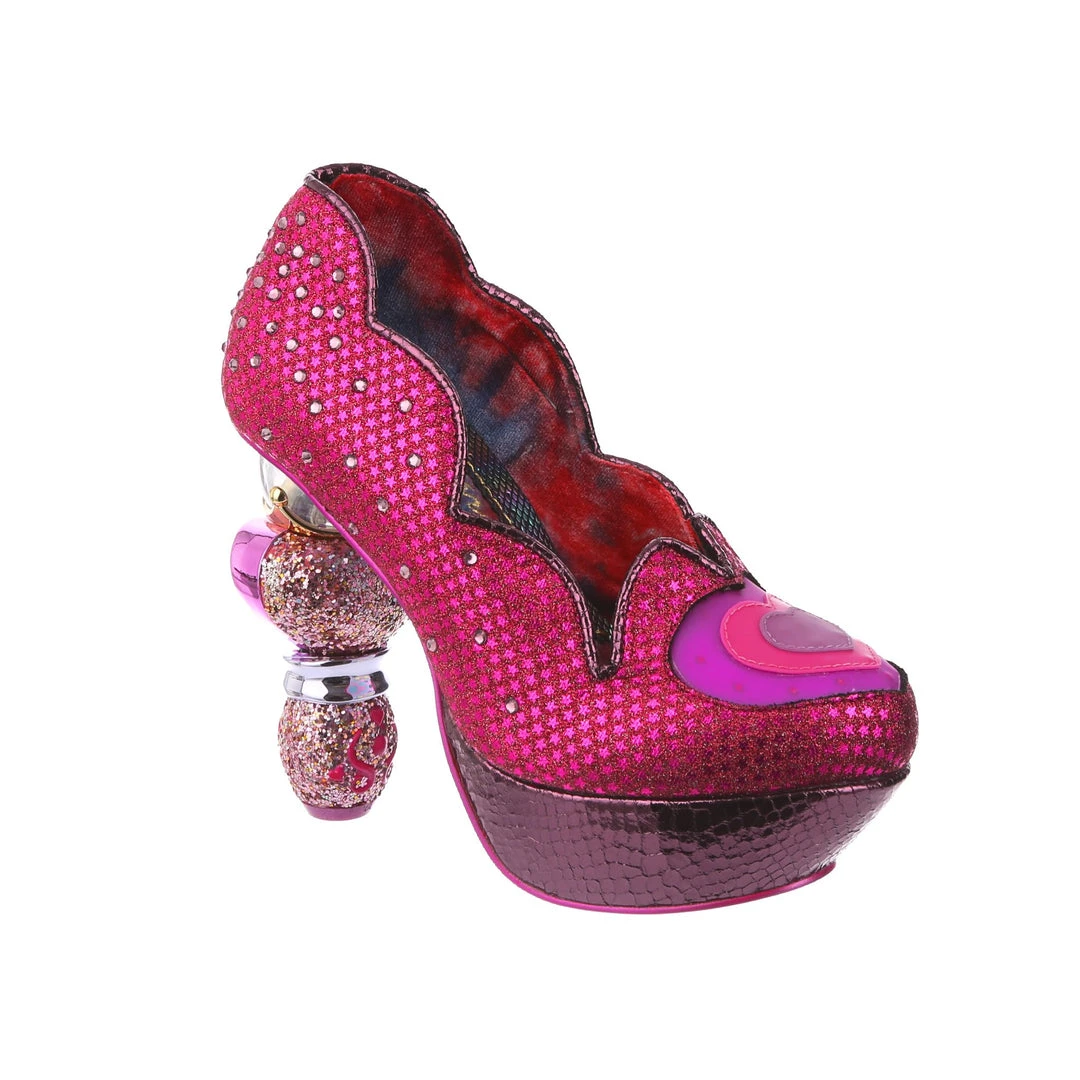 Light up your world with these enchanting heels! Featuring a heel shaped like a wand, these heels light up and play music – and not only that, the heart on the toe lights up too! In a striking hot pink metallic fabric, paired with purple accents and rhinestones, these scallop edged court shoes are sure to have you feeling like you can take on the world!