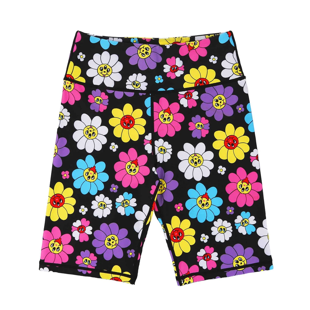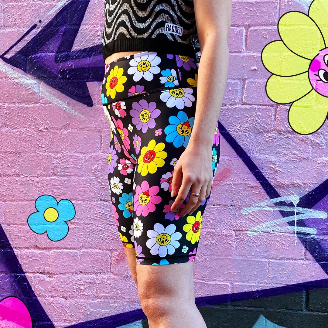 They love me, they love me not. Wear these bold evil daisy patterned cycling shorts whilst working out or chilling out, colourful flowers sit on a black base with matching black stitching. Soft to the touch, they are high waisted and sooo comfy! Get them today – but be careful, they may bite!