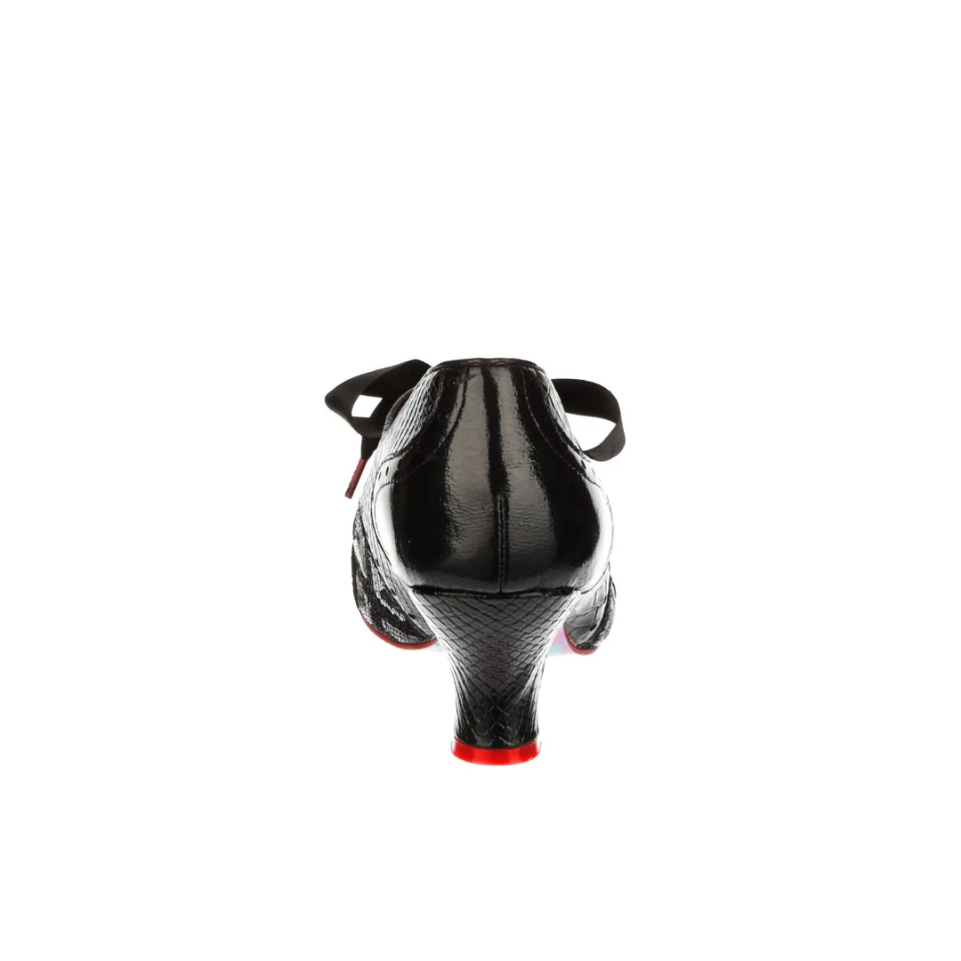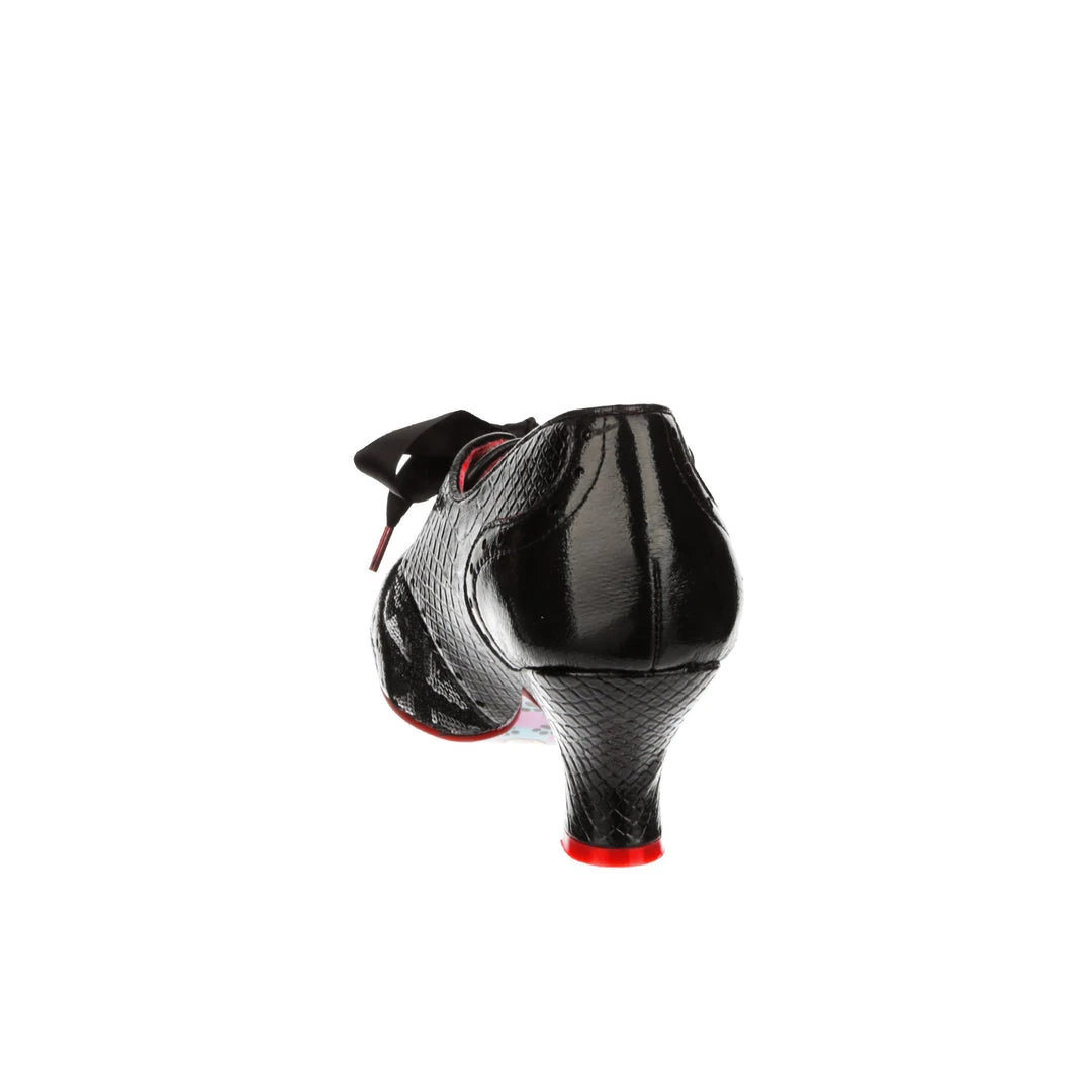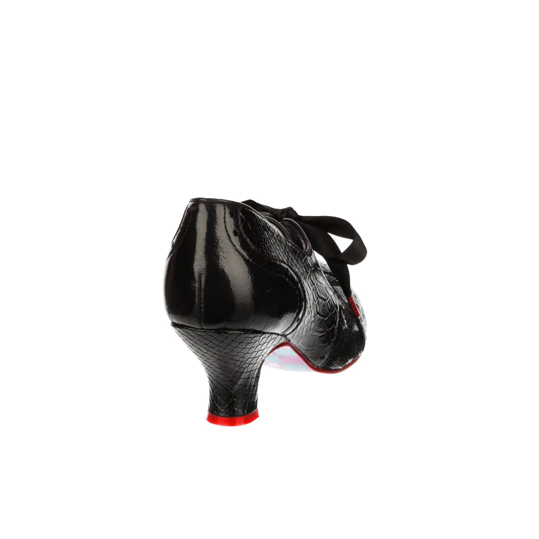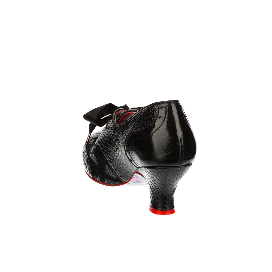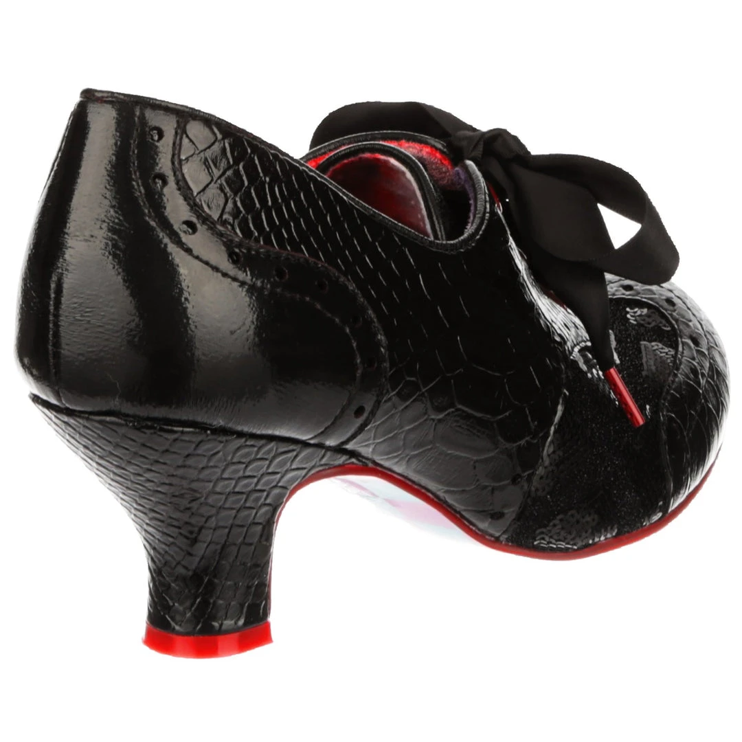 Have a Victorian adventure in these stunning lace ups! A low wearable heel is combined with elegant black tones of metallic, snake print and sequins. A perfect mix of textures, topped off with a contrasting red edged sole and heel, black ribbon laces and red eyelets! Perfect to give any preppy look just a little extra boost!