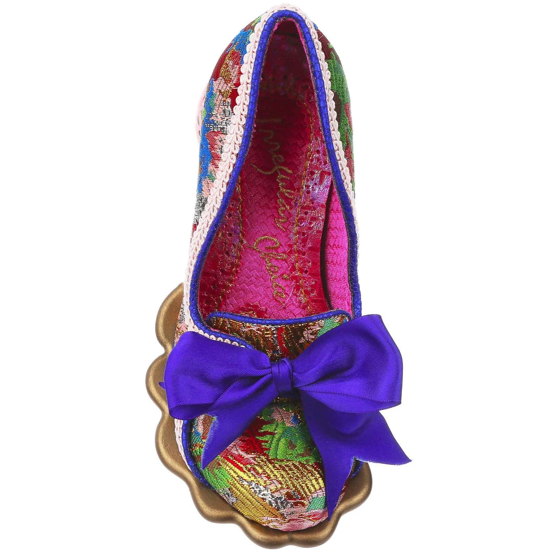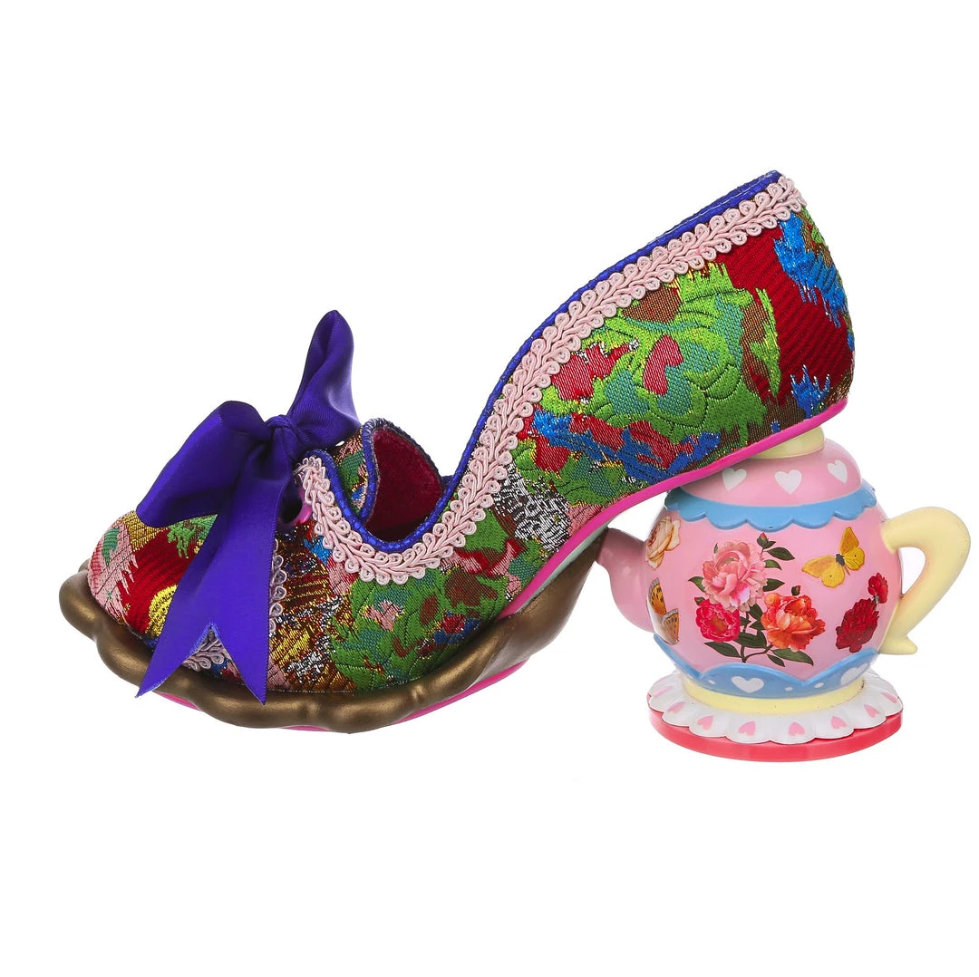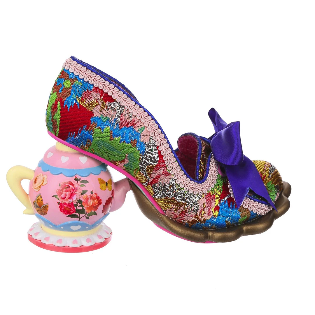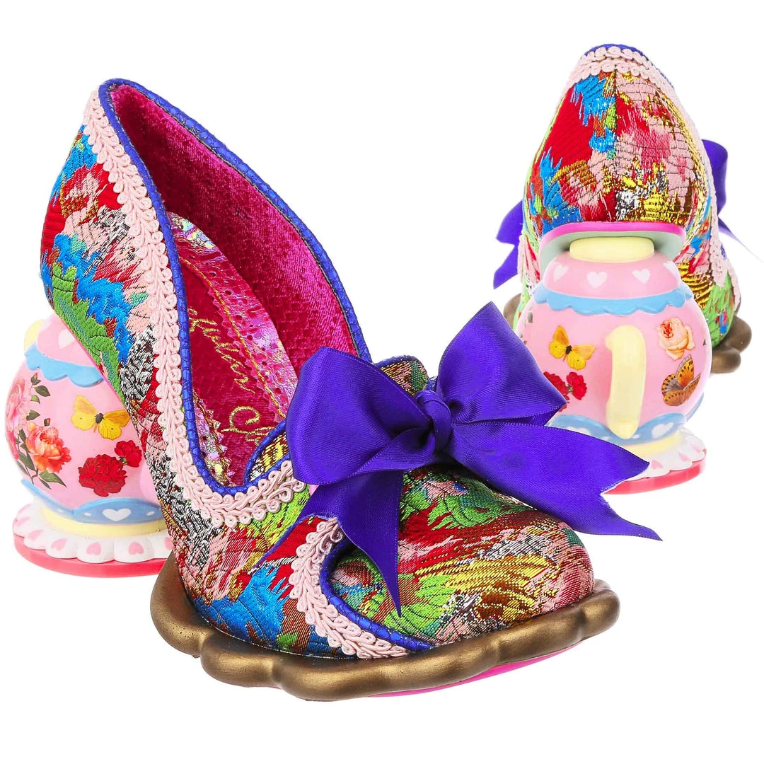 Looking for something to show that you really, really love tea? Come take a seat and have a cup! These magical blue, pink and gold brocade court shoes are adorned with a gorgeous cobalt blue satin ribbon tied in a bow on the toe, and accented by the incredible teapot heel! Spilling out a metallic brown tea splash shaped sole, this character heel includes stunning floral detailing on the pink body of the teapot and even a little yellow handle! Whimsical, wonderful and wants to come home with you!