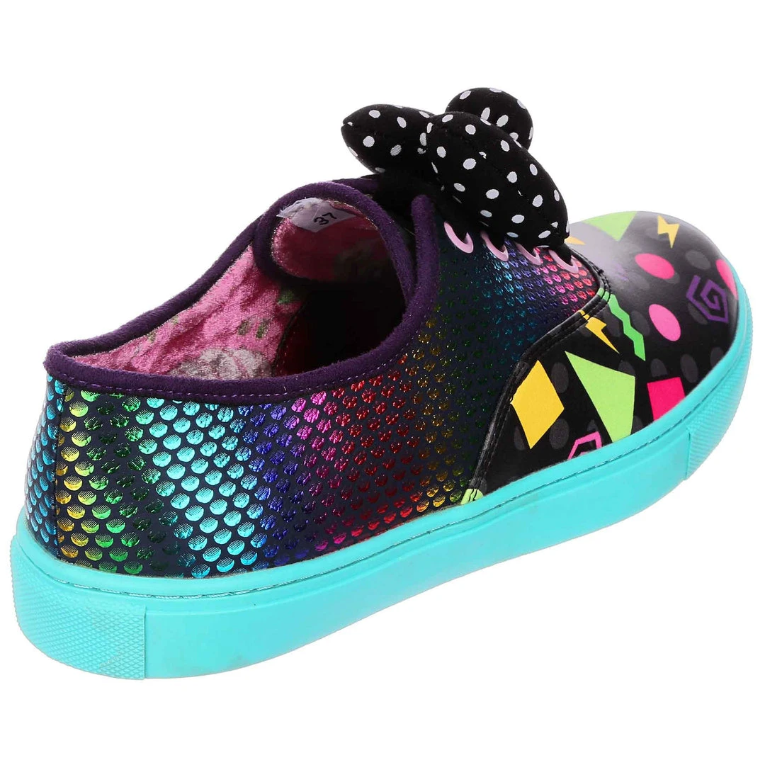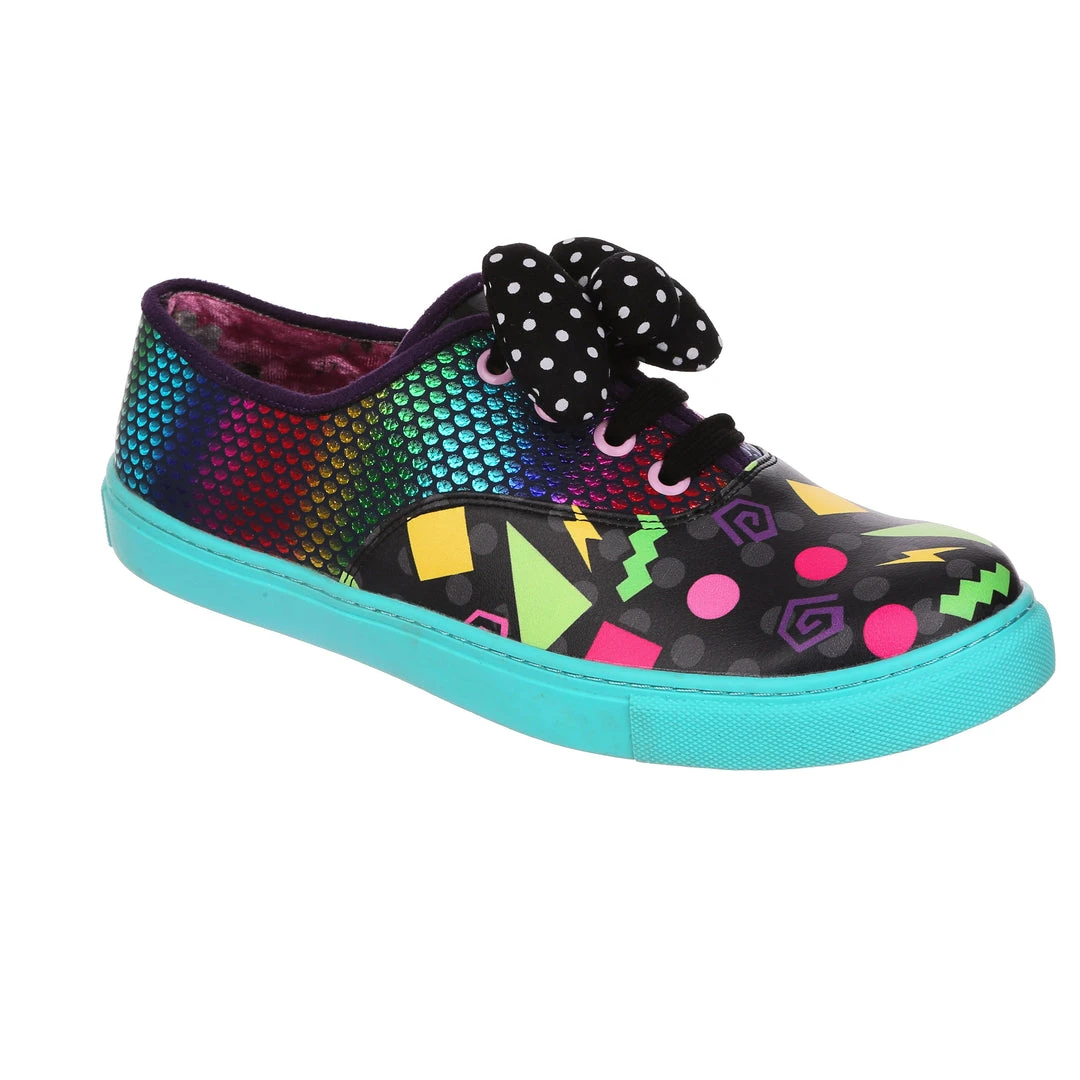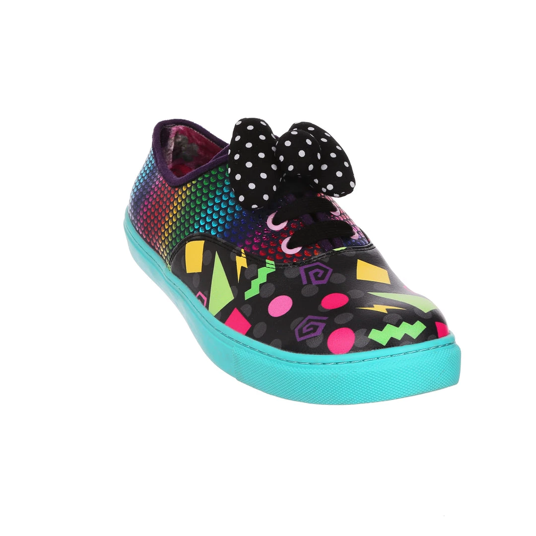 Feel fresh in these jazzy trainers! Stunning sparkly rainbow reptile scales are matched with a colourful 90’s style abstract pattern and with a bright teal sole that really pops! Fastened with black laces and topped with a padded black and white polka dot bow. These trainers would be a totally rad addition to your wardrobe!