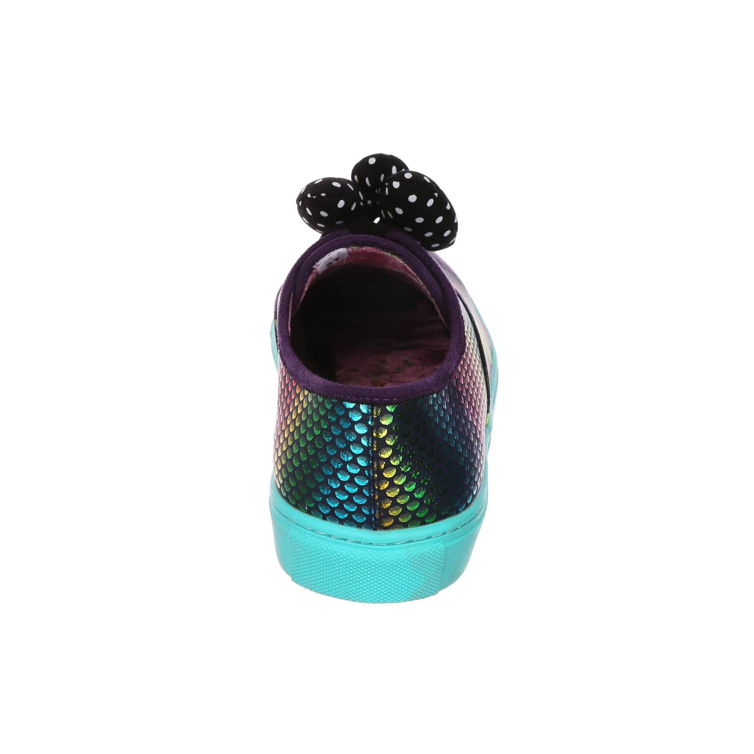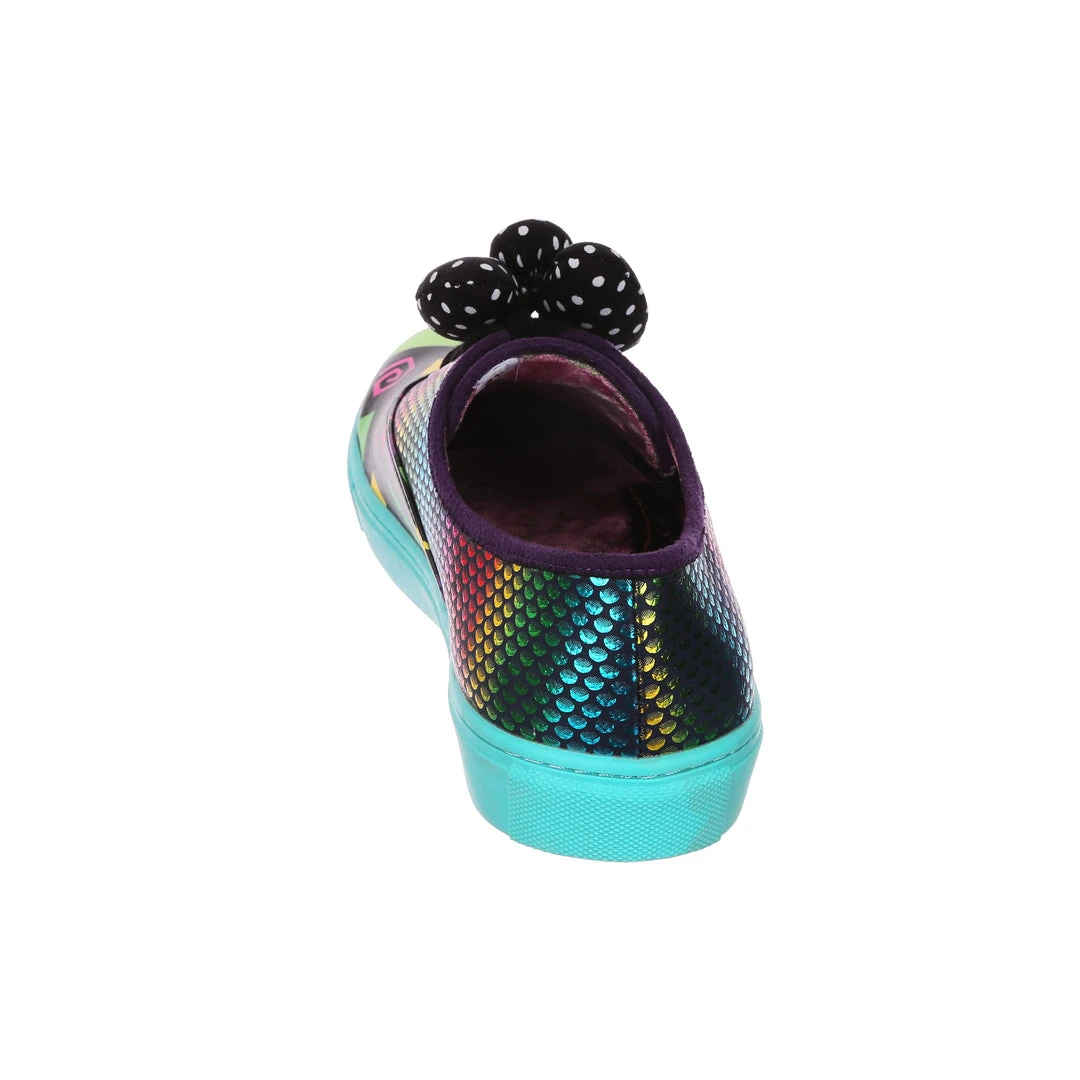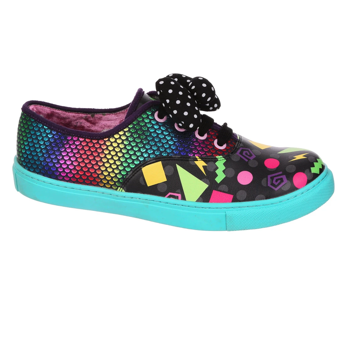 Feel fresh in these jazzy trainers! Stunning sparkly rainbow reptile scales are matched with a colourful 90’s style abstract pattern and with a bright teal sole that really pops! Fastened with black laces and topped with a padded black and white polka dot bow. These trainers would be a totally rad addition to your wardrobe!